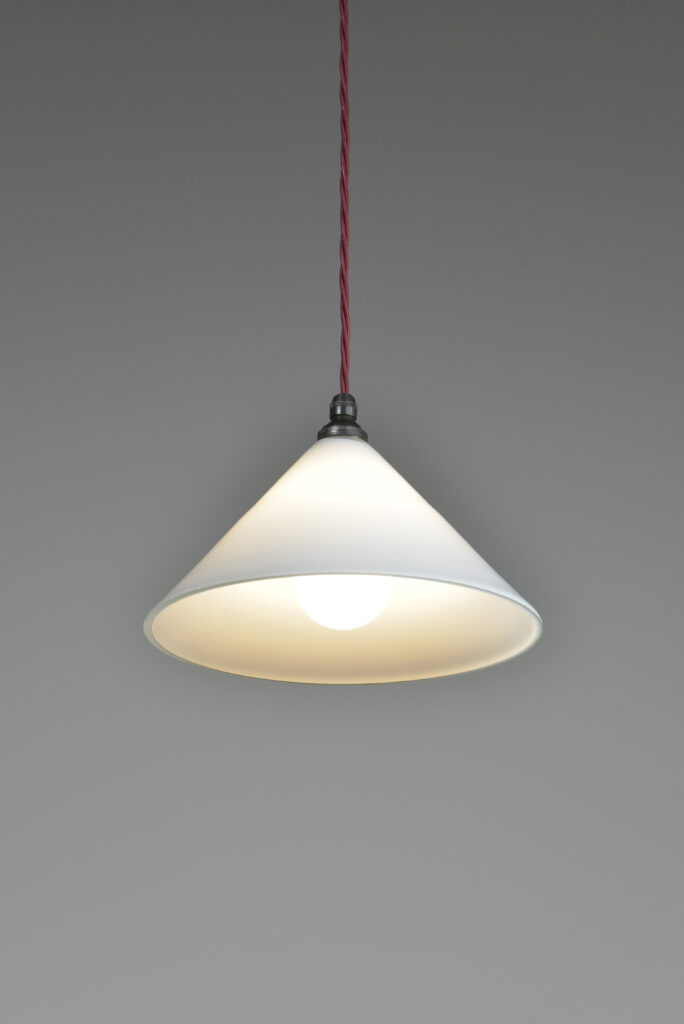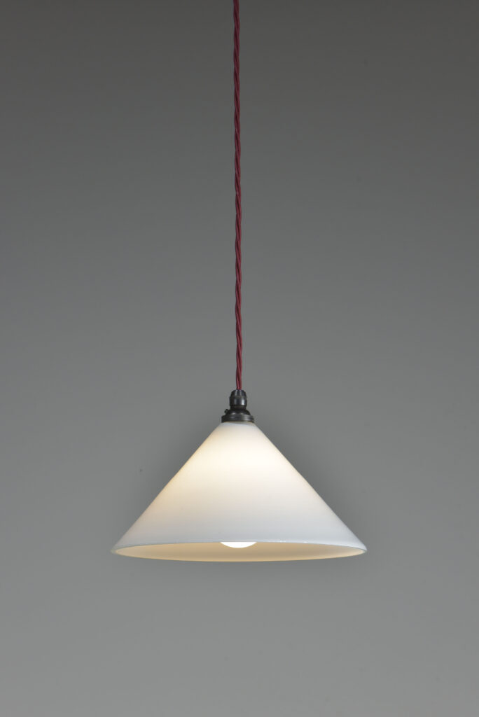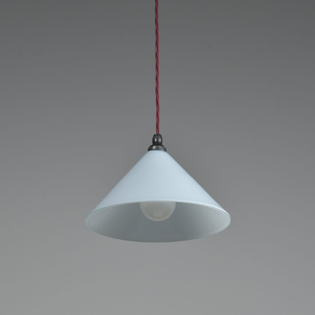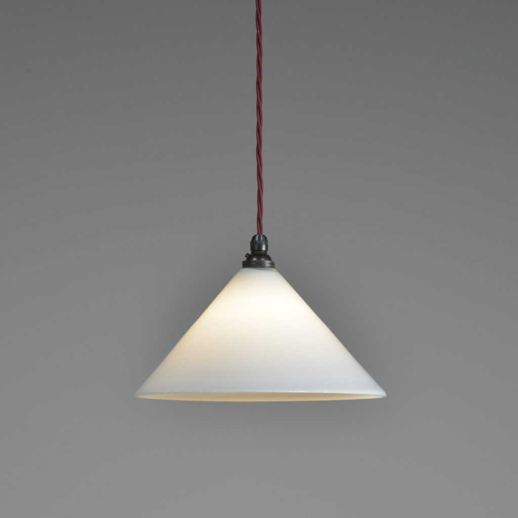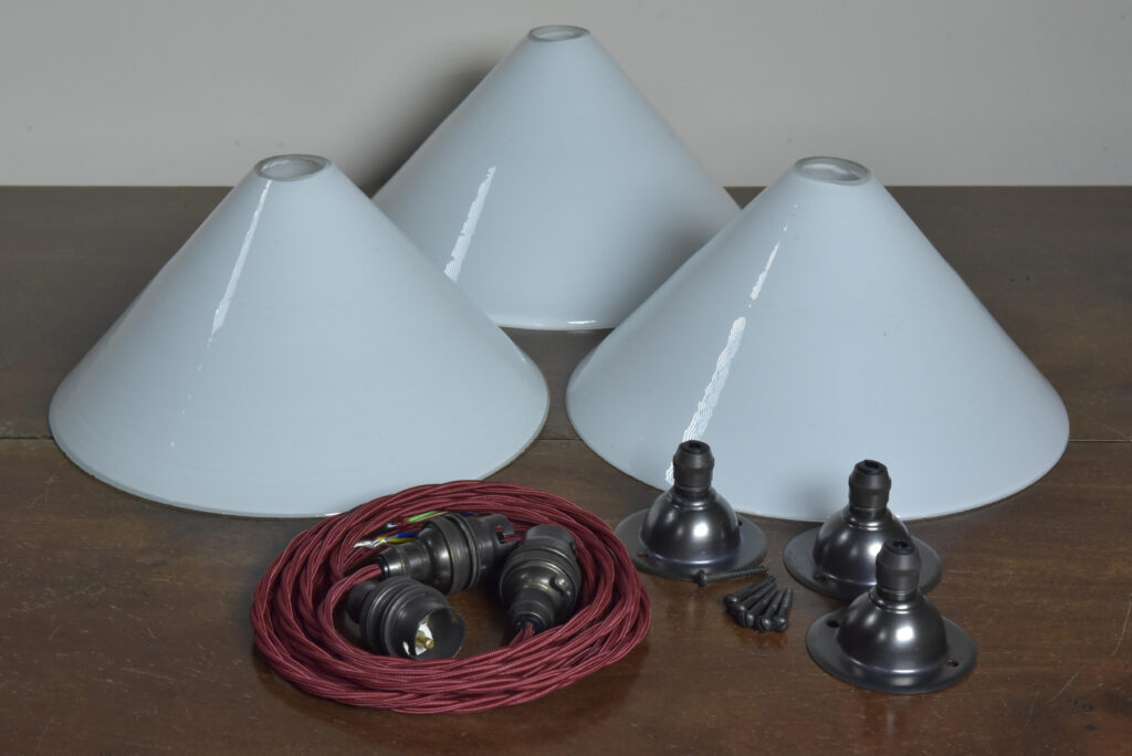 A vintage trio of conical coolie shades with all fittings (see pics). Each wired with 1.5m bergundy fabric flex / bronzed brass cordgrip lampholders. Come with bronzed brass cordgrip/ceiling plates (with earths and supplied with vintage slotted screws) Dimensions in inches/cms; 9.5″/24cm diameter. 6″/15cm tall inc. loop. 0.9kg each. Sold as a set of three.