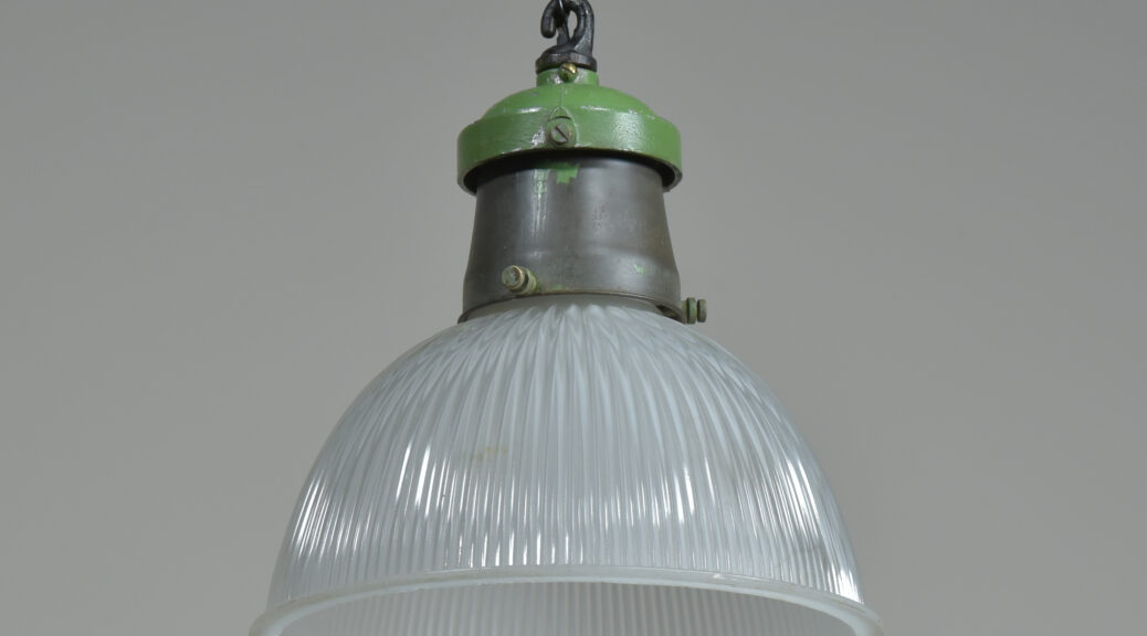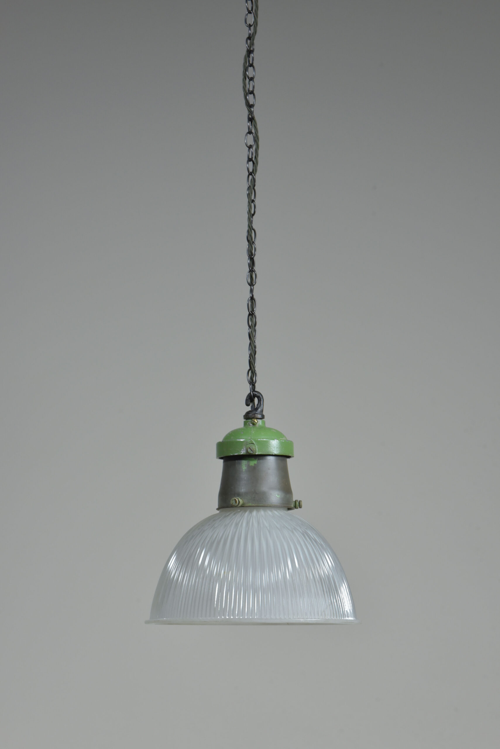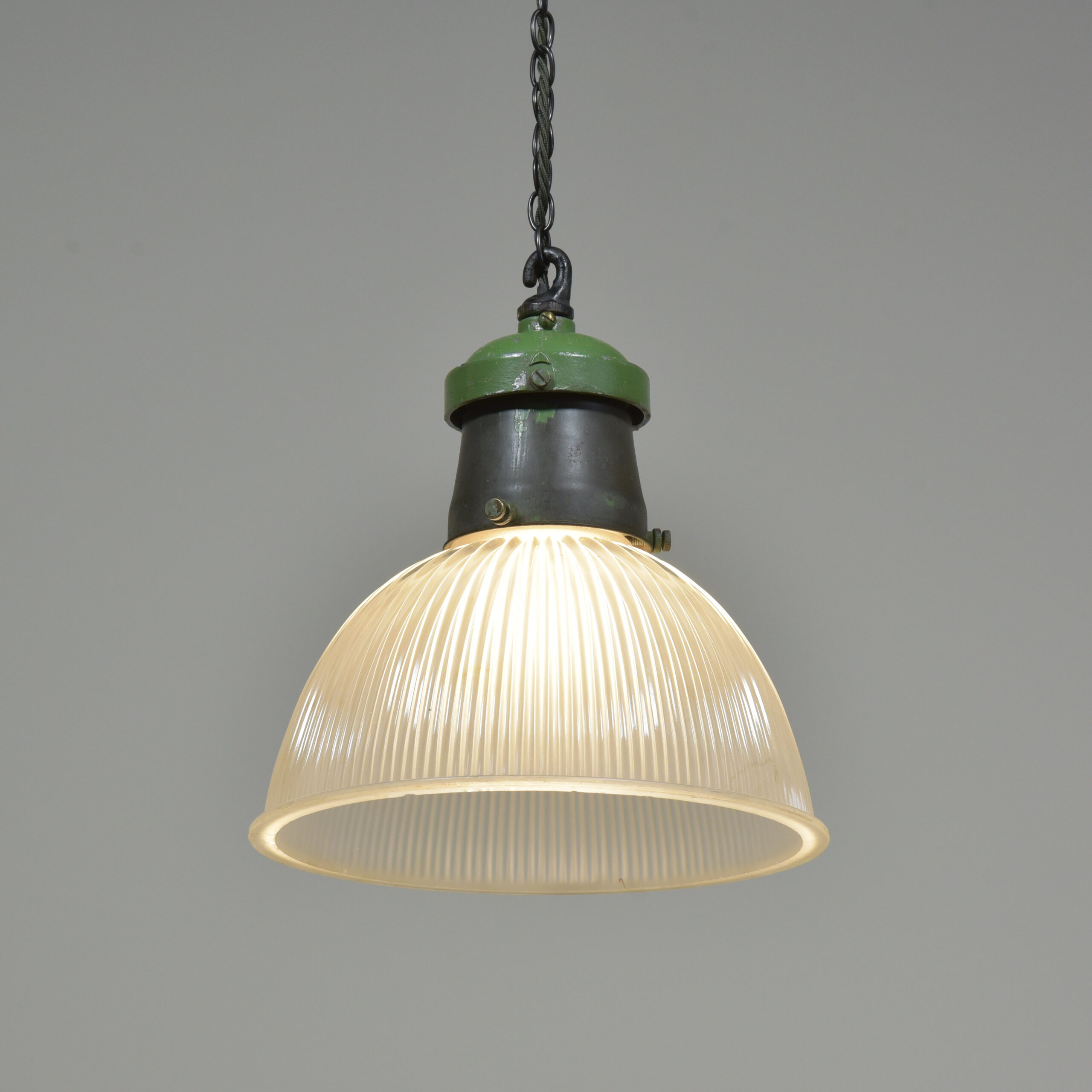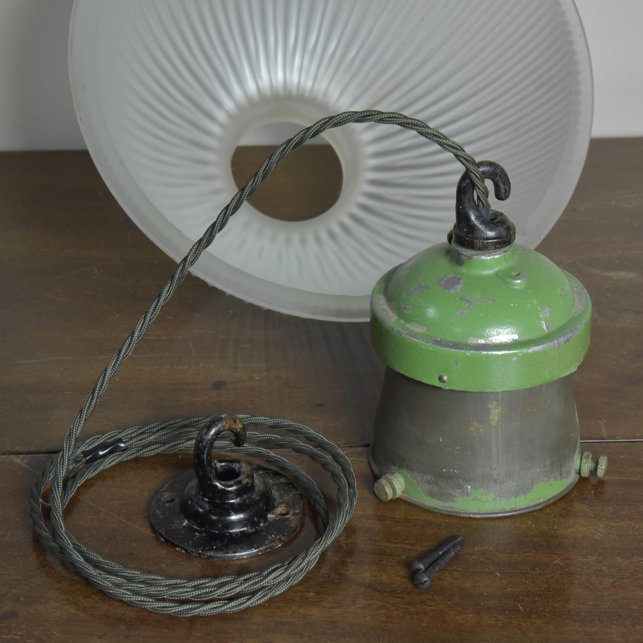 An etched prismatic crisply moulded glass shade with it’s original cast aluminium / spun steel gallery and hook . English approx 1930s. The glass and gallery marked Holophane. The glass cleaned, gallery taken apart and rubbed up retaining the original green paint and double waxed. Rewired with 1.5m fabric flex, original porcelain ES lampholder (perfect condition). Supplied with 1meter black jack chain (galvanised if preferred), original hooked ceiling plate (including vintage slotted roundhead black japanned screws). Dimensions in inches/cms; 10.25″/26cm diameter. 11″/28cm tall inc. hook (shade only is 6″/15cm tall). 2.25kg. Please note i have some more similar light fittings including ones with “turquoise” shades.