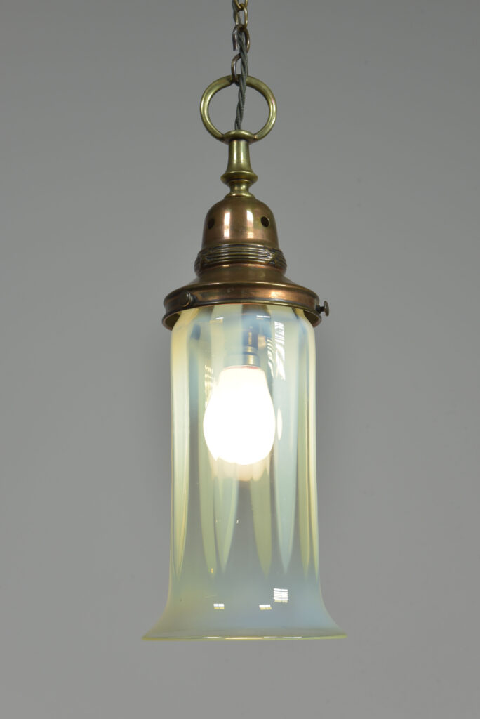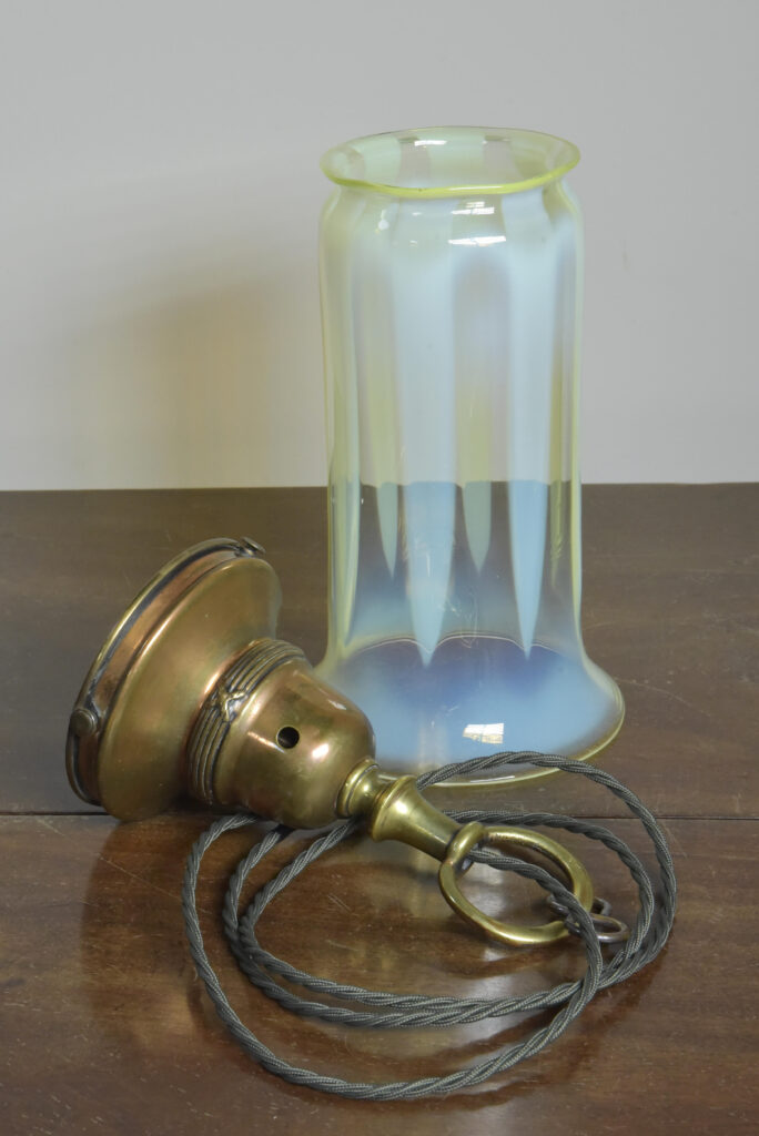 A large antique vaseline shade pendant light with original brass looped gallery. English, early 20th century. Mint condition. Cleaned, rewired with 1.5m fabric flex and new patinated BC lampholder (positioned for perfect bulb placement). Dimensions in inches/cms; 5.5″/14cm diameter. 16″/41cm tall inc. loop (shade only is 9.5″/23.5cm tall). 0.8kg. Click photos to enlarge…