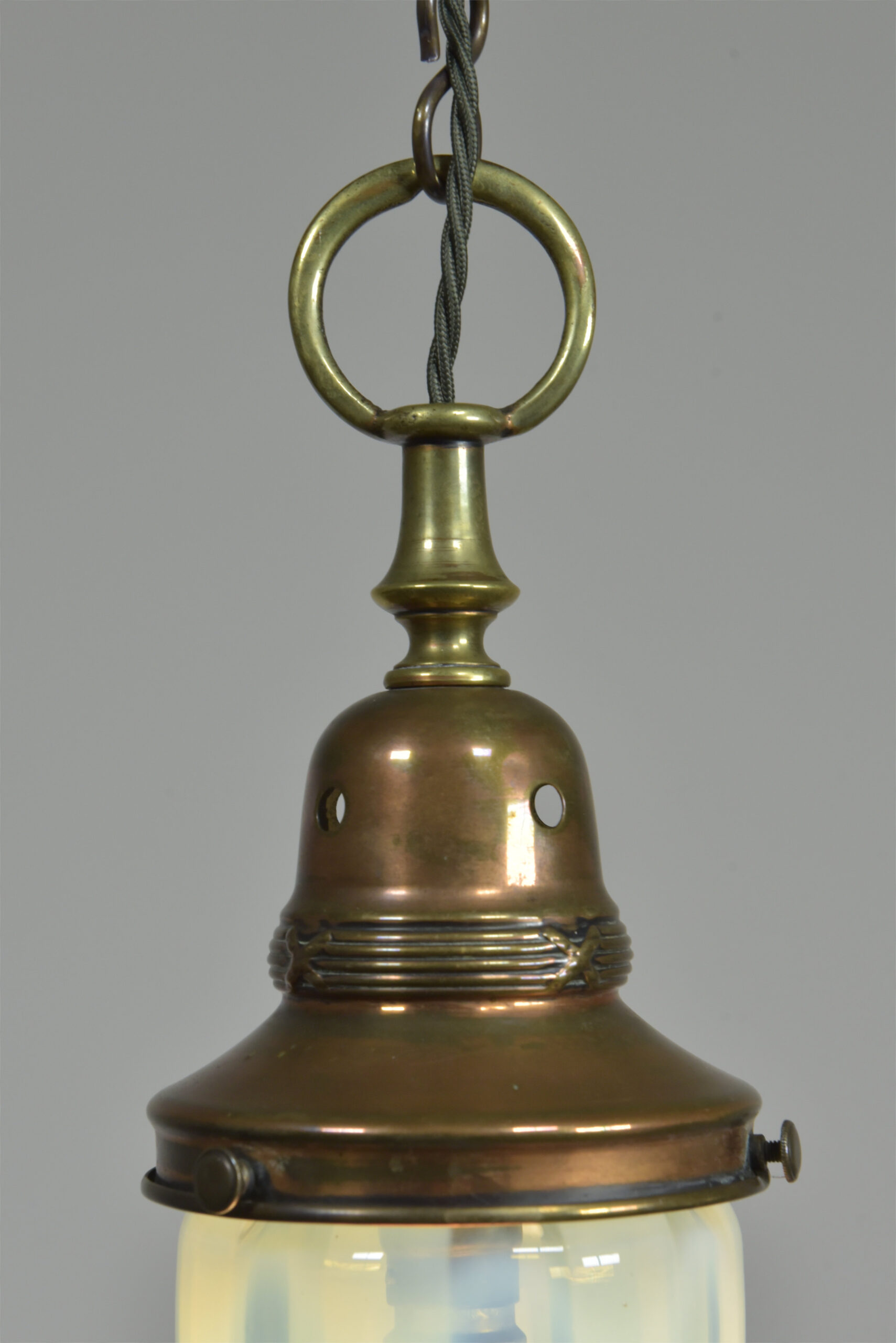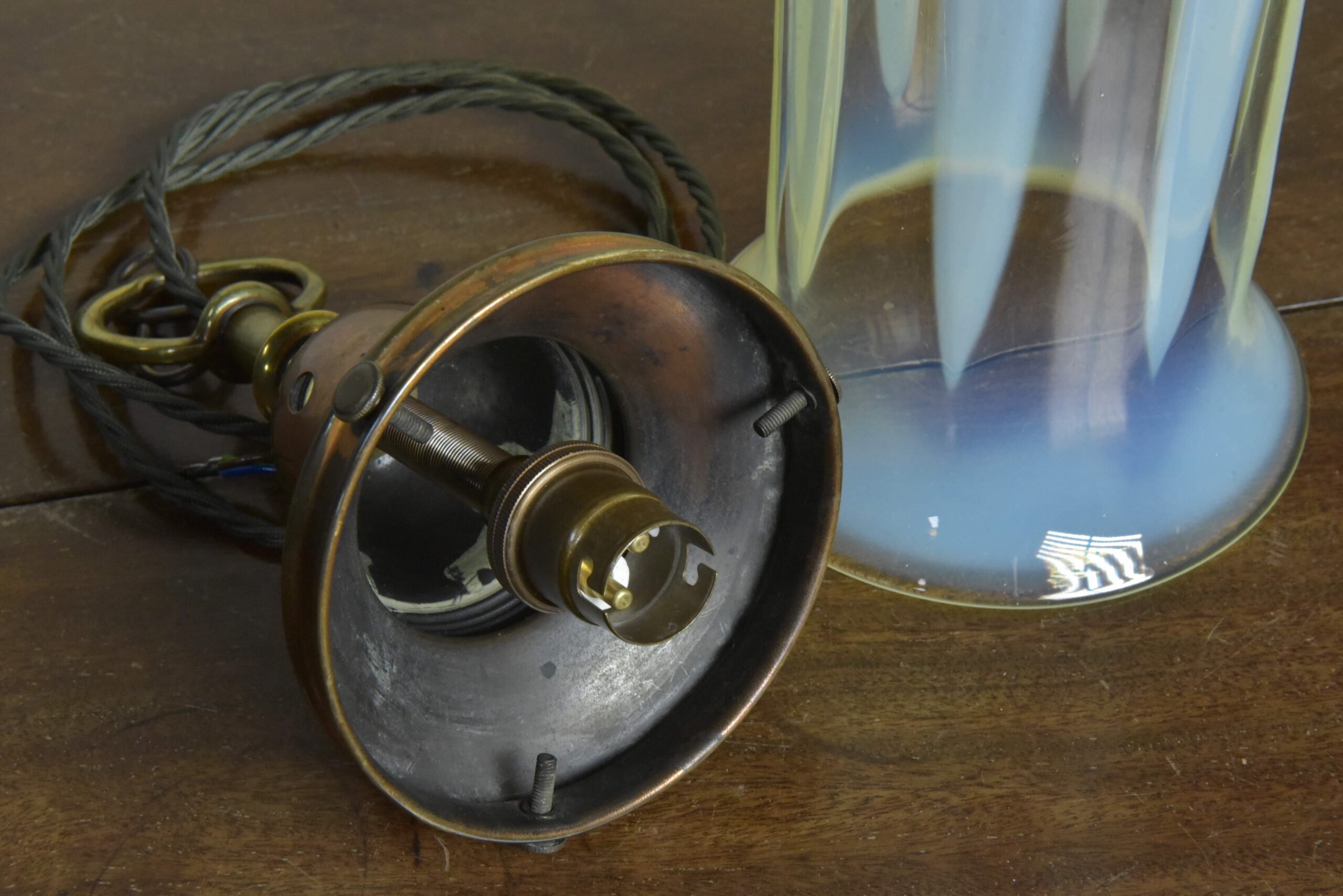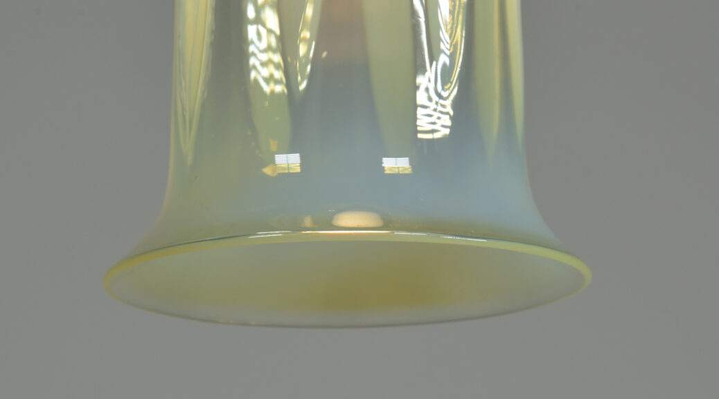 A large antique vaseline shade pendant light with original brass looped gallery. English, early 20th century. Mint condition. Cleaned, rewired with 1.5m fabric flex and new patinated BC lampholder (positioned for perfect bulb placement). Dimensions in inches/cms; 5.5″/14cm diameter. 16″/41cm tall inc. loop (shade only is 9.5″/23.5cm tall). 0.8kg. Click photos to enlarge…