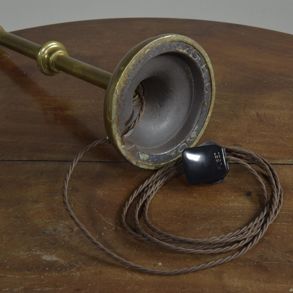 An antique knopped patinated brass shaft and circular base table lamp by GEC. English. Approx 1930s. In excellent condition. One of several of this model in stock (with very slight differences). Plain brass tube, cast decorative ferrules, spun brass circular base (cast iron weighted). Cleaned and waxed. Rewired with 3m fabric flex, patinated brass safety-switched lampholder and traditional plug. Pat tested. Dimensions in inches/cms; 19/48.5cm cm tall inc. lampholder. 6.25″/16cm diameter base. 2.52kg weight. Click photos to enlarge…