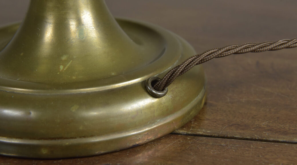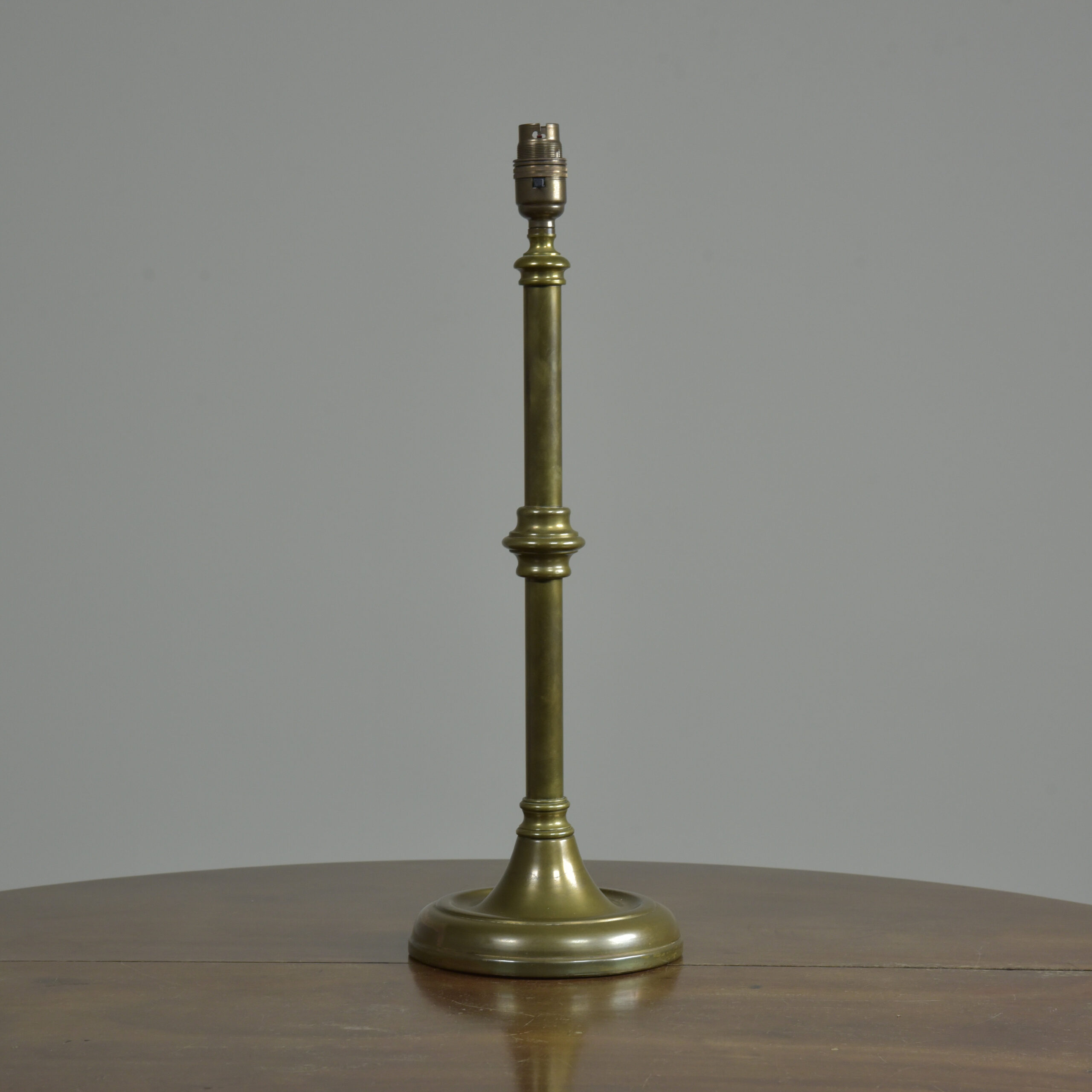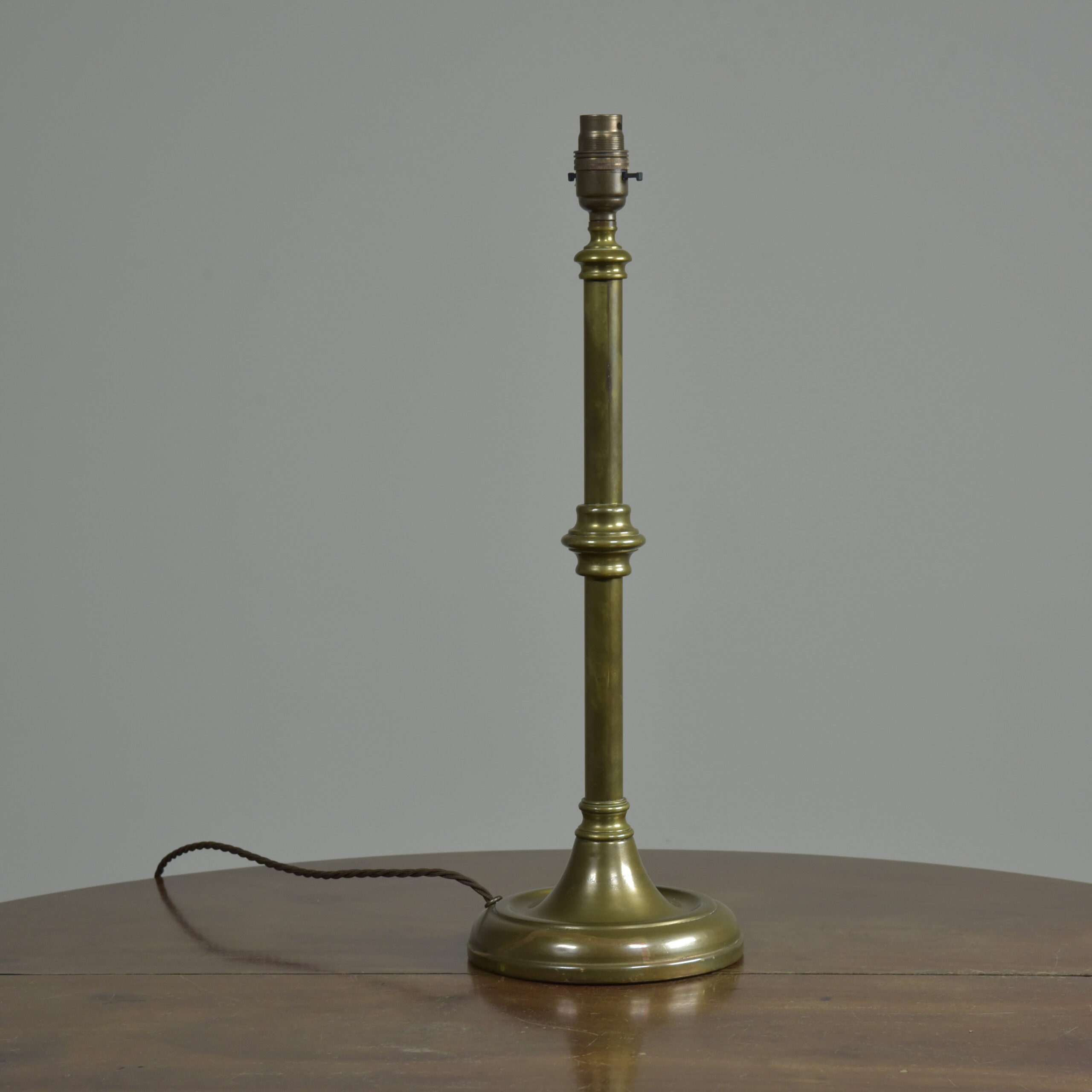 An antique knopped patinated brass shaft and circular base table lamp by GEC. English. Approx 1930s. In excellent condition. One of several of this model in stock (with very slight differences). Plain brass tube, cast decorative ferrules, spun brass circular base (cast iron weighted). Cleaned and waxed. Rewired with 3m fabric flex, patinated brass safety-switched lampholder and traditional plug. Pat tested. Dimensions in inches/cms; 19/48.5cm cm tall inc. lampholder. 6.25″/16cm diameter base. 2.52kg weight. Click photos to enlarge…