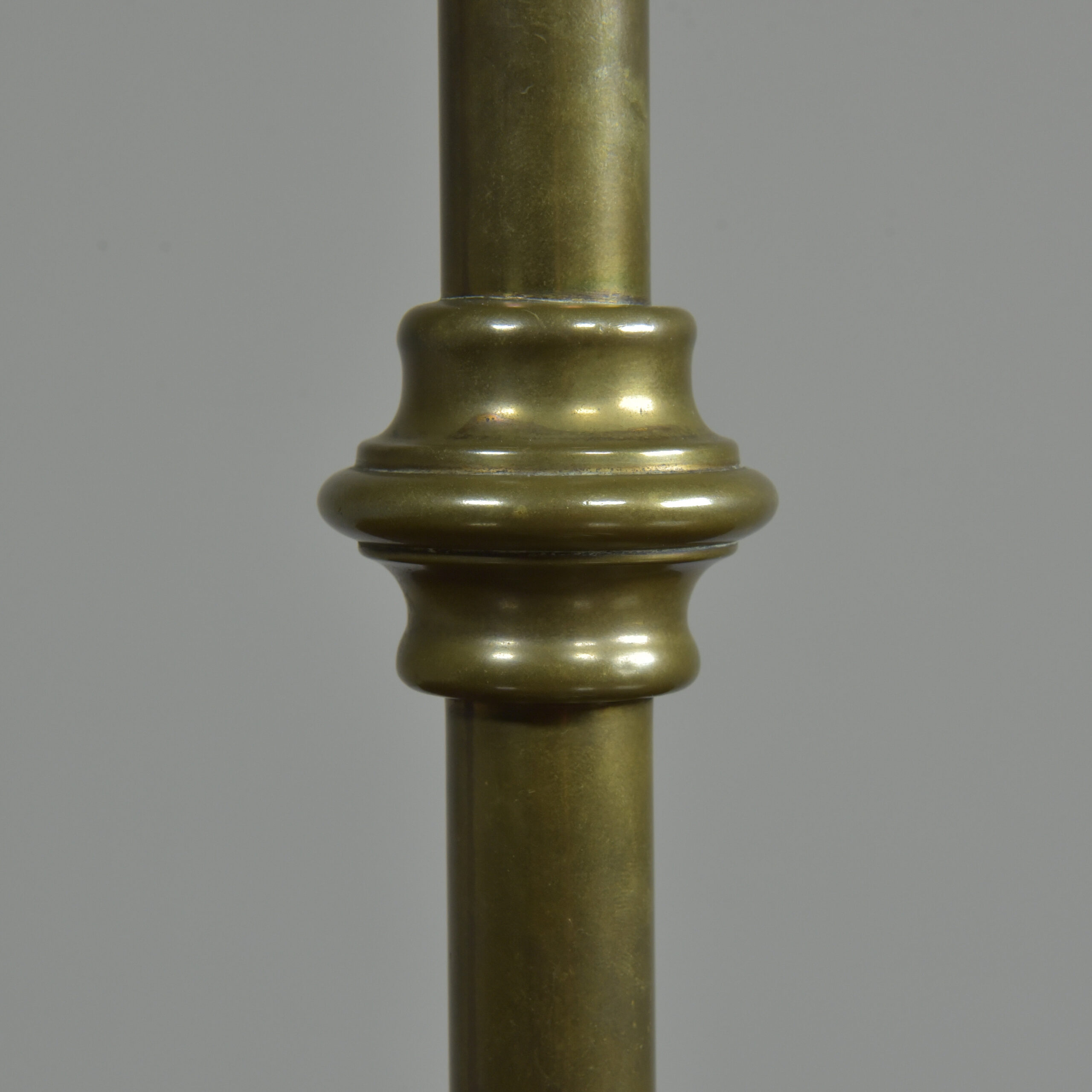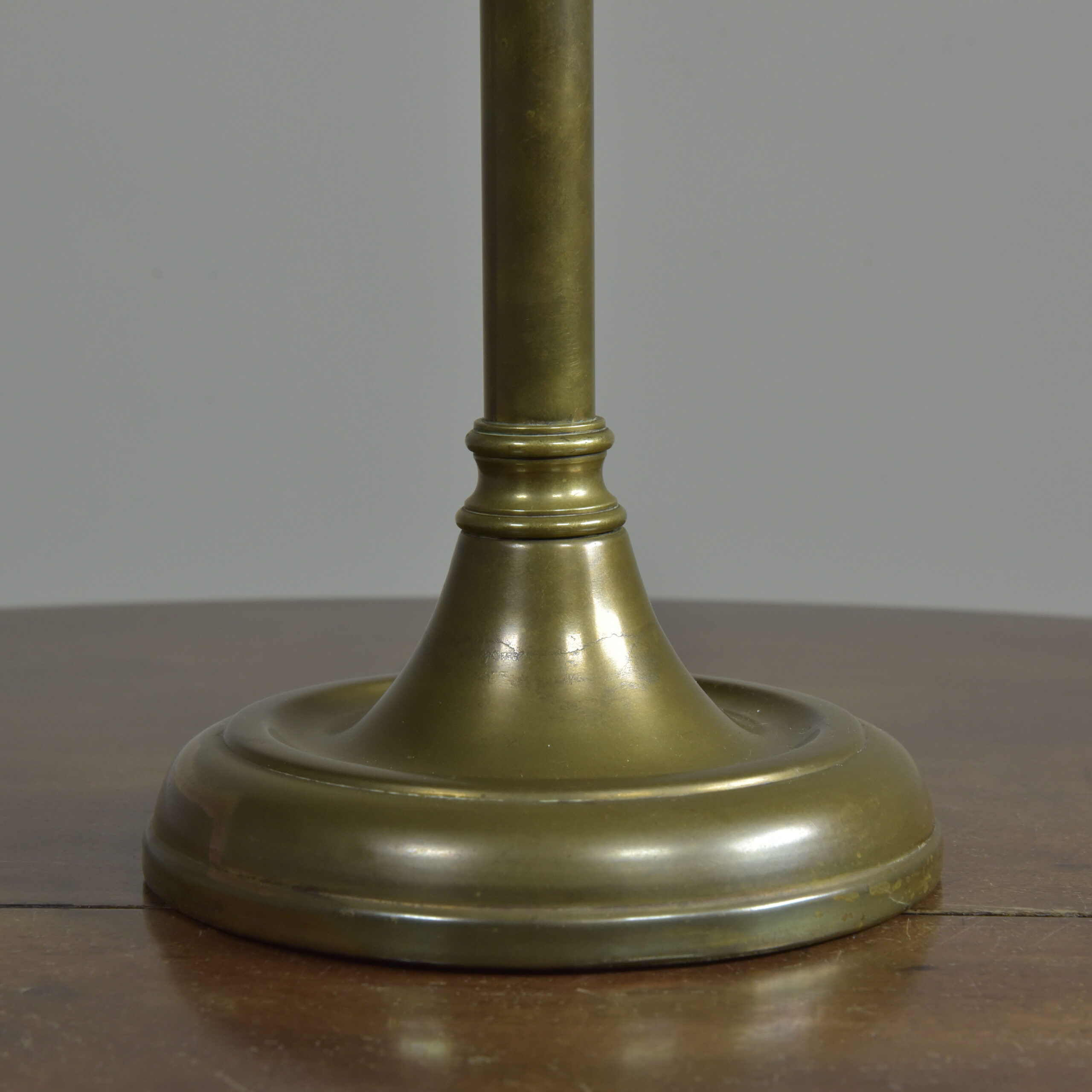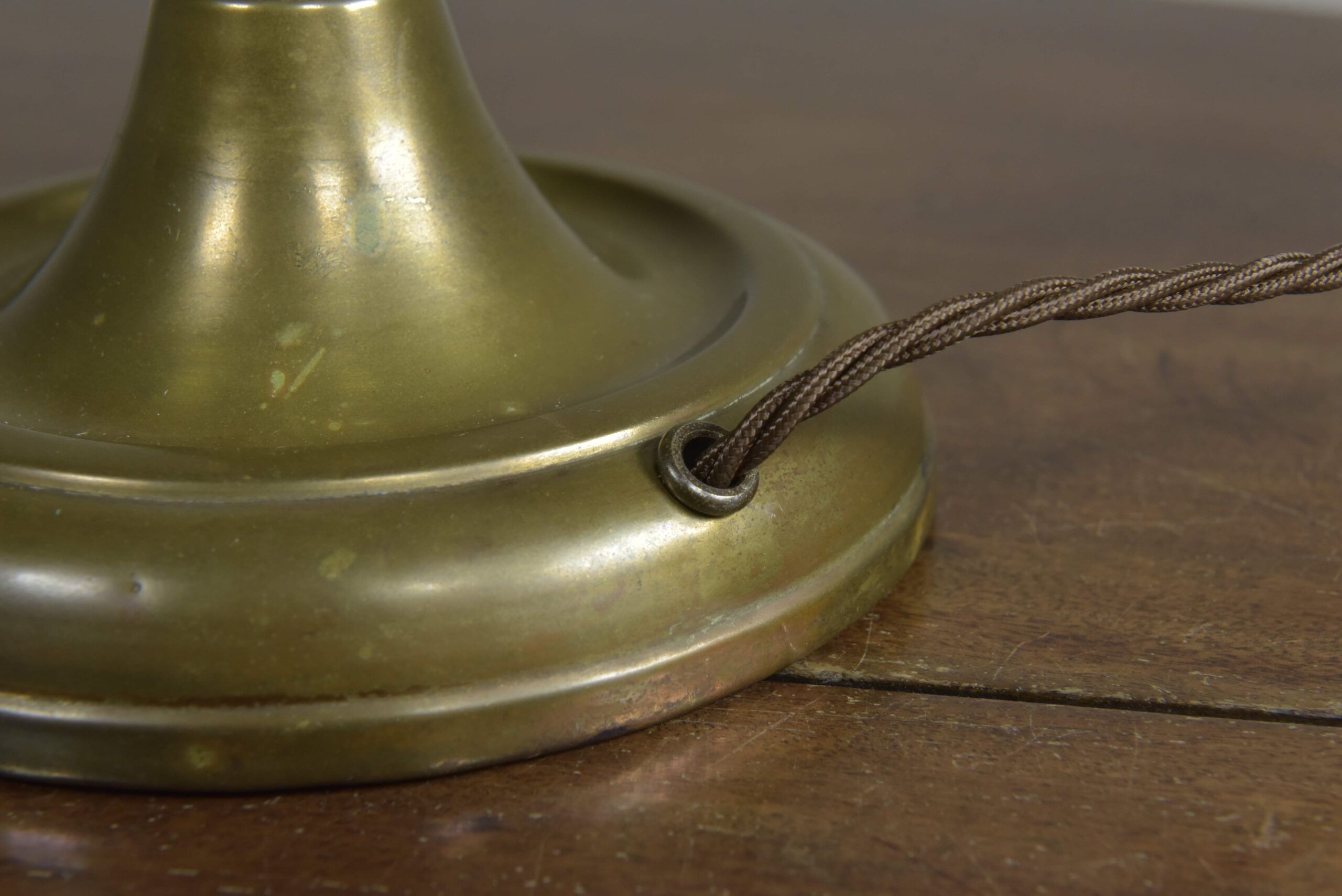 An antique knopped patinated brass shaft and circular base table lamp by GEC. English. Approx 1930s. In excellent condition. One of several of this model in stock (with very slight differences). Plain brass tube, cast decorative ferrules, spun brass circular base (cast iron weighted). Cleaned and waxed. Rewired with 3m fabric flex, patinated brass safety-switched lampholder and traditional plug. Pat tested. Dimensions in inches/cms; 19/48.5cm cm tall inc. lampholder. 6.25″/16cm diameter base. 2.52kg weight. Click photos to enlarge…