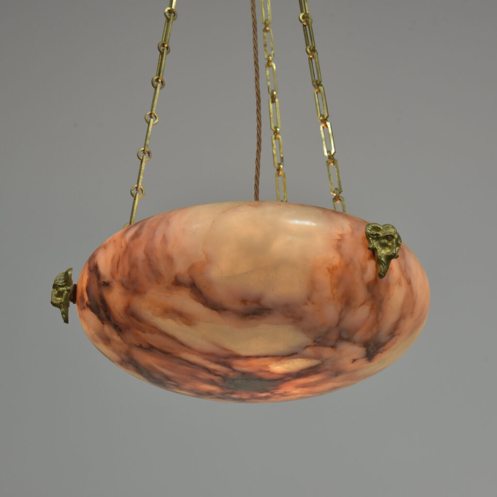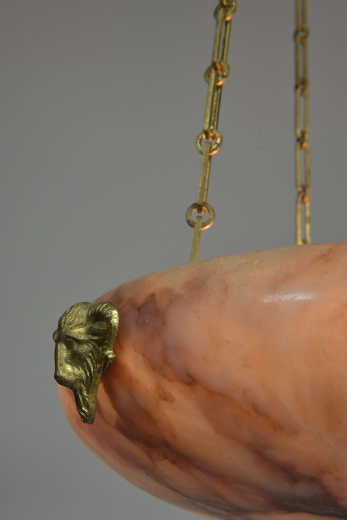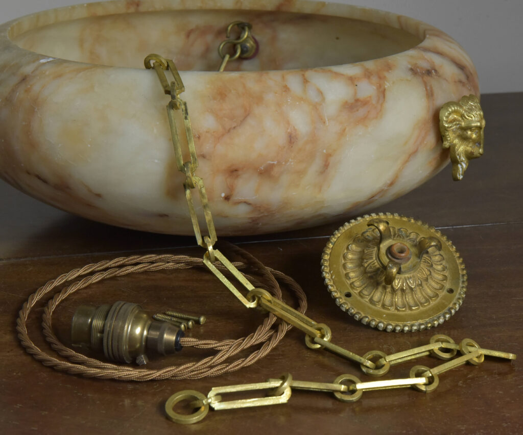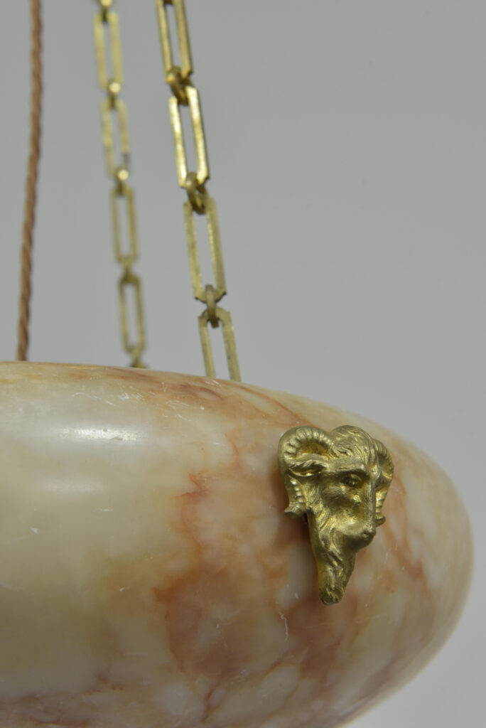 A good alabaster bowl plafonnier with crisply cast gilt brass / ormolu rams mask mounts, original gilt cut chains and cast gilt brass decorative three hooked ceiling plate. Irish / English, early 20th century. Minor “bulb” mark to inside and outside. Overall a very good looking intact bowl. Ready to install; wired cordgrip lampholder / 1.25m fabric flex assembly. Ceiling plate supplied with vintage patinated slotted screws. You may want a wooden ceiling plate or pattress. See detail photos for close ups of what is supplied and of the bowl. Dimensions in inches/cms; 36″/90cm overall drop. 16″/41cm diameter inc. mounts (14″/35.5cm bowl only). 5.0kg weight. Click photos to enlarge…