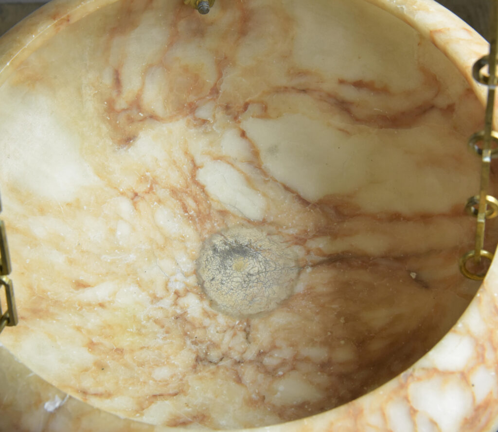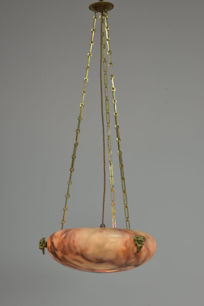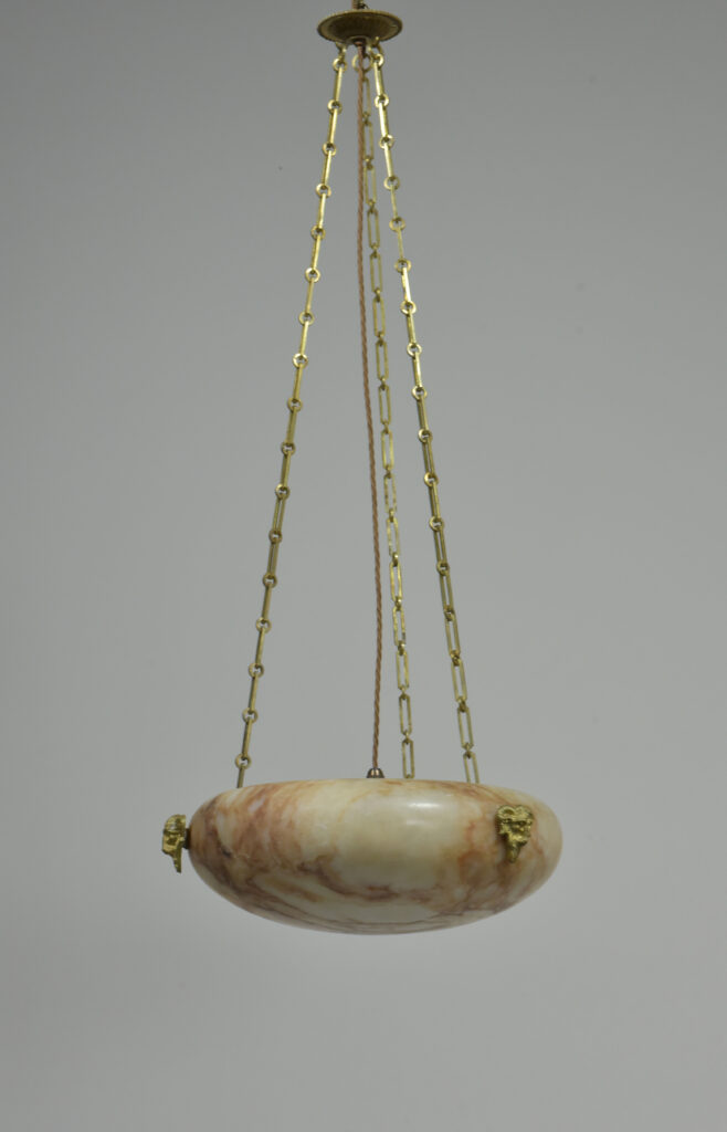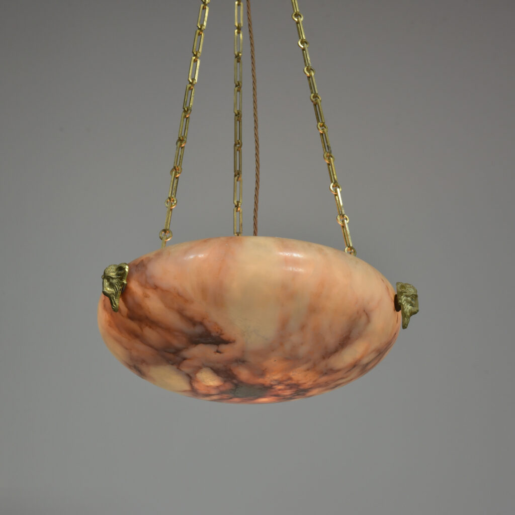 A good alabaster bowl plafonnier with crisply cast gilt brass / ormolu rams mask mounts, original gilt cut chains and cast gilt brass decorative three hooked ceiling plate. Irish / English, early 20th century. Minor “bulb” mark to inside and outside. Overall a very good looking intact bowl. Ready to install; wired cordgrip lampholder / 1.25m fabric flex assembly. Ceiling plate supplied with vintage patinated slotted screws. You may want a wooden ceiling plate or pattress. See detail photos for close ups of what is supplied and of the bowl. Dimensions in inches/cms; 36″/90cm overall drop. 16″/41cm diameter inc. mounts (14″/35.5cm bowl only). 5.0kg weight. Click photos to enlarge…