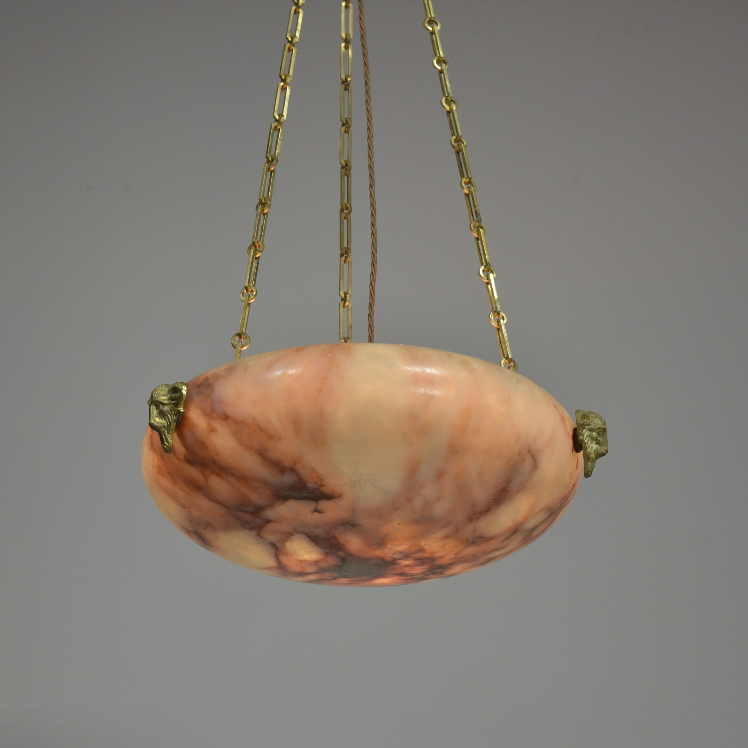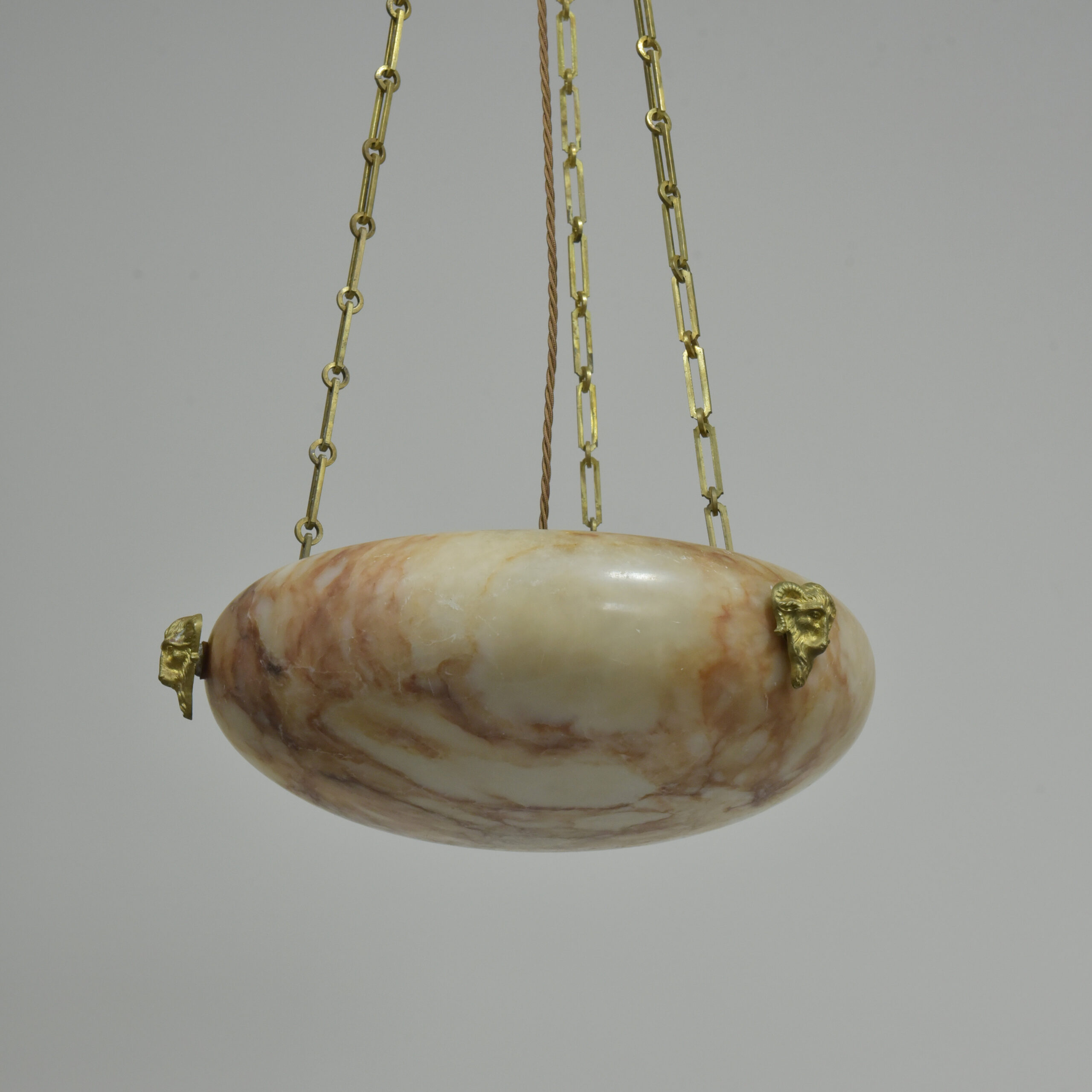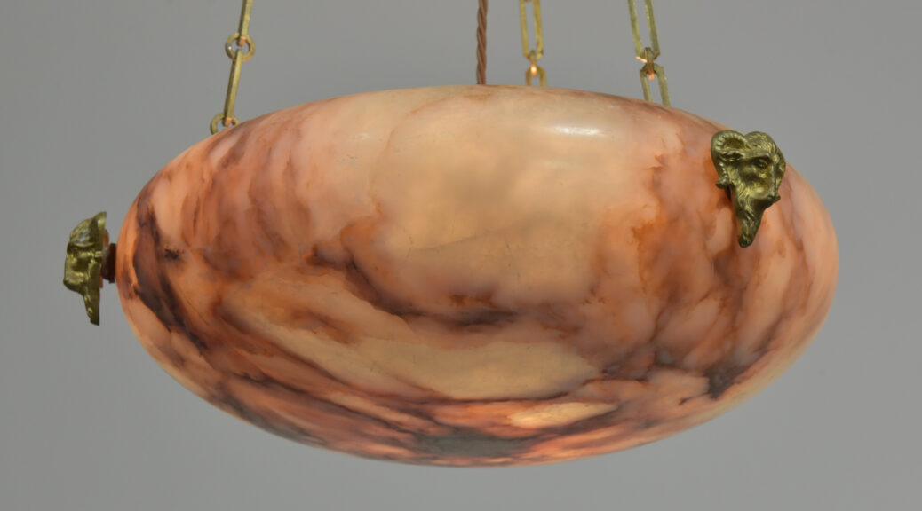 A good alabaster bowl plafonnier with crisply cast gilt brass / ormolu rams mask mounts, original gilt cut chains and cast gilt brass decorative three hooked ceiling plate. Irish / English, early 20th century. Minor “bulb” mark to inside and outside. Overall a very good looking intact bowl. Ready to install; wired cordgrip lampholder / 1.25m fabric flex assembly. Ceiling plate supplied with vintage patinated slotted screws. You may want a wooden ceiling plate or pattress. See detail photos for close ups of what is supplied and of the bowl. Dimensions in inches/cms; 36″/90cm overall drop. 16″/41cm diameter inc. mounts (14″/35.5cm bowl only). 5.0kg weight. Click photos to enlarge…