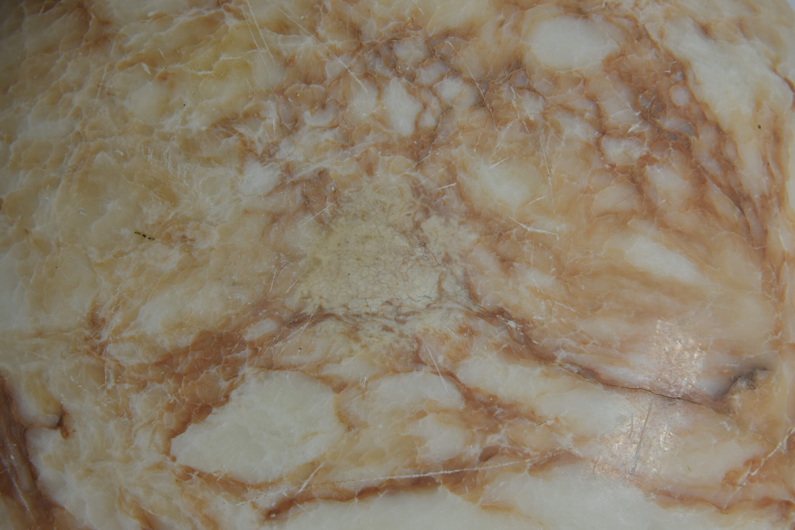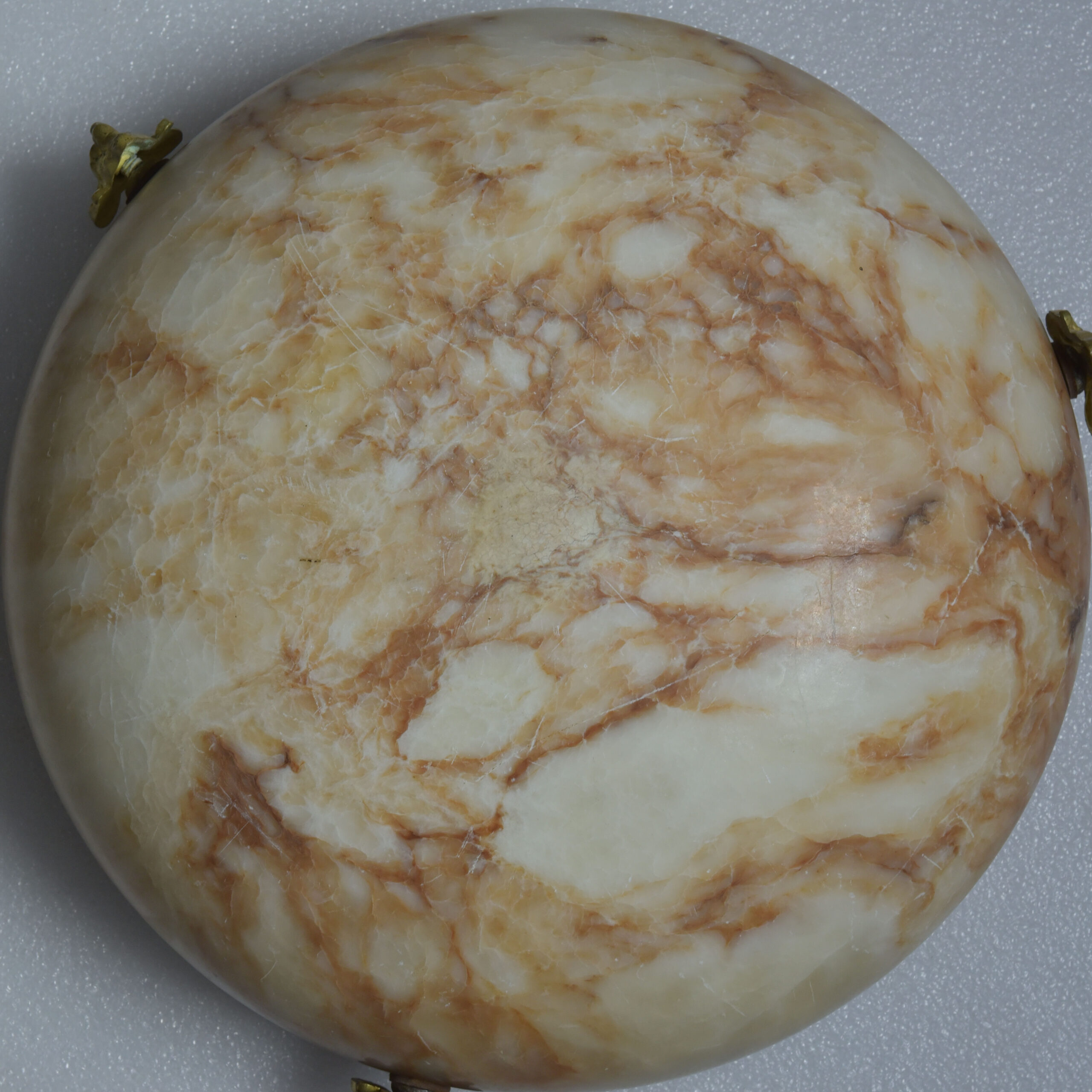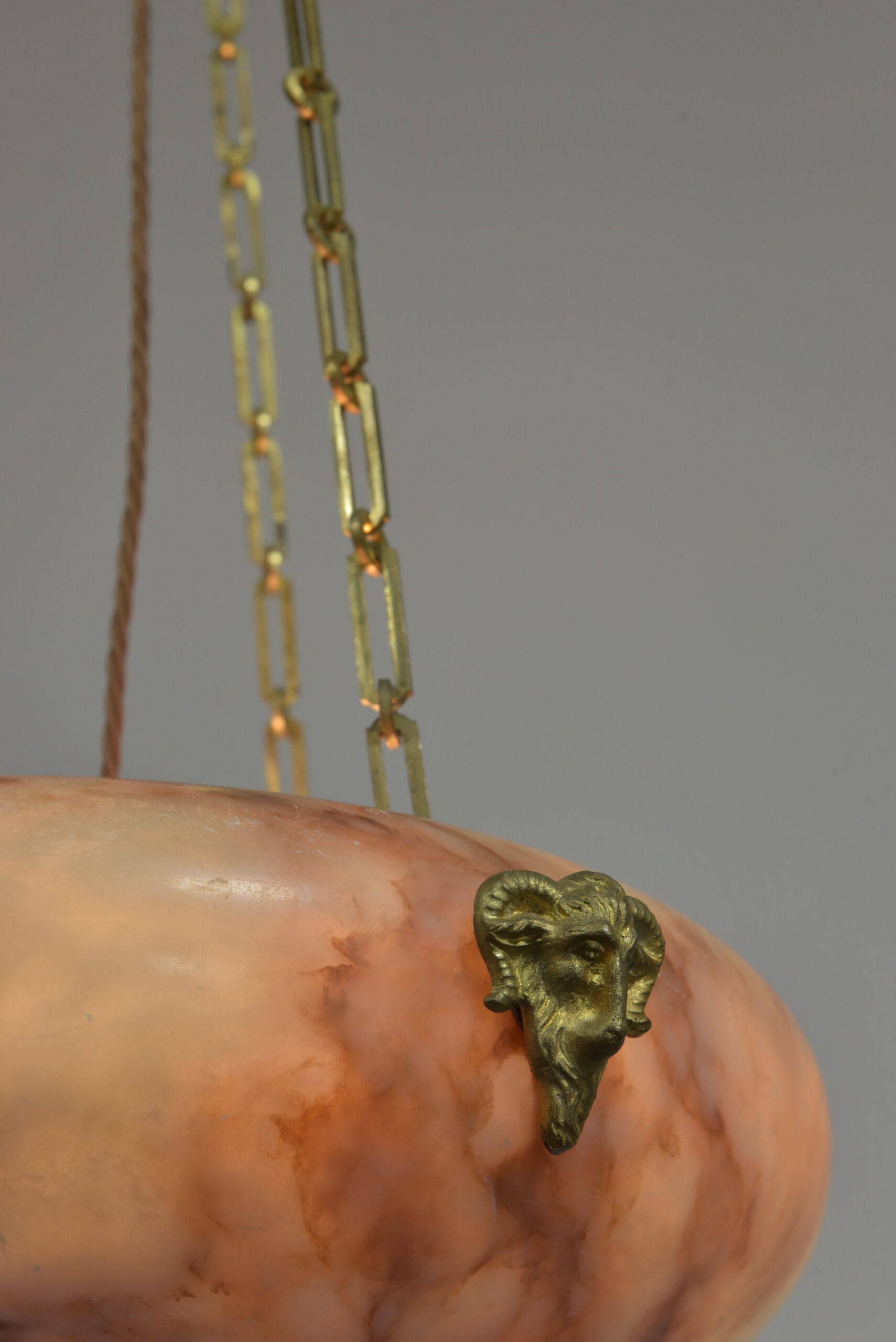 A good alabaster bowl plafonnier with crisply cast gilt brass / ormolu rams mask mounts, original gilt cut chains and cast gilt brass decorative three hooked ceiling plate. Irish / English, early 20th century. Minor “bulb” mark to inside and outside. Overall a very good looking intact bowl. Ready to install; wired cordgrip lampholder / 1.25m fabric flex assembly. Ceiling plate supplied with vintage patinated slotted screws. You may want a wooden ceiling plate or pattress. See detail photos for close ups of what is supplied and of the bowl. Dimensions in inches/cms; 36″/90cm overall drop. 16″/41cm diameter inc. mounts (14″/35.5cm bowl only). 5.0kg weight. Click photos to enlarge…