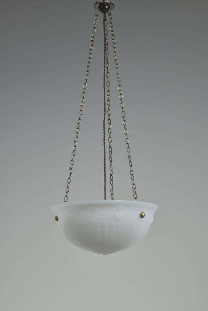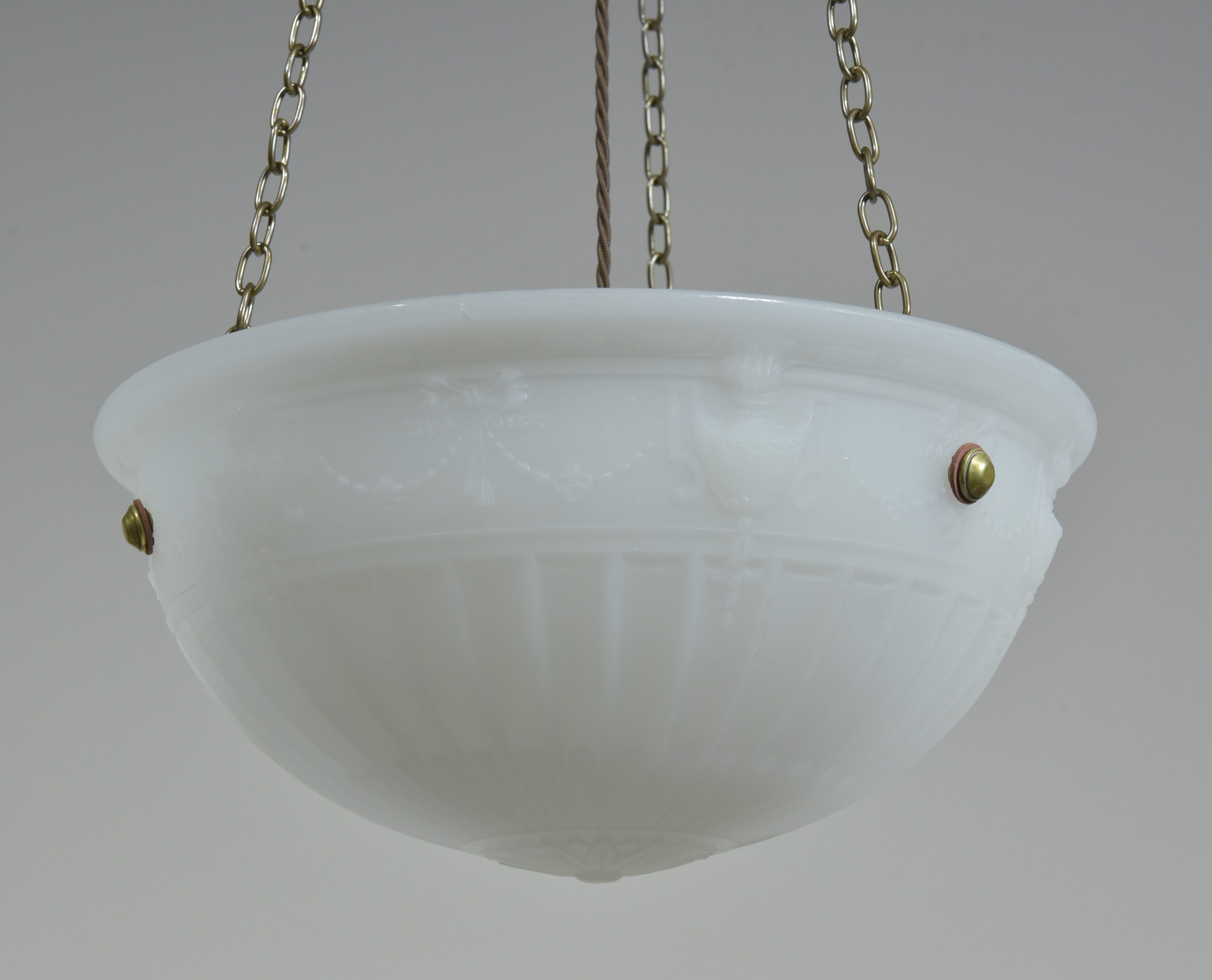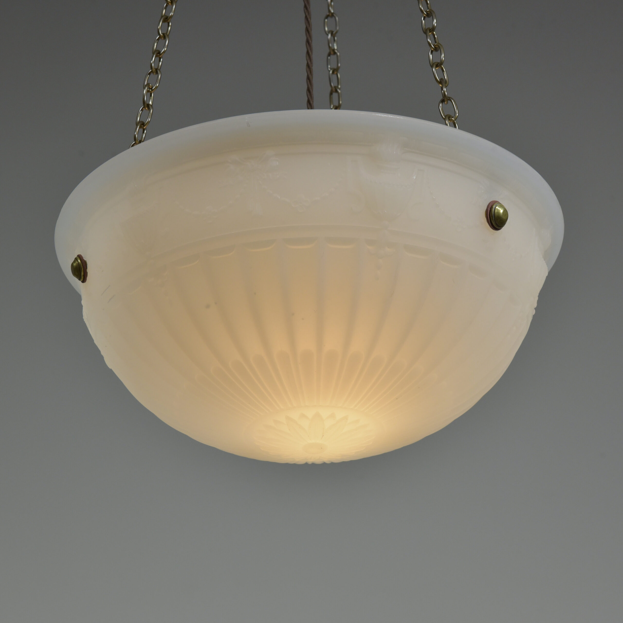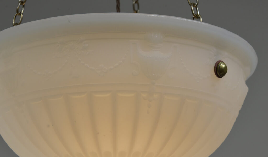 An antique moonstone glass bowl plafonnier light with repeating urn, ribbon and bellflower swag decoration to the perimeter and radial fluting. English early 20th century. Includes it’s original hook mounts (new washers). Bowl is cleaned and marks removed. Wired with 1.25m fabric flex, patinated brass cordgrip/BC lampholder. Supplied with patinated 3 hook ceiling plate (inc brass cable guide, earth, screws, cordgrip) and patinated solid brass hanging chains. Dimensions in inches/cms; 14″/36cm diameter. Approx 36″/91cm total drop (easily altered). Weight is 3.8kg. Similar moonstone/Jefferson plafonniers available. Click photos to enlarge…