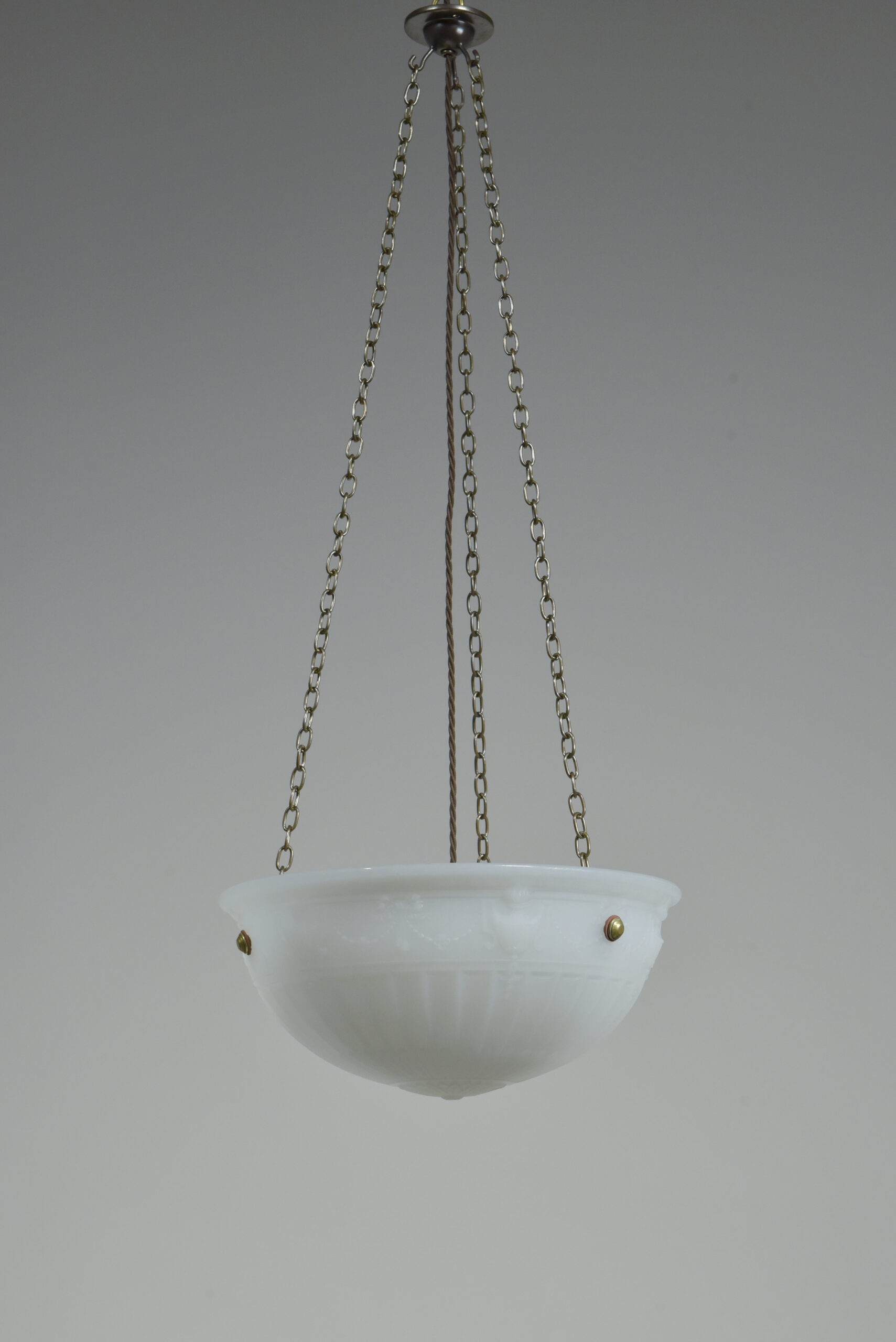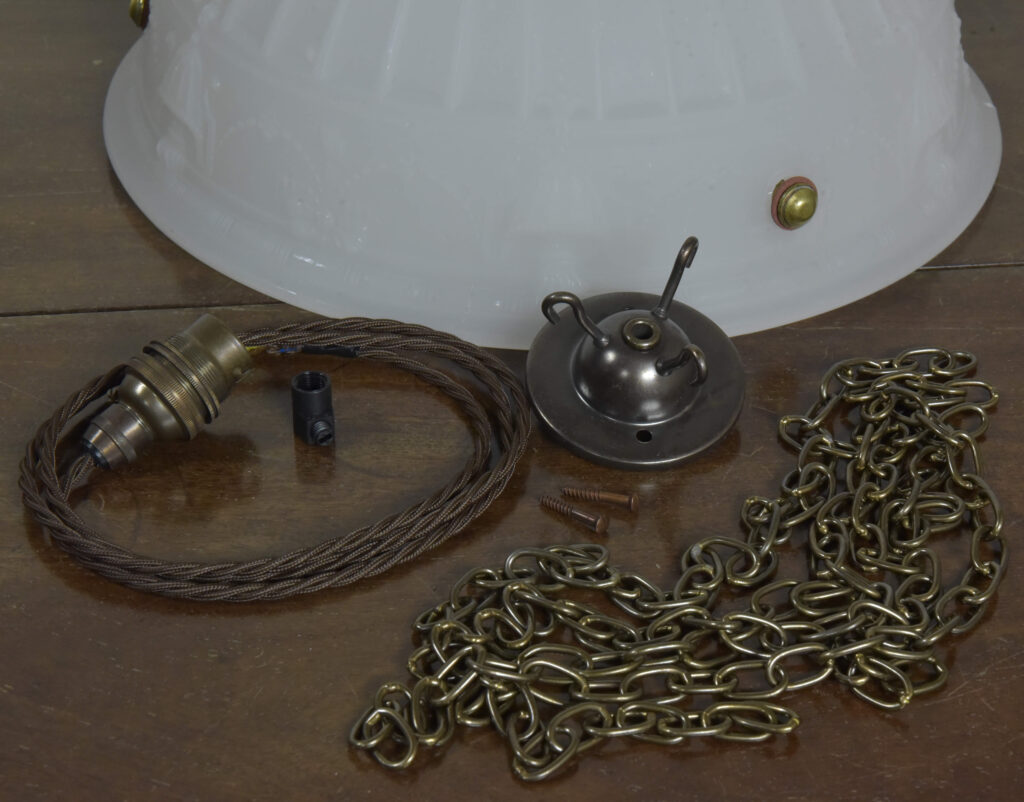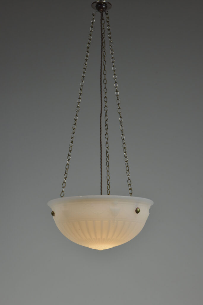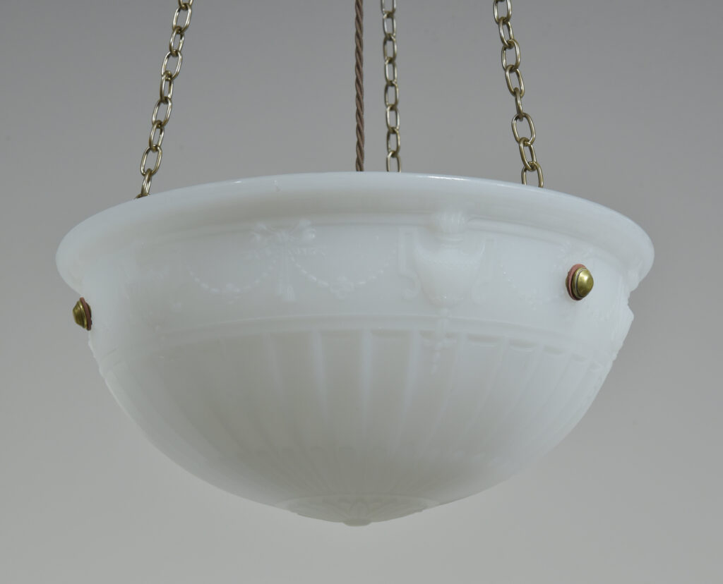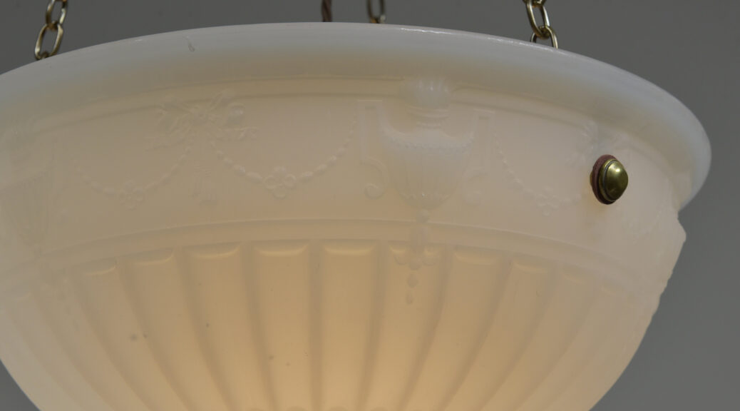 An antique moonstone glass bowl plafonnier light with repeating urn, ribbon and bellflower swag decoration to the perimeter and radial fluting. English early 20th century. Includes it’s original hook mounts (new washers). Bowl is cleaned and marks removed. Wired with 1.25m fabric flex, patinated brass cordgrip/BC lampholder. Supplied with patinated 3 hook ceiling plate (inc brass cable guide, earth, screws, cordgrip) and patinated solid brass hanging chains. Dimensions in inches/cms; 14″/36cm diameter. Approx 36″/91cm total drop (easily altered). Weight is 3.8kg. Similar moonstone/Jefferson plafonniers available. Click photos to enlarge…