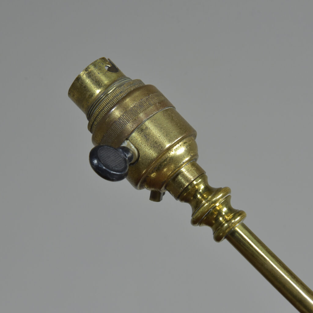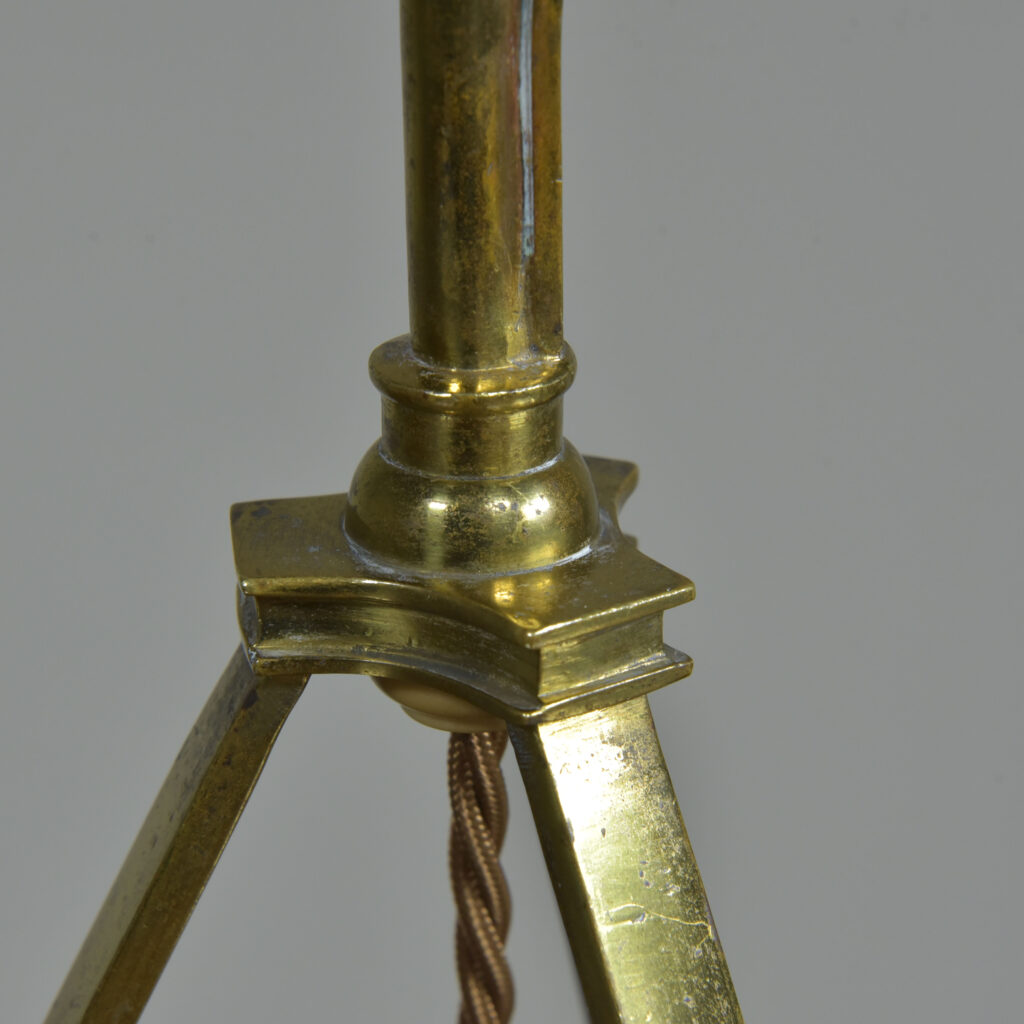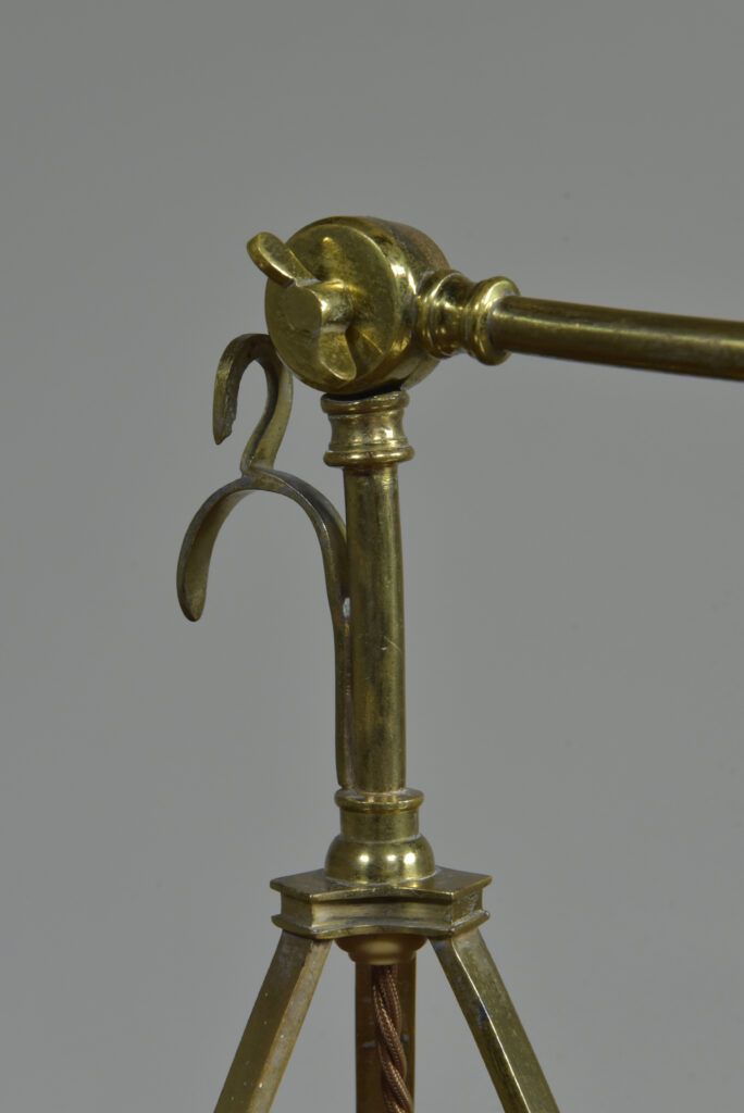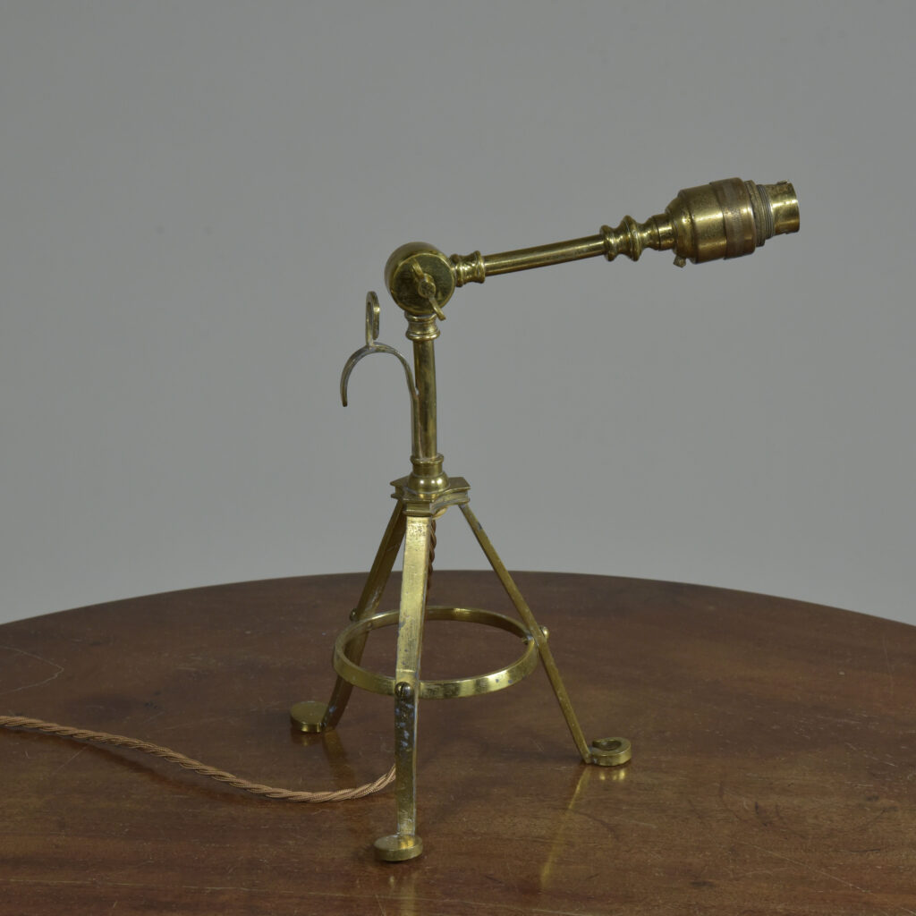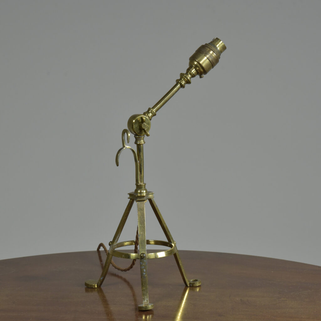 An antique gilt brass tripod / pullman table / wall lamp with articulated lampholder arm. English, early 20th century. Cleaned, light polish. Rewired using original switched BC lampholder, 2.5m fabric flex, 3amp plug. Earthed. Pat tested. Approx 16″/41cm tall. 0.8kg. Click photos to enlarge…