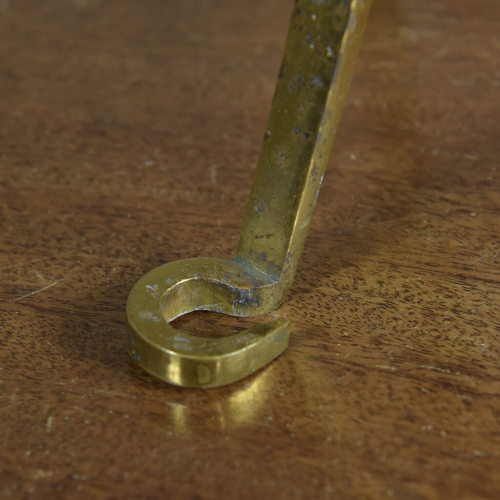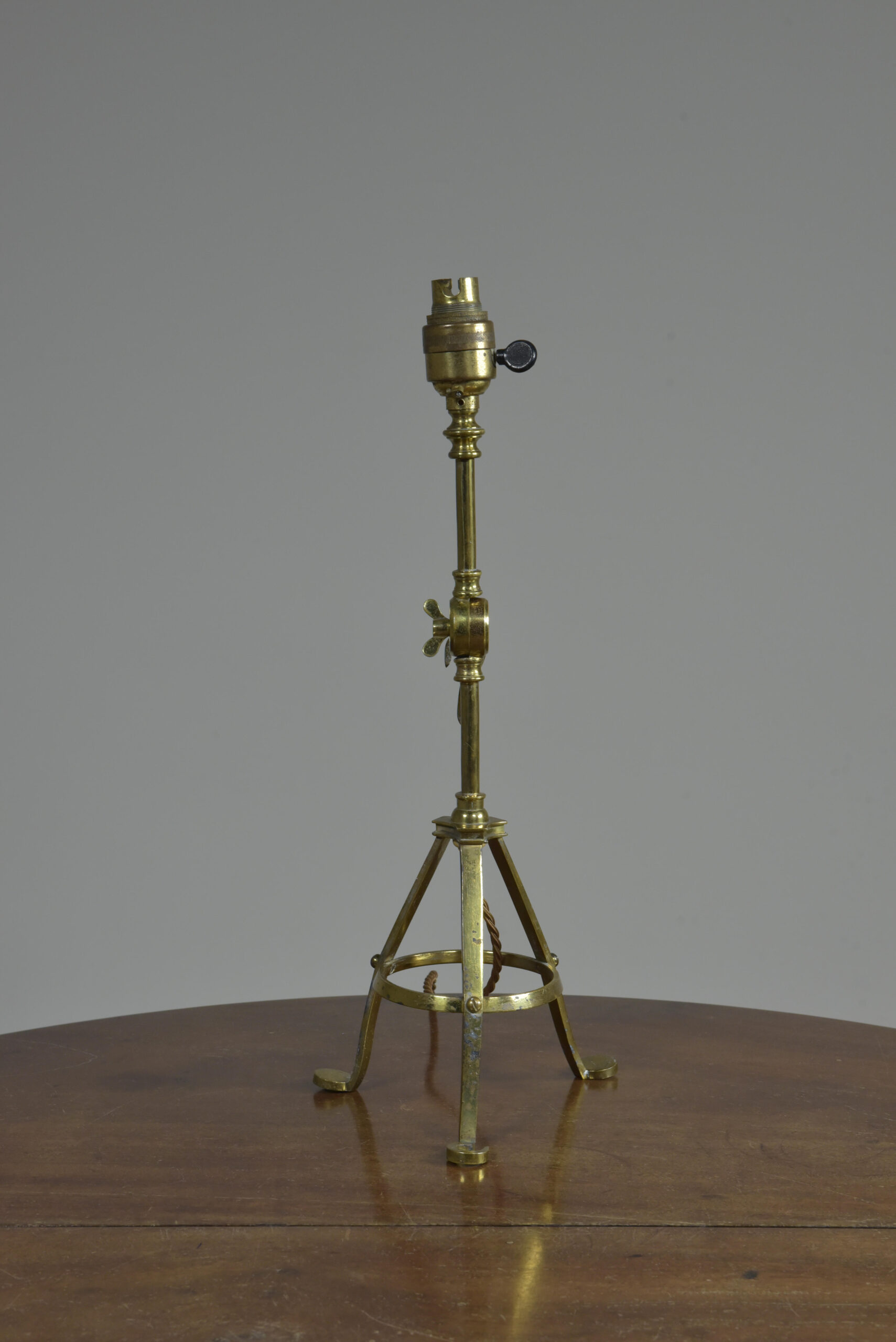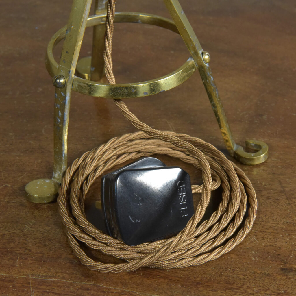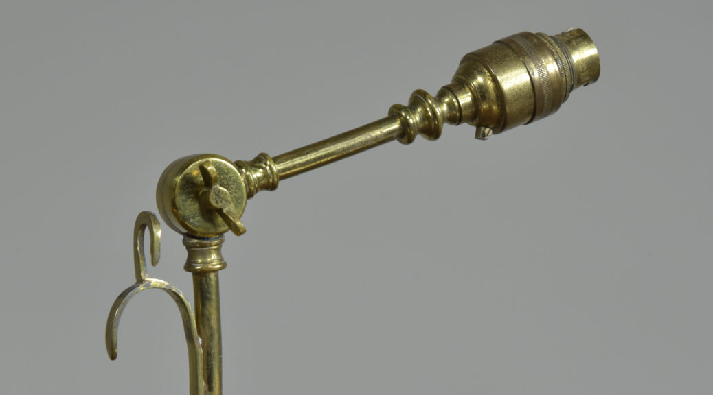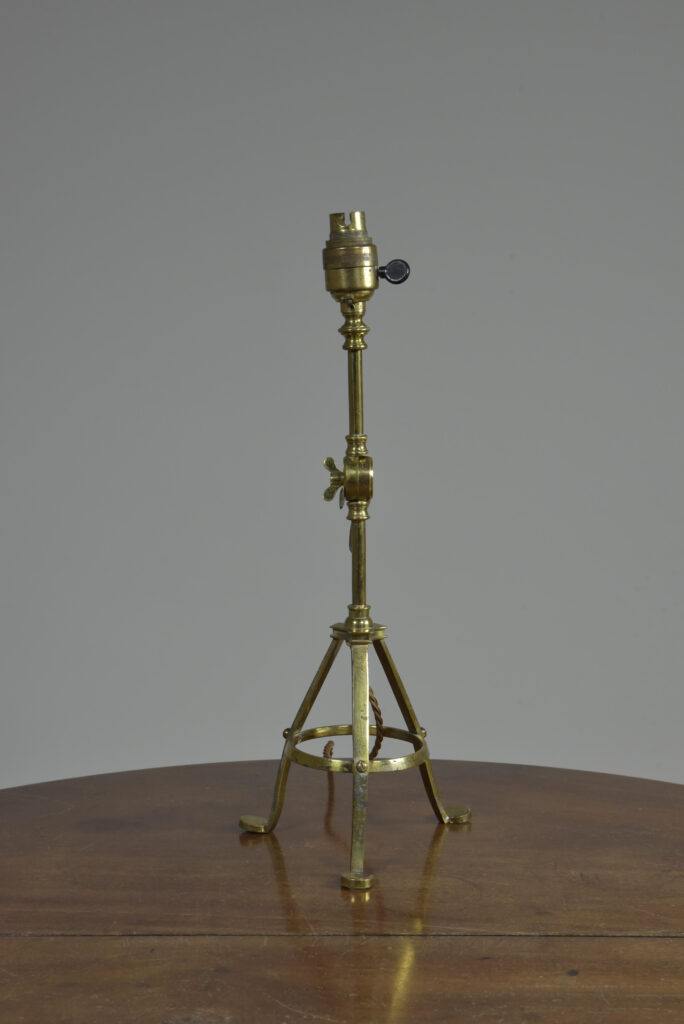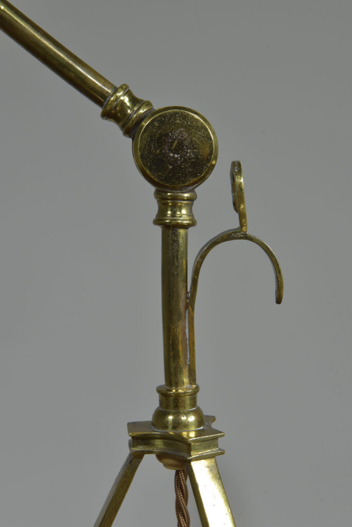An antique gilt brass tripod / pullman table / wall lamp with articulated lampholder arm. English, early 20th century. Cleaned, light polish. Rewired using original switched BC lampholder, 2.5m fabric flex, 3amp plug. Earthed. Pat tested. Approx 16″/41cm tall. 0.8kg. Click photos to enlarge…