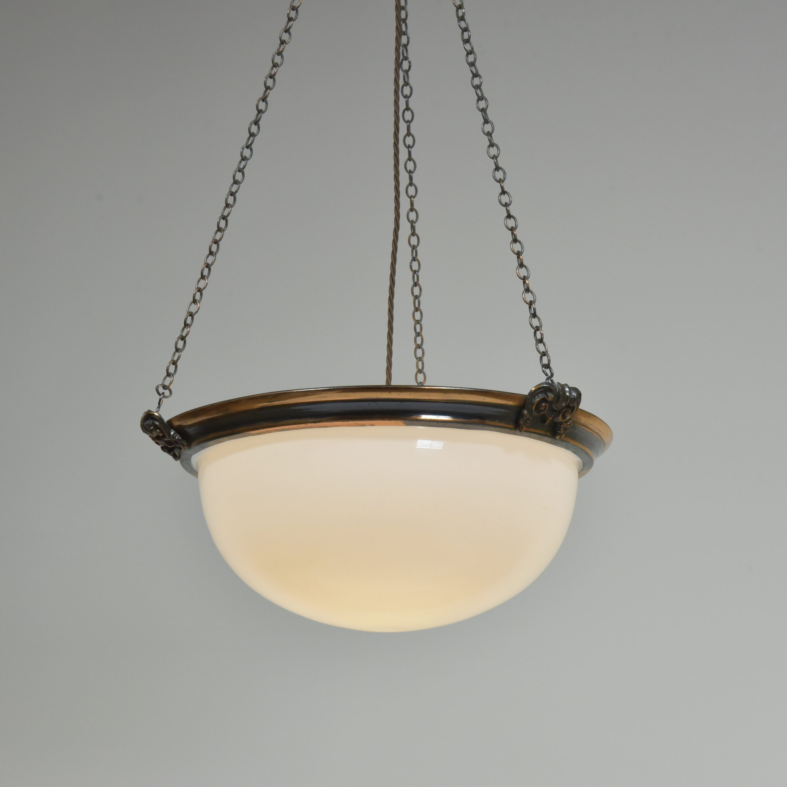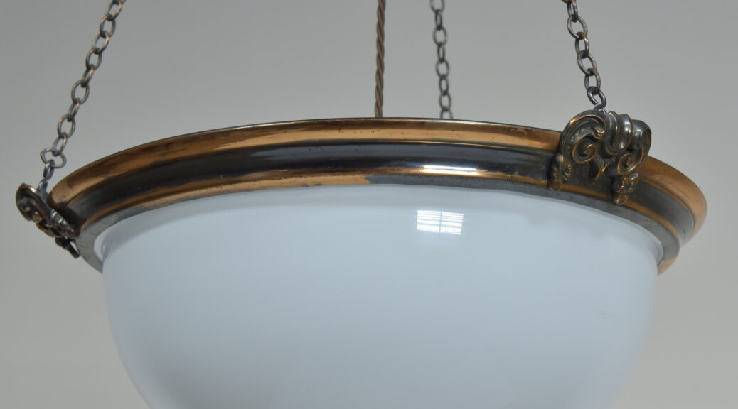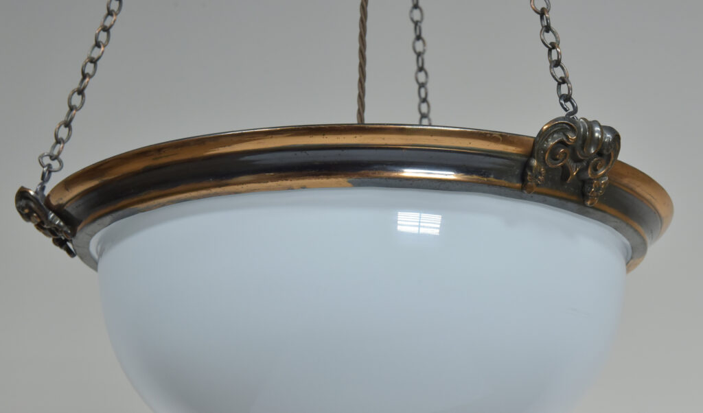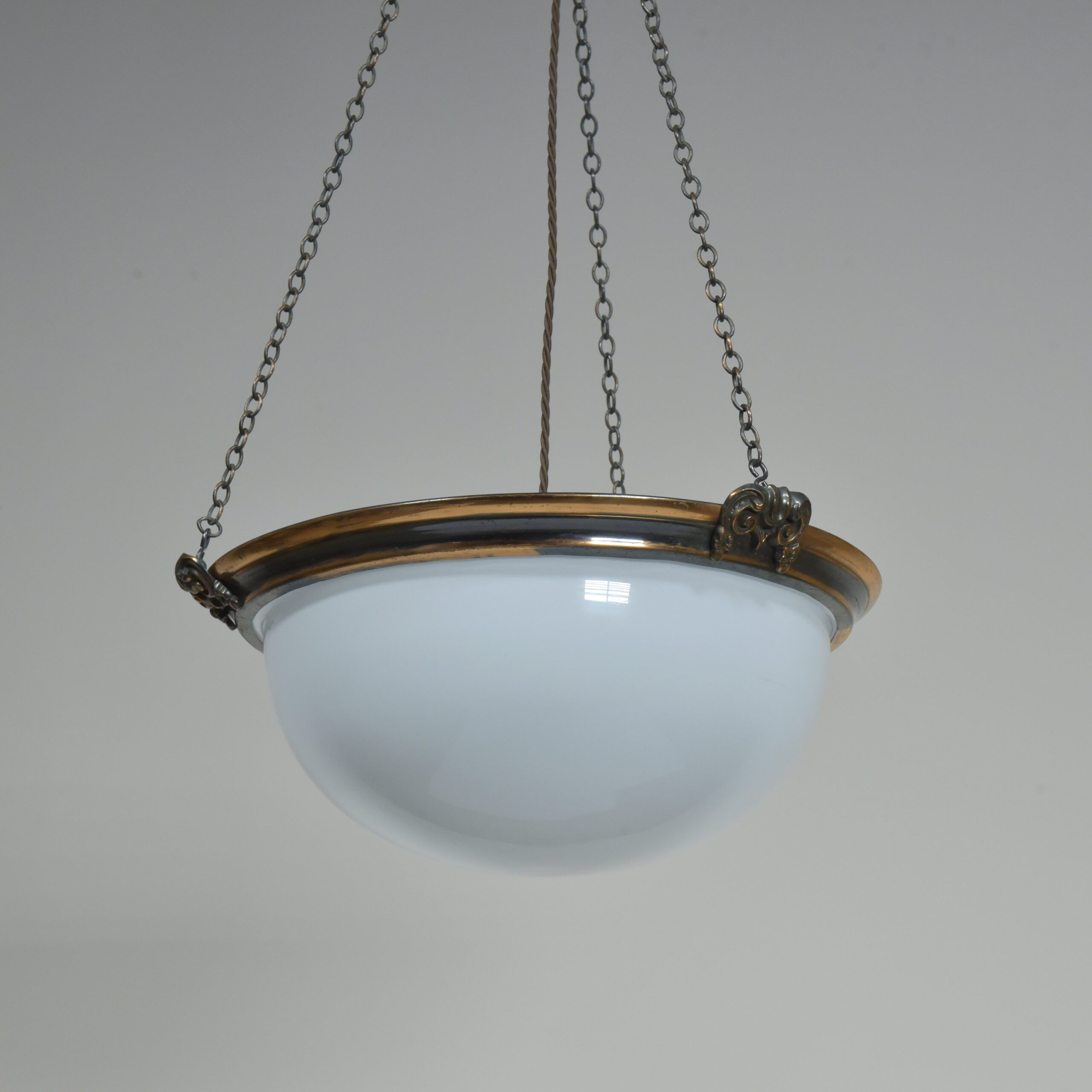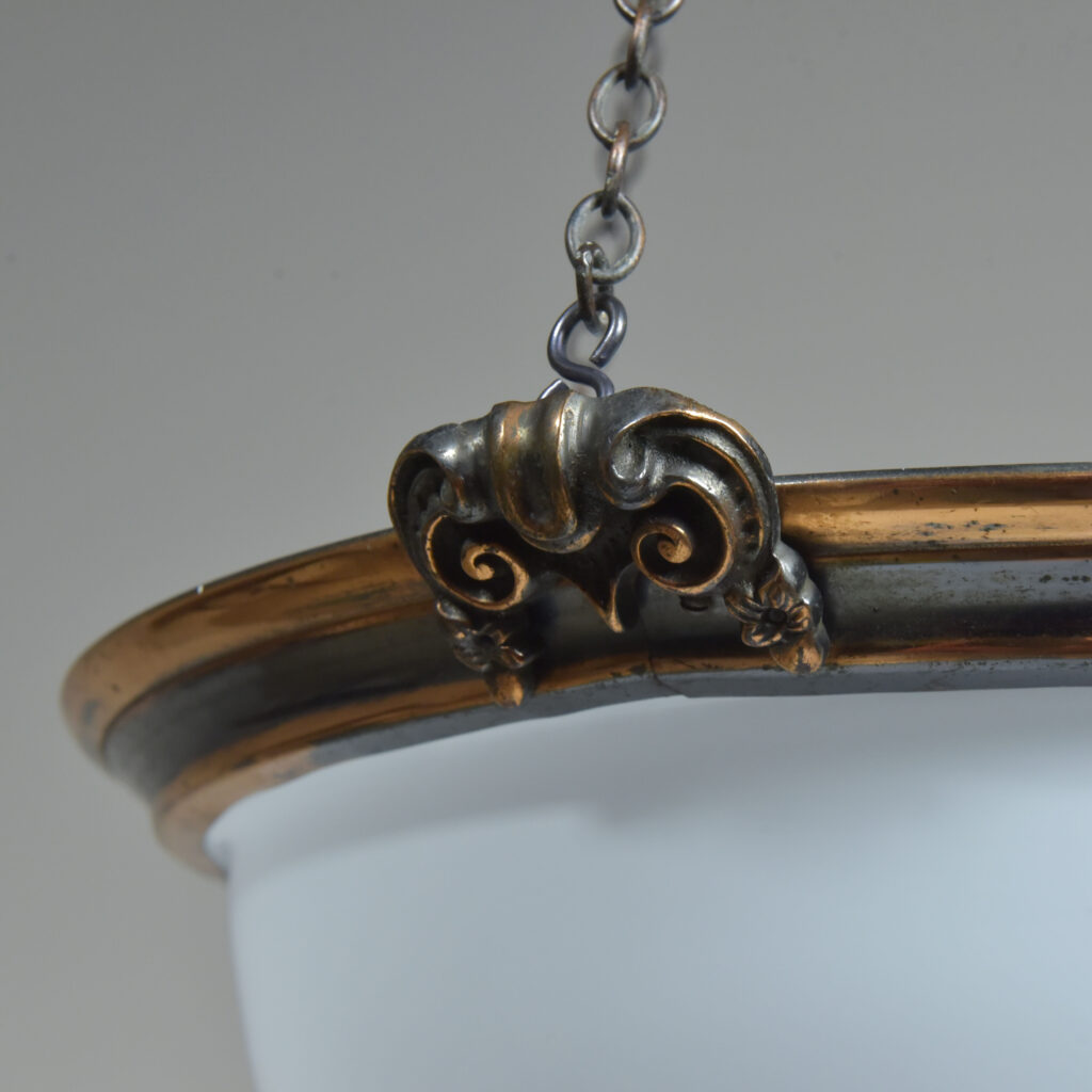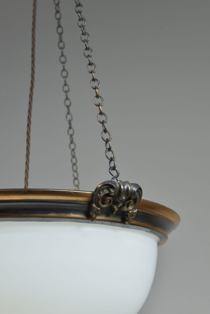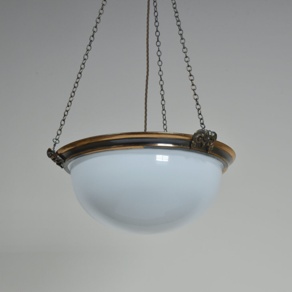 An antique hemispherical opal glass bowl shade plafonnier with brass ring and cast brass scroll mounts retaining their original coppered / bronzed patination. English, c1920. In very good condition. Cleaned. Wired with 1.25m fabric flex, patinated brass cordgrip/BC lampholder. Supplied with patinated 3 hook ceiling plate (inc brass cable guide, earth, screws, cordgrip) and solid brass hanging chains (original). Dimensions in inches/cms; 16″/41cm diameter inc. mounts (14″/36cm bowl only). 31.75″/81cm total drop (easily altered). Weight is 2.36kg. Click photos to enlarge…