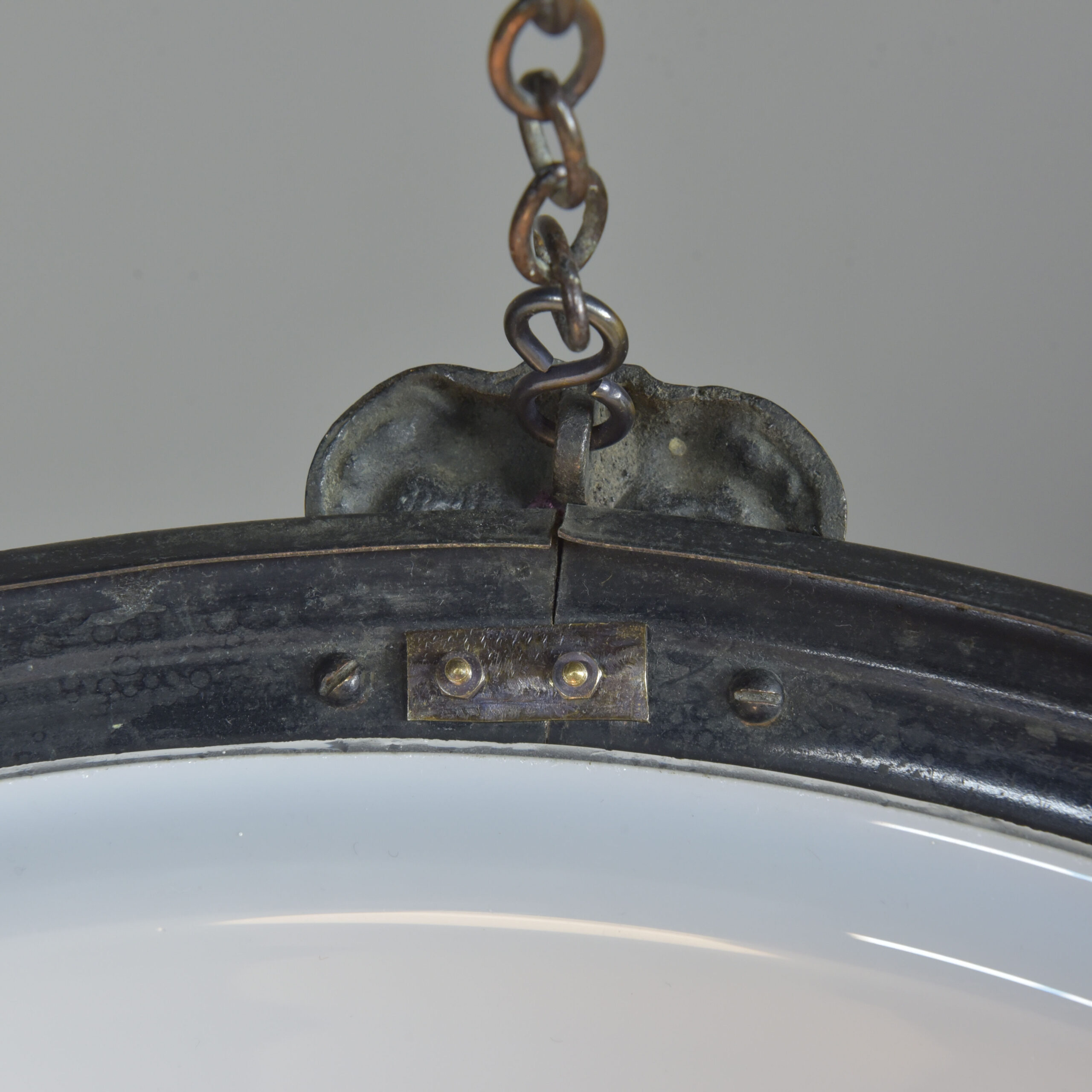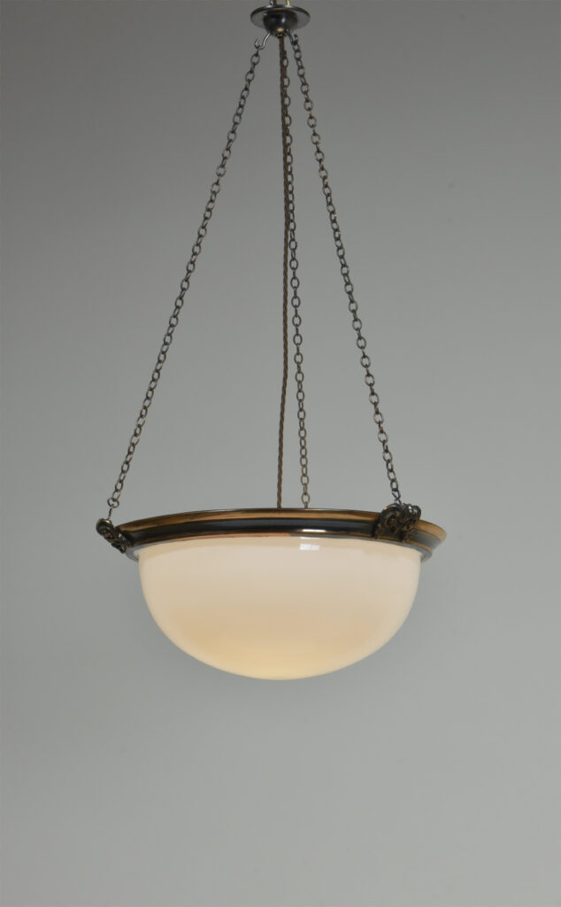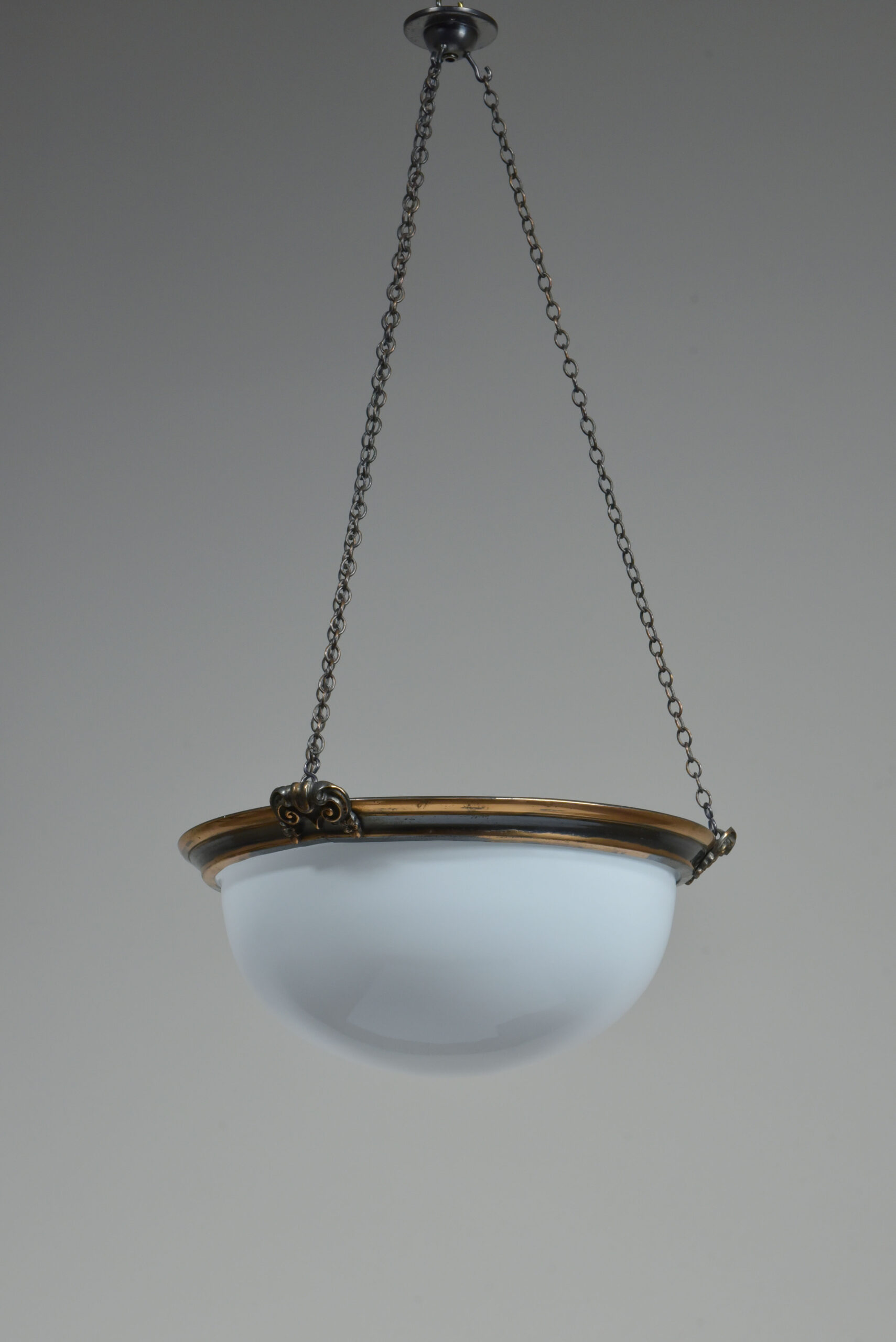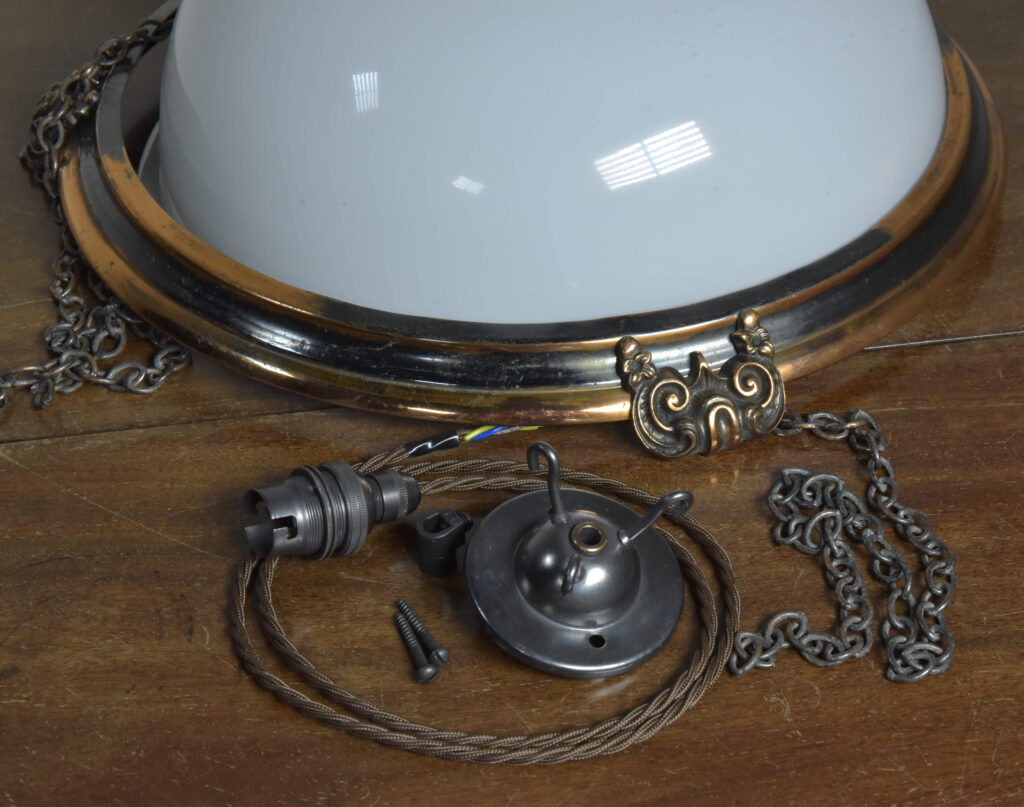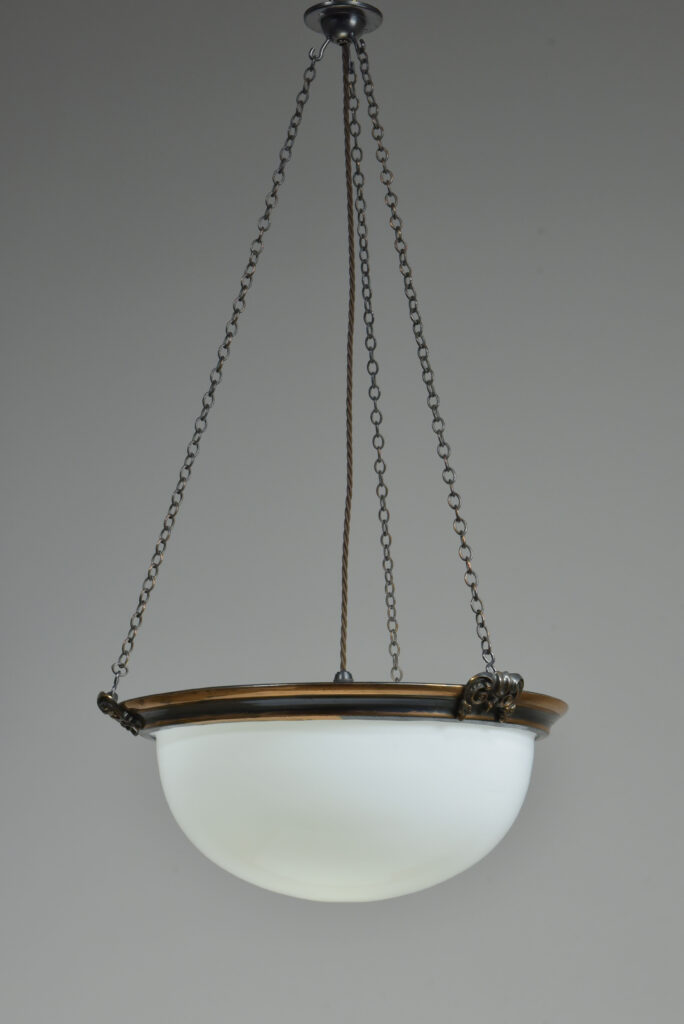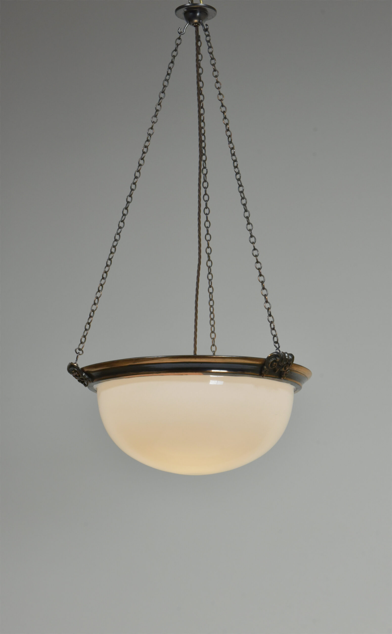 An antique hemispherical opal glass bowl shade plafonnier with brass ring and cast brass scroll mounts retaining their original coppered / bronzed patination. English, c1920. In very good condition. Cleaned. Wired with 1.25m fabric flex, patinated brass cordgrip/BC lampholder. Supplied with patinated 3 hook ceiling plate (inc brass cable guide, earth, screws, cordgrip) and solid brass hanging chains (original). Dimensions in inches/cms; 16″/41cm diameter inc. mounts (14″/36cm bowl only). 31.75″/81cm total drop (easily altered). Weight is 2.36kg. Click photos to enlarge…