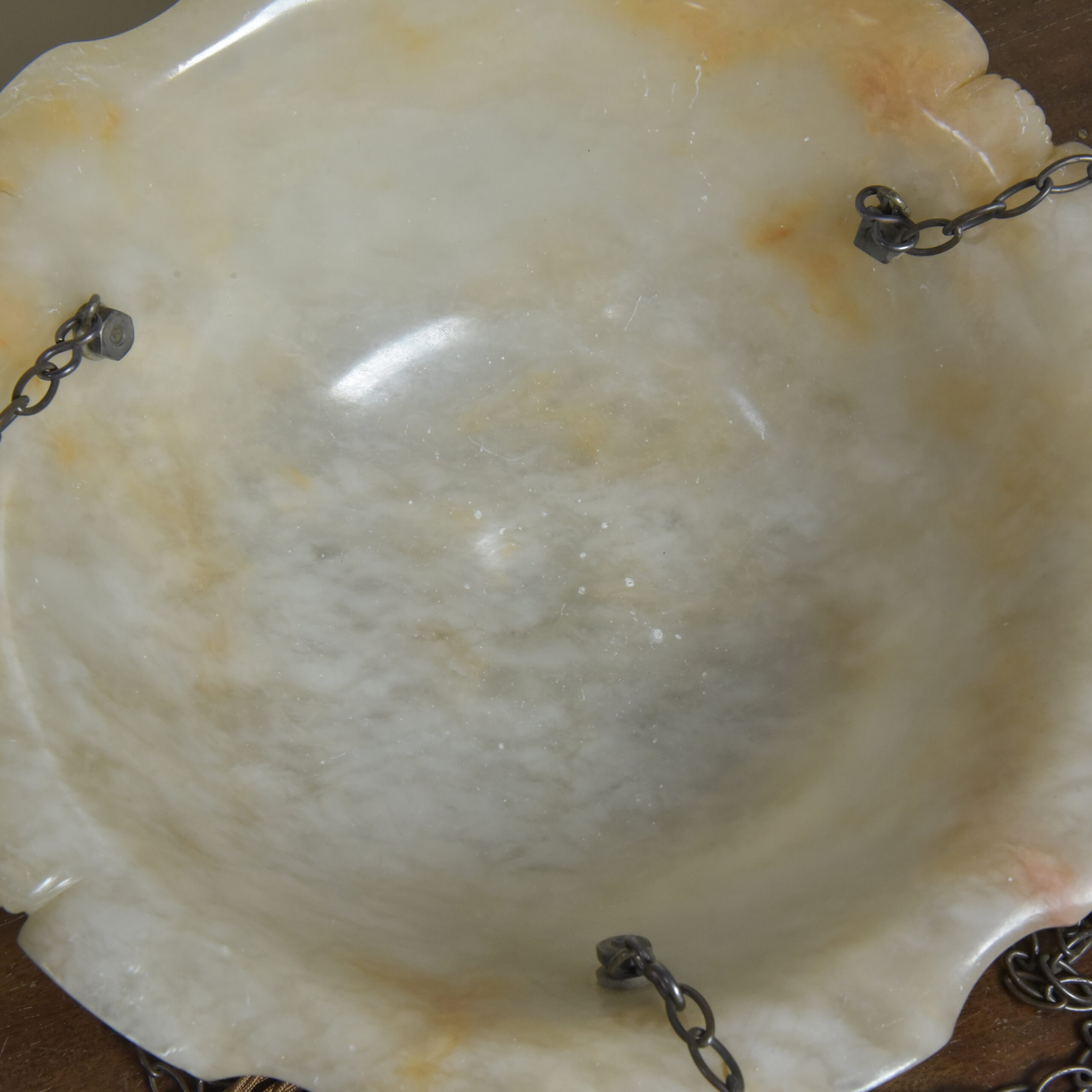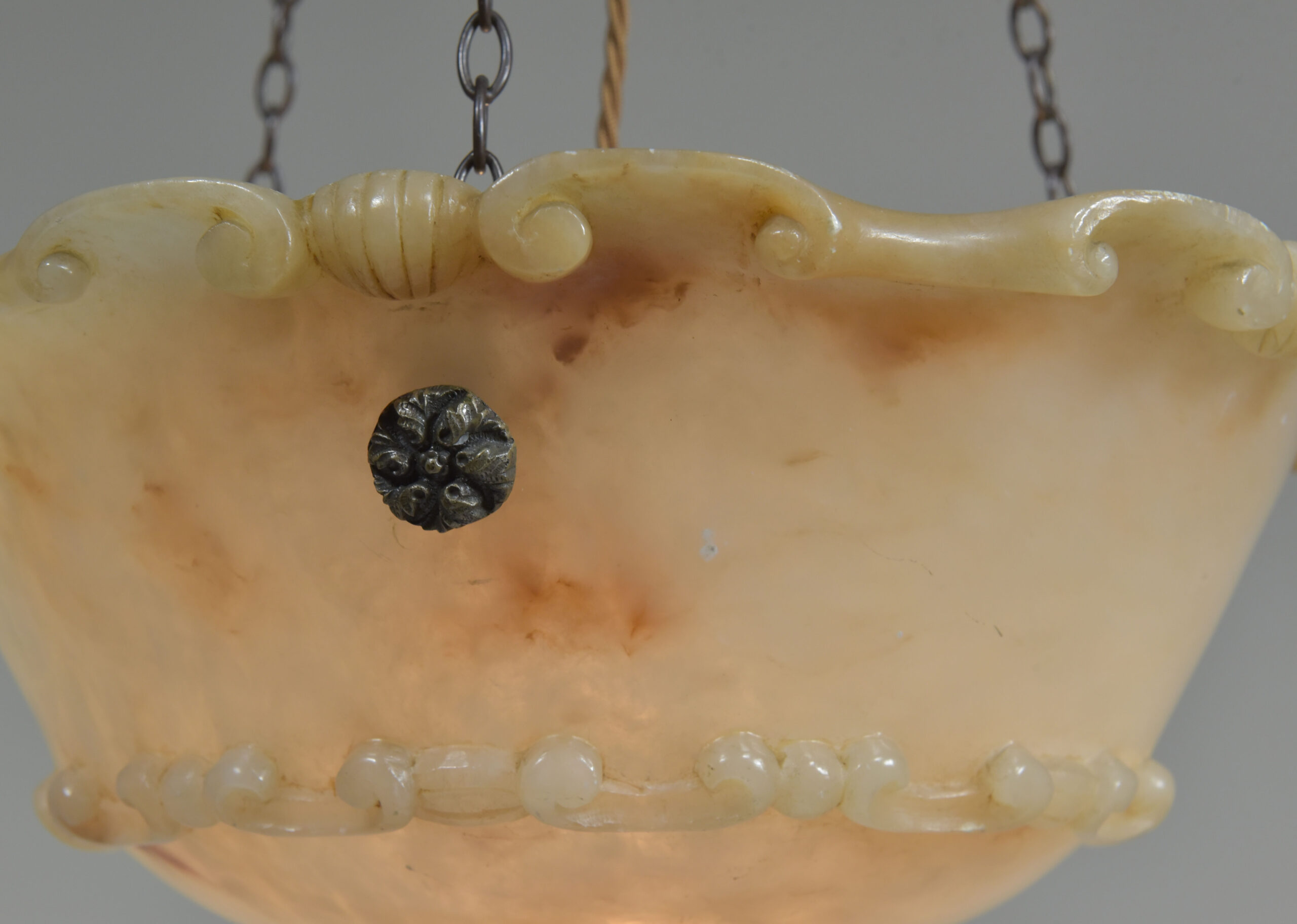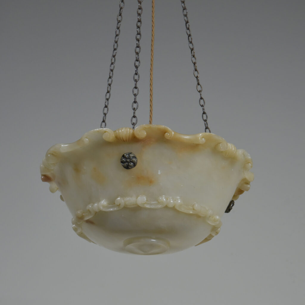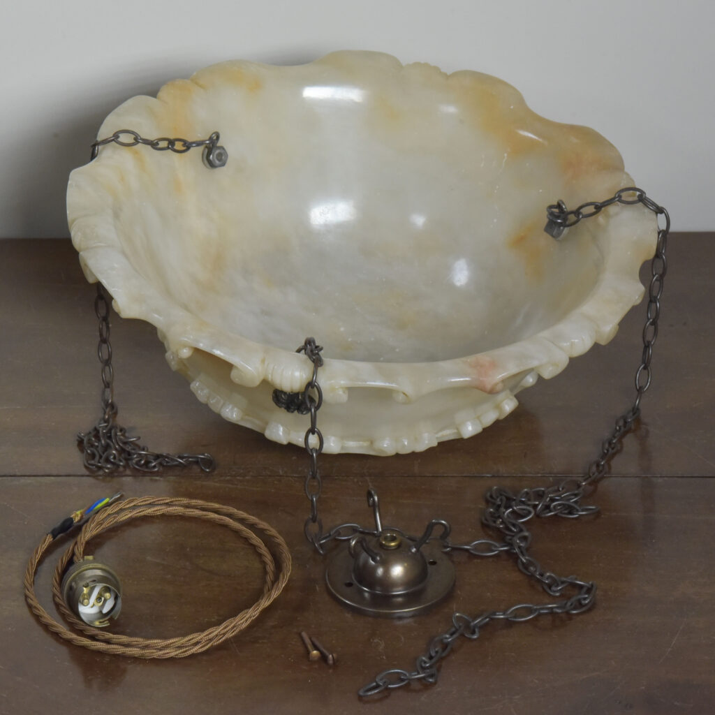 An antique alabaster bowl plafonnier with c scroll and shell decorative rim and band, floral rosette mounts and original quality brass chain. Excellent condition, lovely colour. English, early 20th century to 1920. Cleaned and waxed. Wired with 1.25m fabric flex, patinated brass cordgrip/BC lampholder. Supplied with patinated 3 hook ceiling plate (inc brass cable guide, earth, screws, cordgrip) and solid brass hanging chains (original). Dimensions in inches/cms; 14″/36cm diameter. 32″/80cm total drop (easily altered). Weight is 3.72kg. Click photos to enlarge…