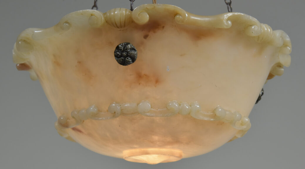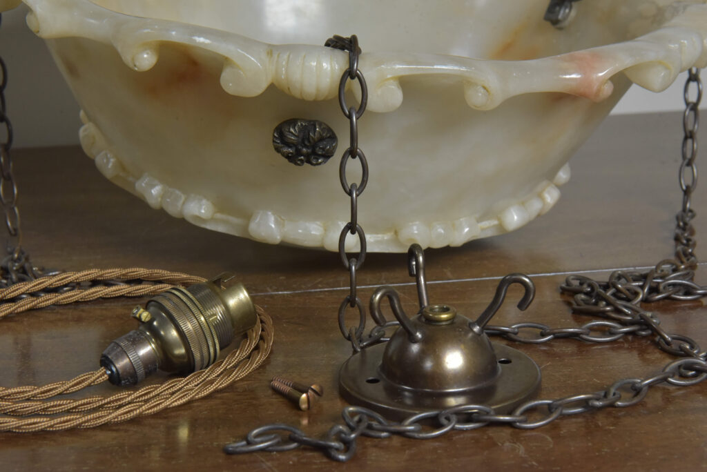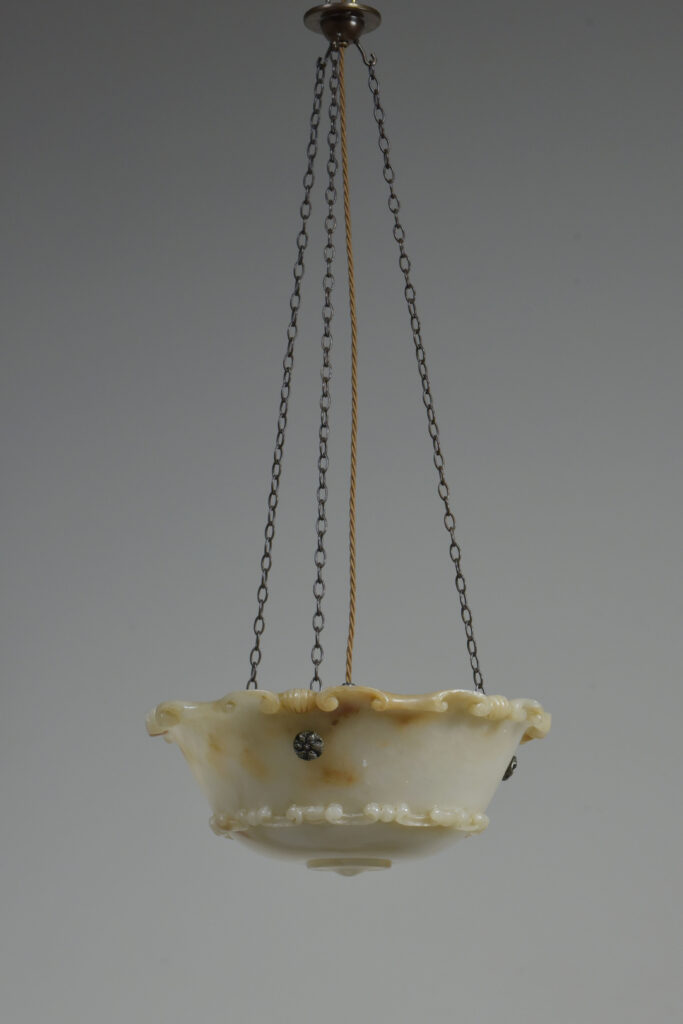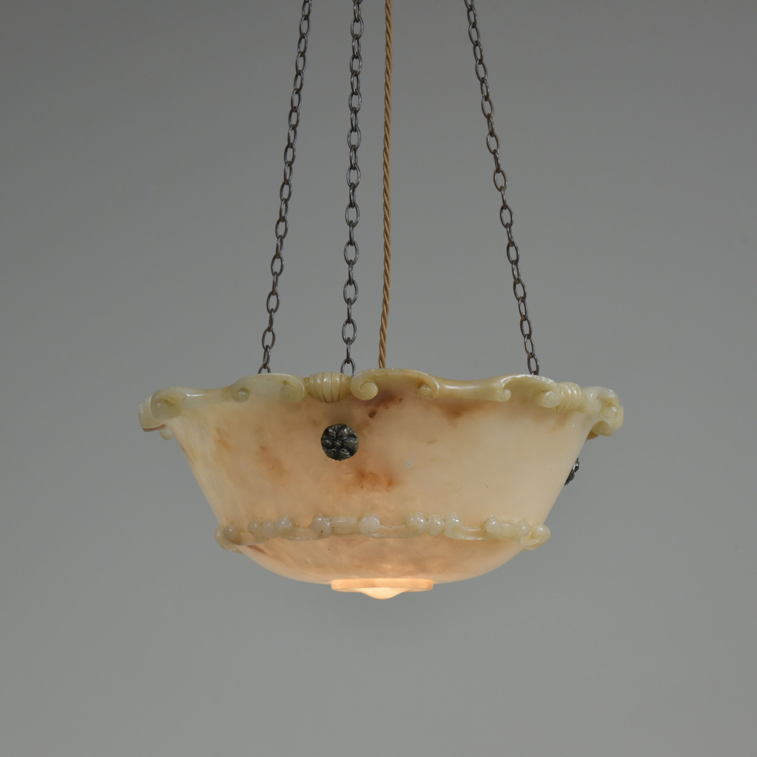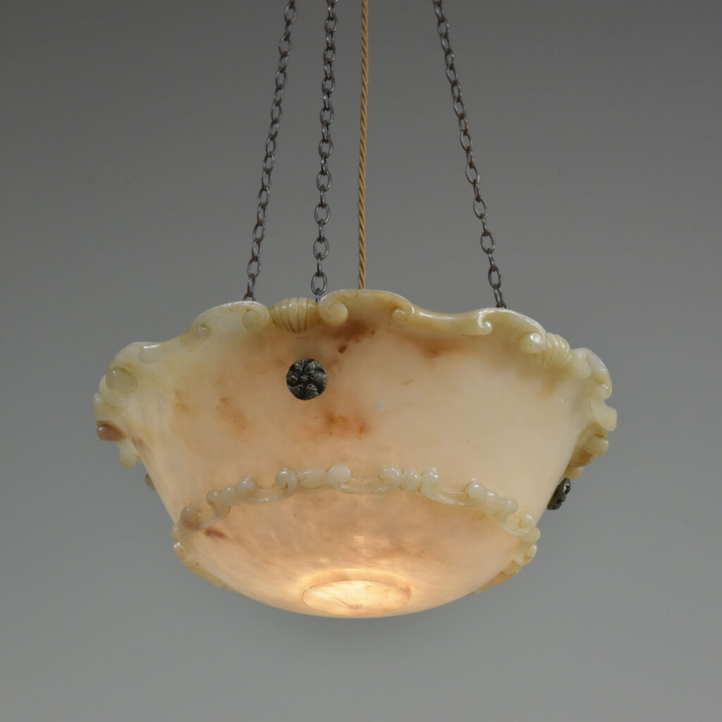 An antique alabaster bowl plafonnier with c scroll and shell decorative rim and band, floral rosette mounts and original quality brass chain. Excellent condition, lovely colour. English, early 20th century to 1920. Cleaned and waxed. Wired with 1.25m fabric flex, patinated brass cordgrip/BC lampholder. Supplied with patinated 3 hook ceiling plate (inc brass cable guide, earth, screws, cordgrip) and solid brass hanging chains (original). Dimensions in inches/cms; 14″/36cm diameter. 32″/80cm total drop (easily altered). Weight is 3.72kg. Click photos to enlarge…