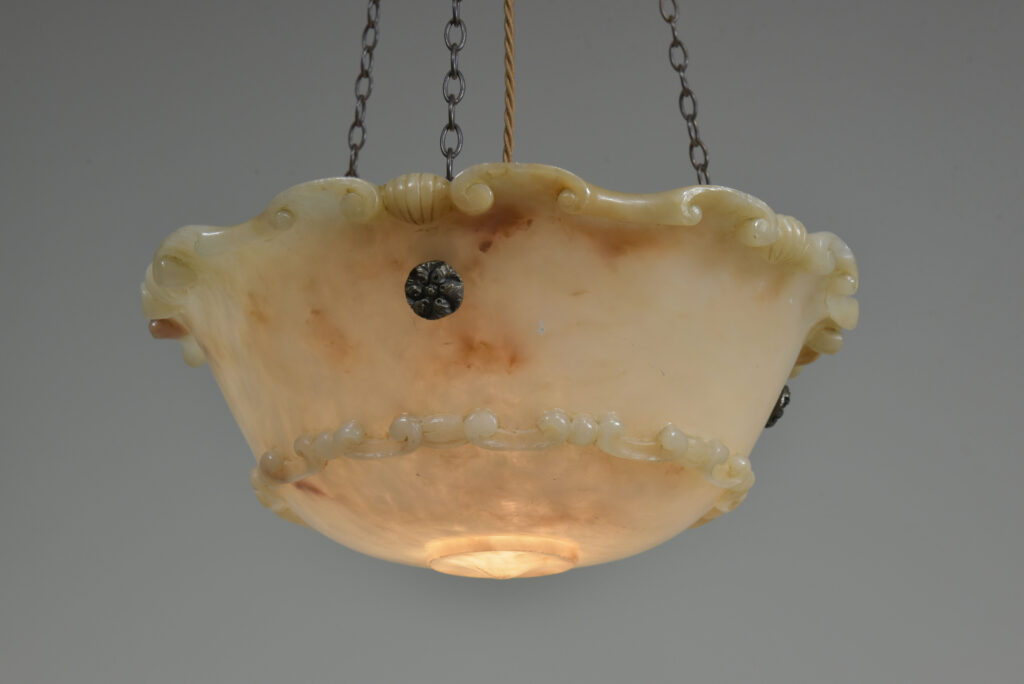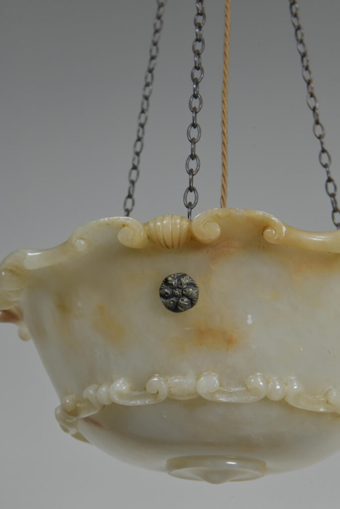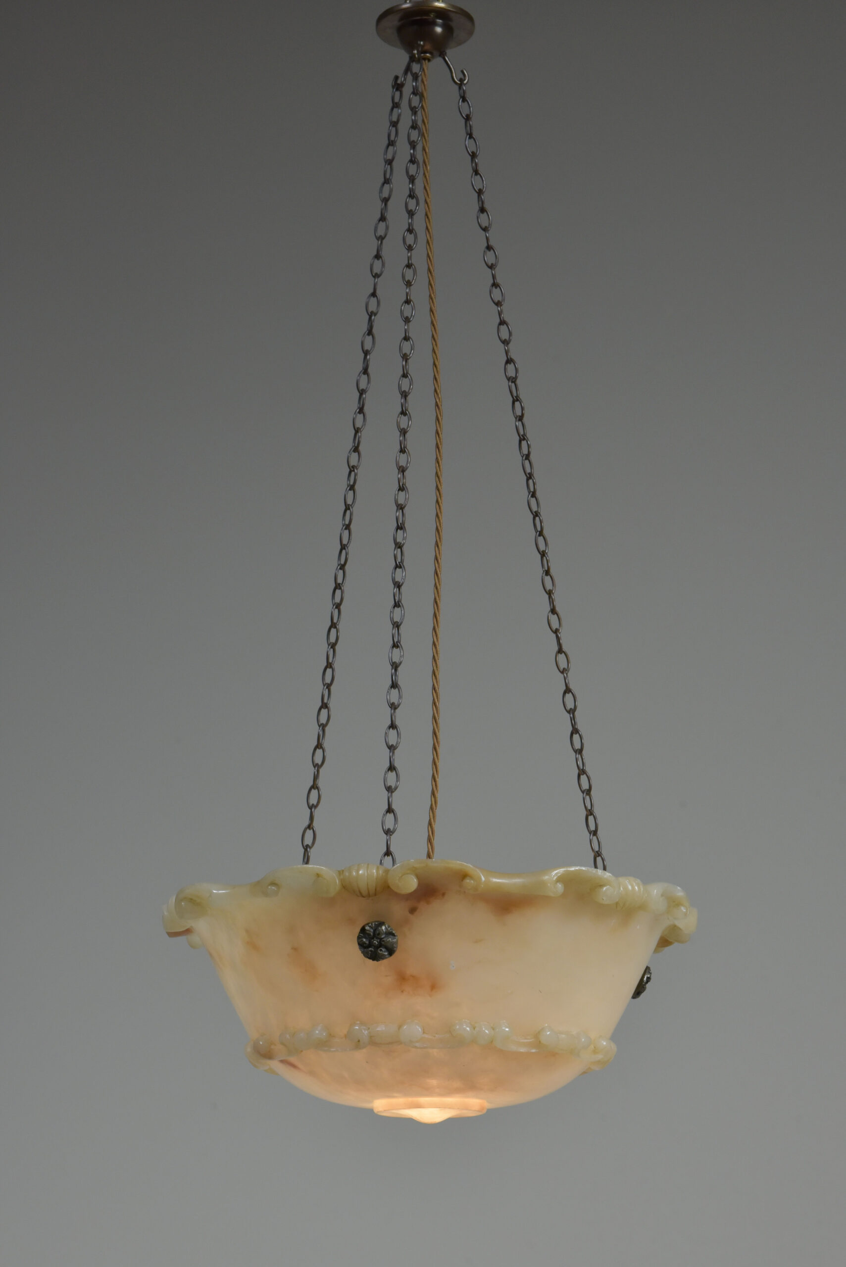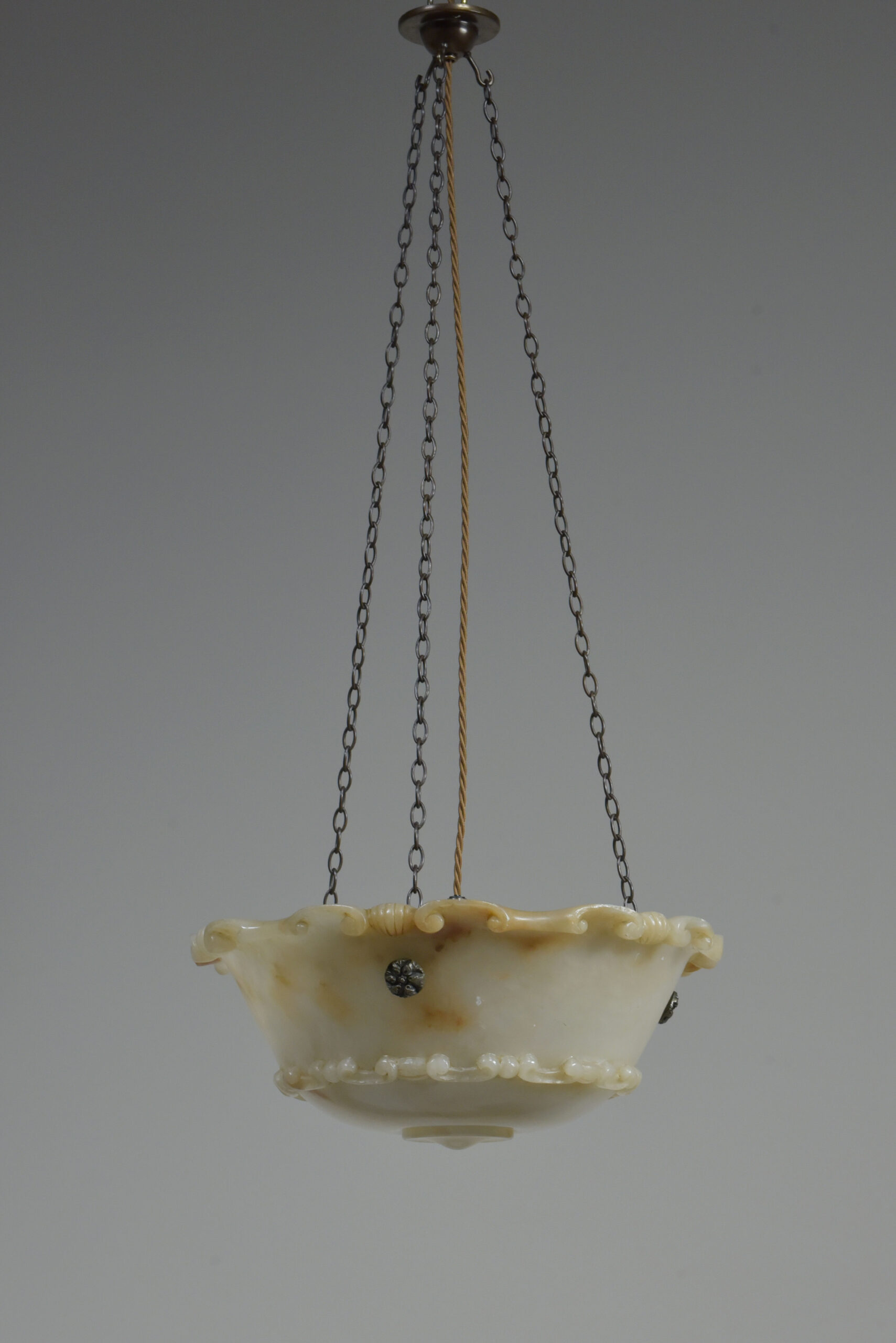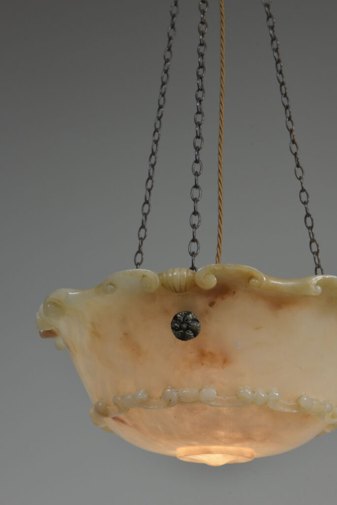 An antique alabaster bowl plafonnier with c scroll and shell decorative rim and band, floral rosette mounts and original quality brass chain. Excellent condition, lovely colour. English, early 20th century to 1920. Cleaned and waxed. Wired with 1.25m fabric flex, patinated brass cordgrip/BC lampholder. Supplied with patinated 3 hook ceiling plate (inc brass cable guide, earth, screws, cordgrip) and solid brass hanging chains (original). Dimensions in inches/cms; 14″/36cm diameter. 32″/80cm total drop (easily altered). Weight is 3.72kg. Click photos to enlarge…
