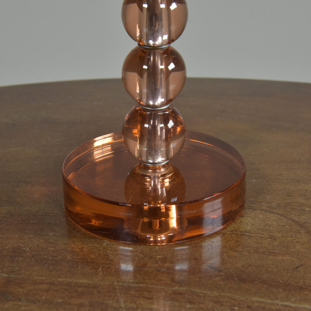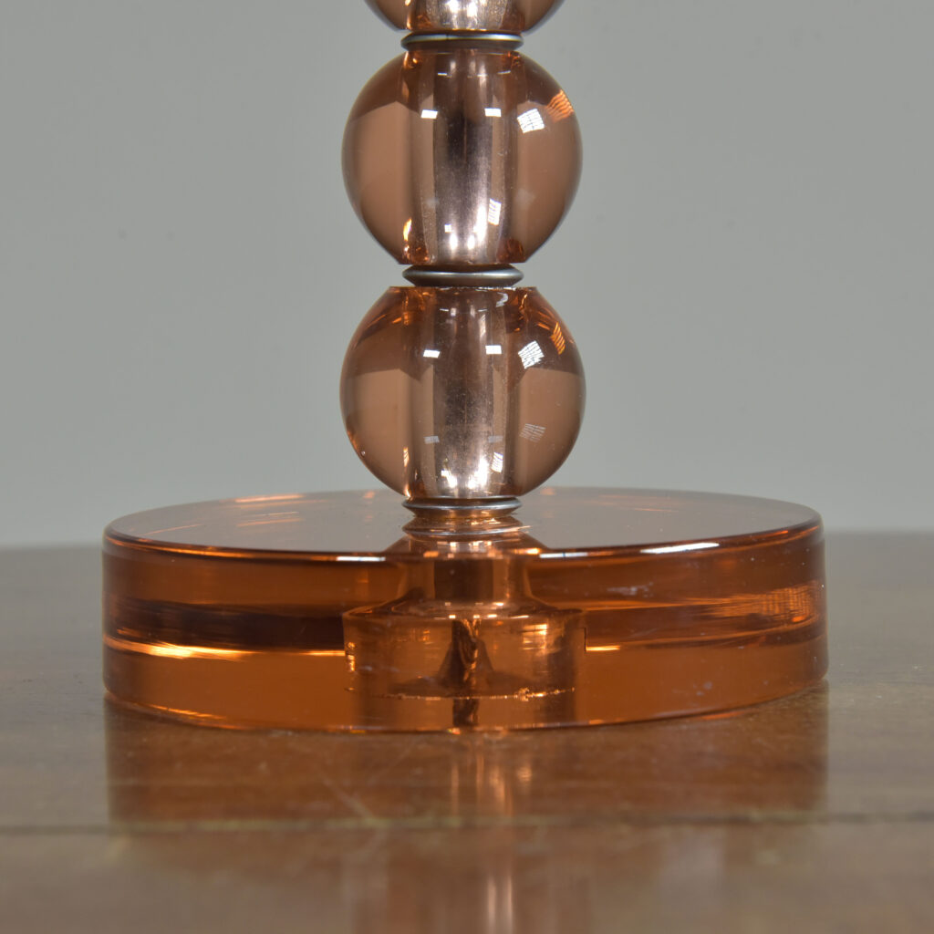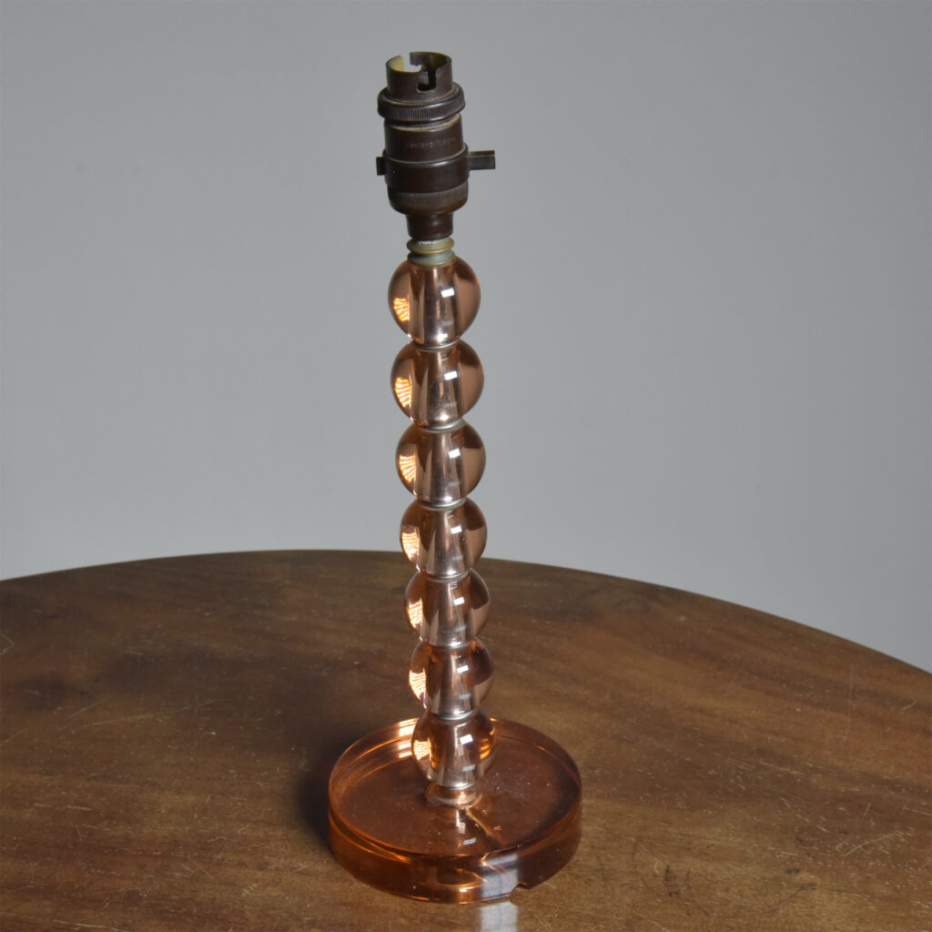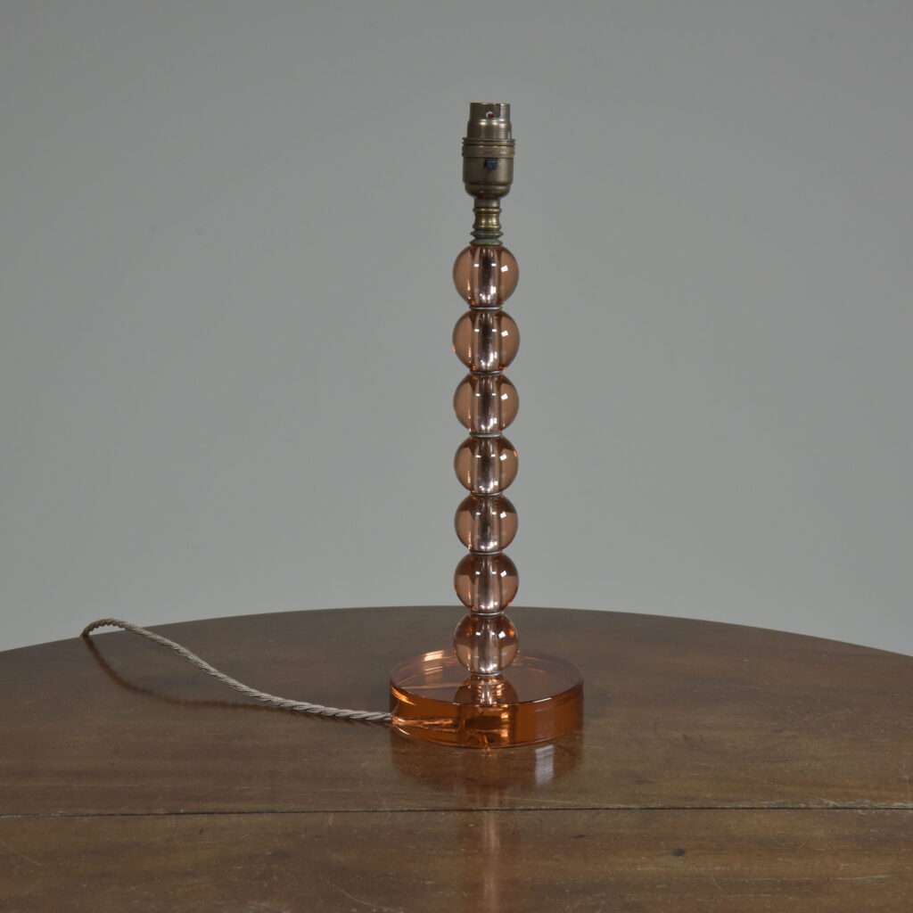An antique stacked glass ball table lamp with circular glass disc base and faded nickel plated brass fittings. c1920/30s. In a champagne / peach colour..? I have one or two more similar (same model) lamps. Very good quality and excellent conditon . Two images show original lampholder and wiring. Rewired with 2.5 meters of fabric flex, a new patinated brass switched lampholder and a traditional style hard plastic plug. Pat tested. Dimensions in inches/cms; 14.5″/37cm tall inc lampholder. 4.625″/12cm base diameter. Weight is 1.44kg. Click photos to enlarge…