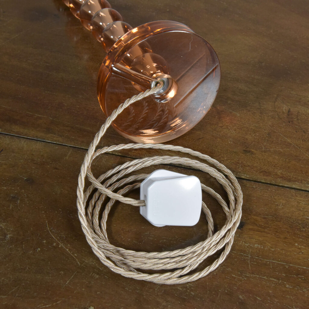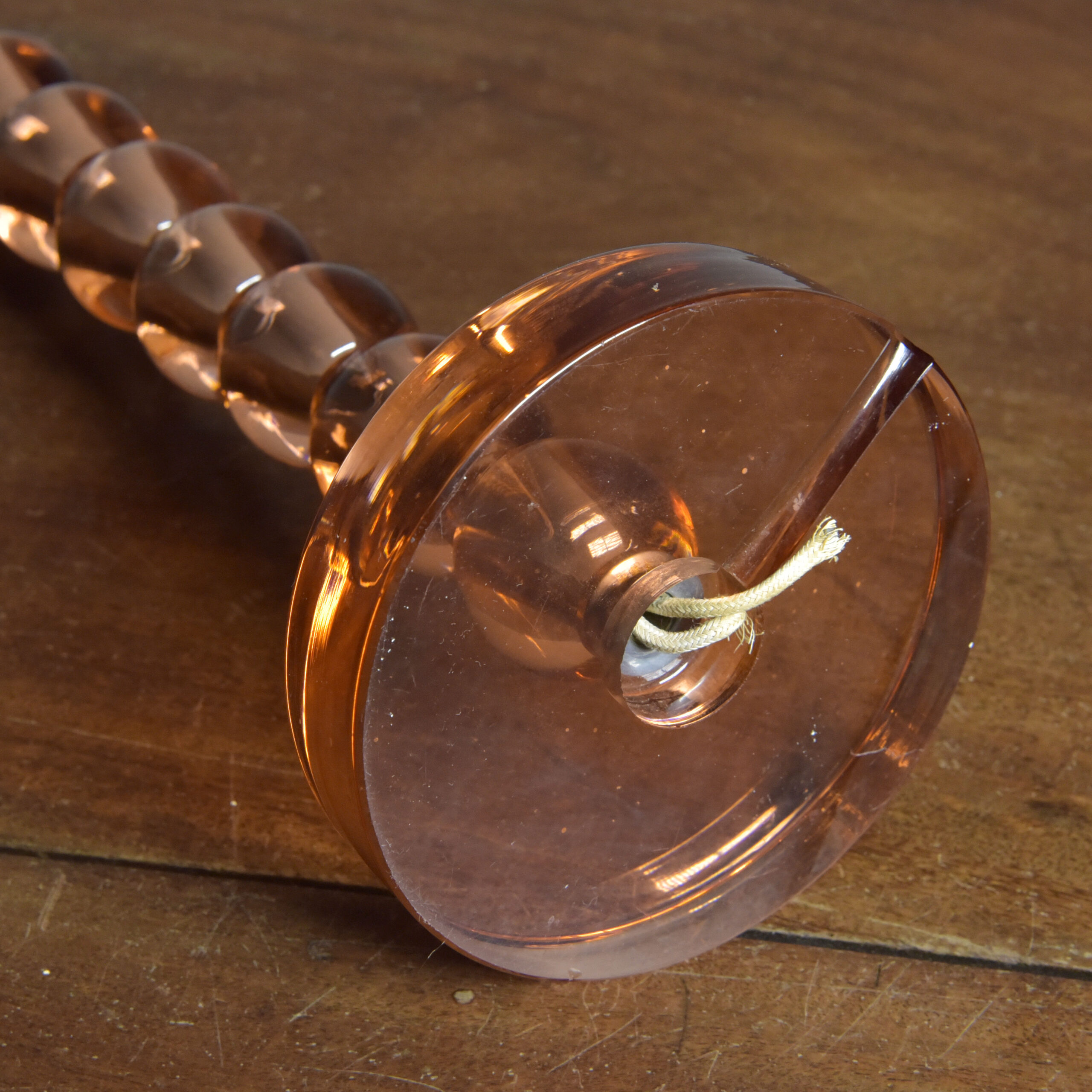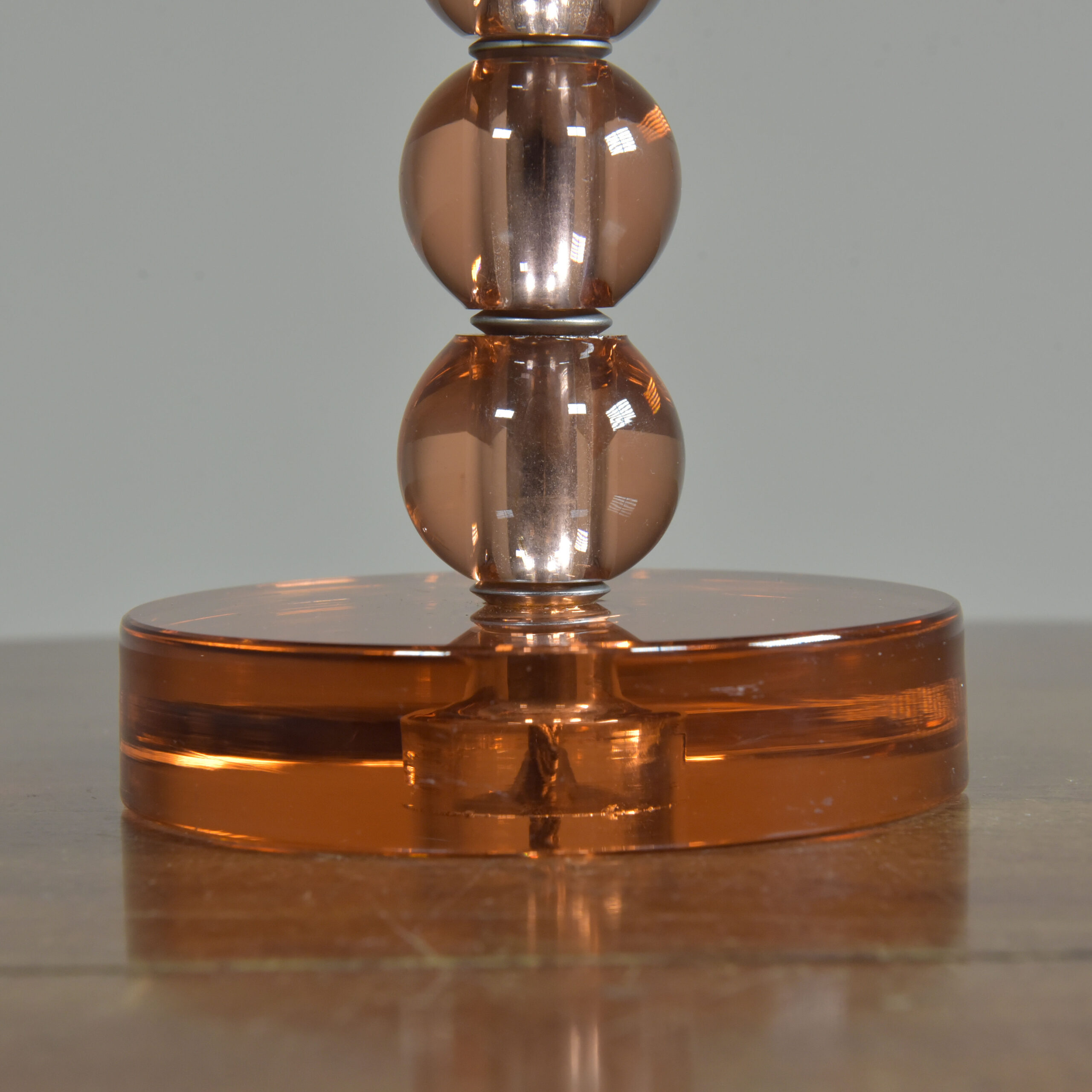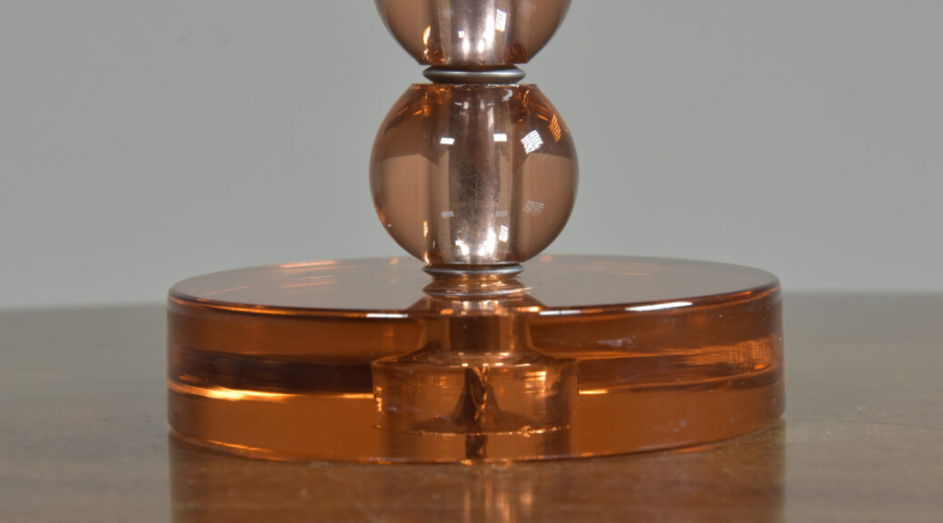 An antique stacked glass ball table lamp with circular glass disc base and faded nickel plated brass fittings. c1920/30s. In a champagne / peach colour..? I have one or two more similar (same model) lamps. Very good quality and excellent conditon . Two images show original lampholder and wiring. Rewired with 2.5 meters of fabric flex, a new patinated brass switched lampholder and a traditional style hard plastic plug. Pat tested. Dimensions in inches/cms; 14.5″/37cm tall inc lampholder. 4.625″/12cm base diameter. Weight is 1.44kg. Click photos to enlarge…