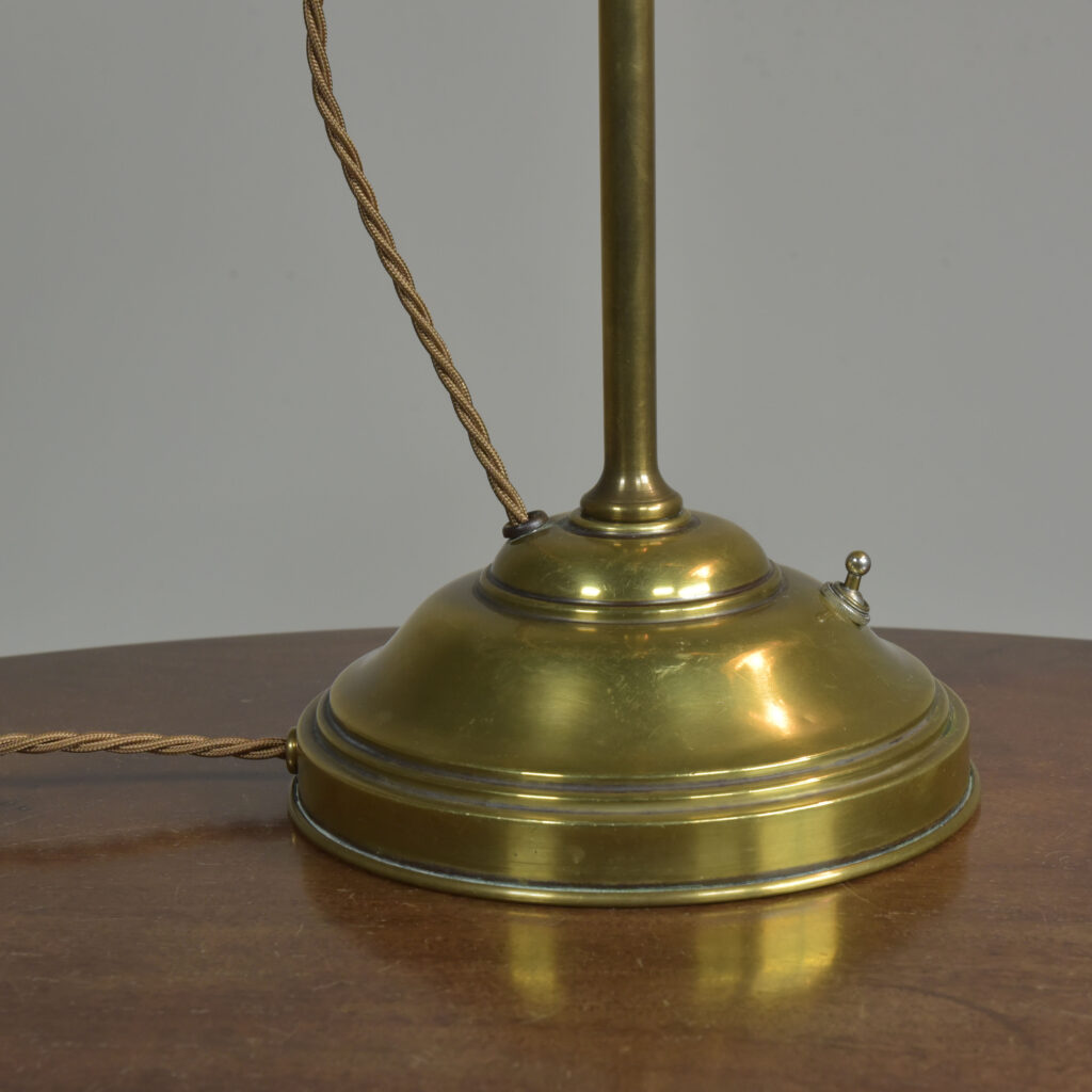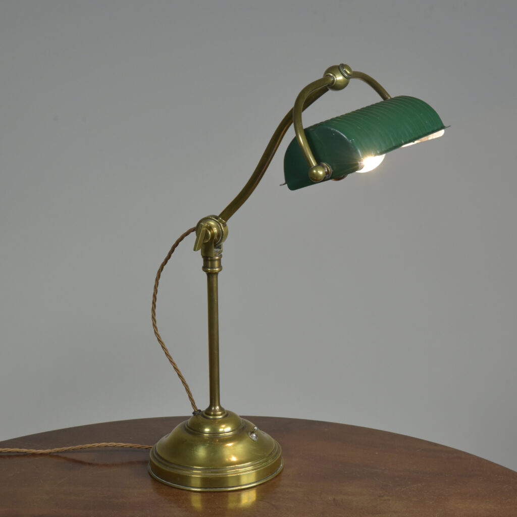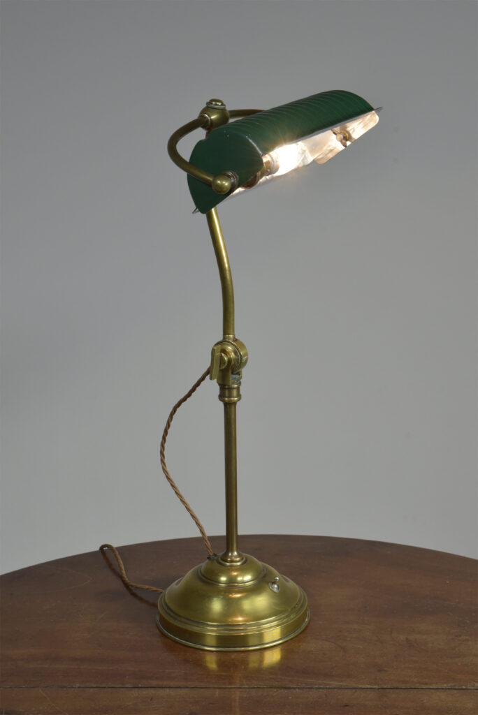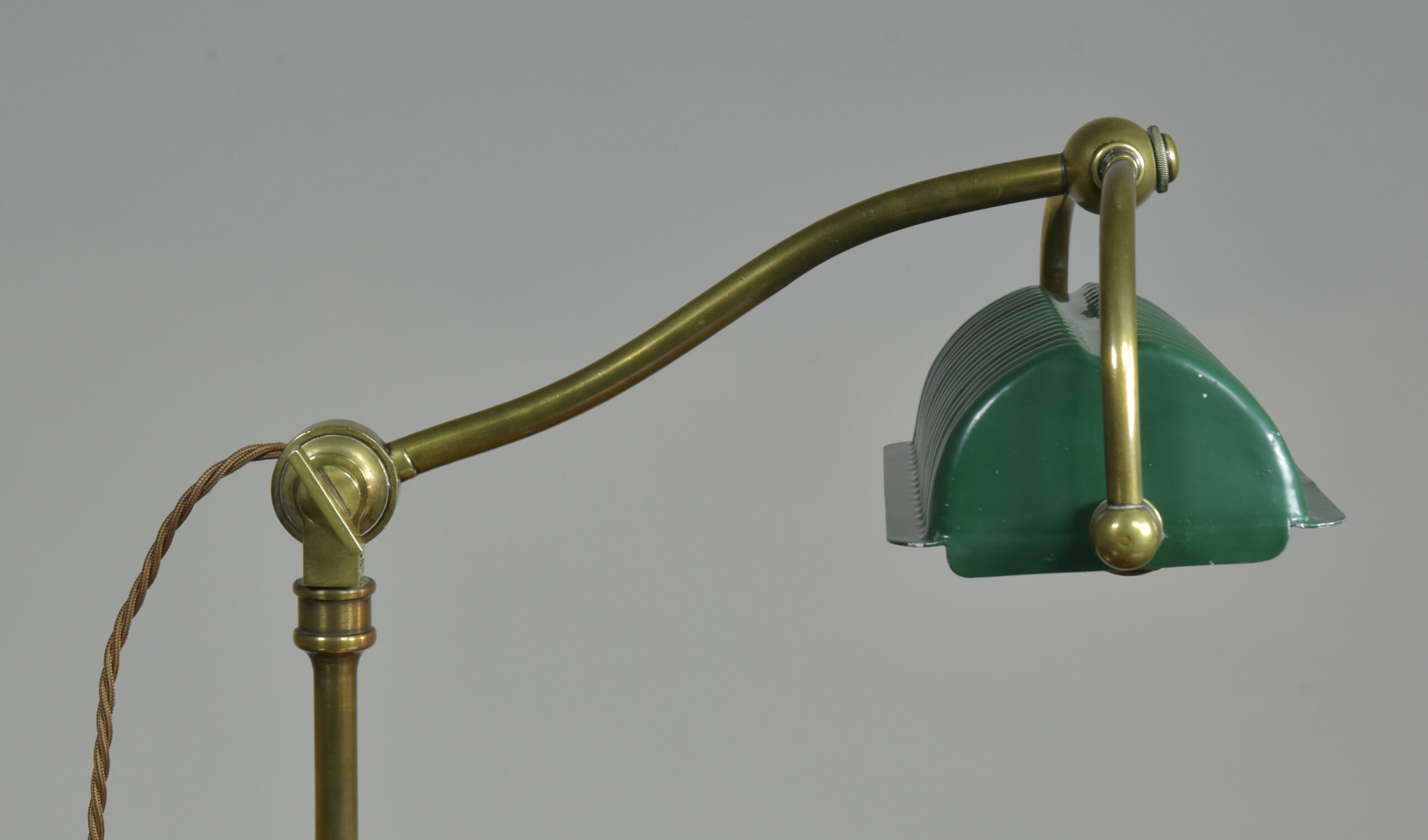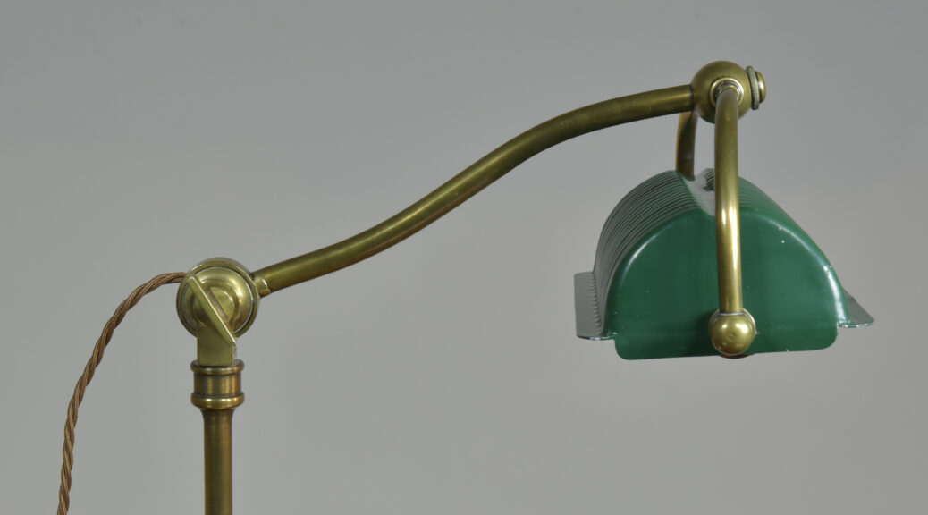 A tall antique adjustable bankers lamp. English 1930s. Very good condition and quality (eg. main stem is solid turned brass, not tube). Good overall dulled brass colour. Complete. Knuckle joint works very well so shade arm adjusts well and securely. Taken apart, shade cleaned and polished, weighted cast iron base part cleaned and waxed, new patinated brass guide, original switch used. Fully rewired with 3.5 m fabric flex (2.5m exposed), new patinated brass BC lampholder, 3amp plug. New fabric base. PAT tested. Dimensions in inches/cms; 23″/58.5cm max height (straight up). 13″/33cm tall to knuckle joint. 7″/18cm base diameter. 3.8kg. Click photos to enlarge…