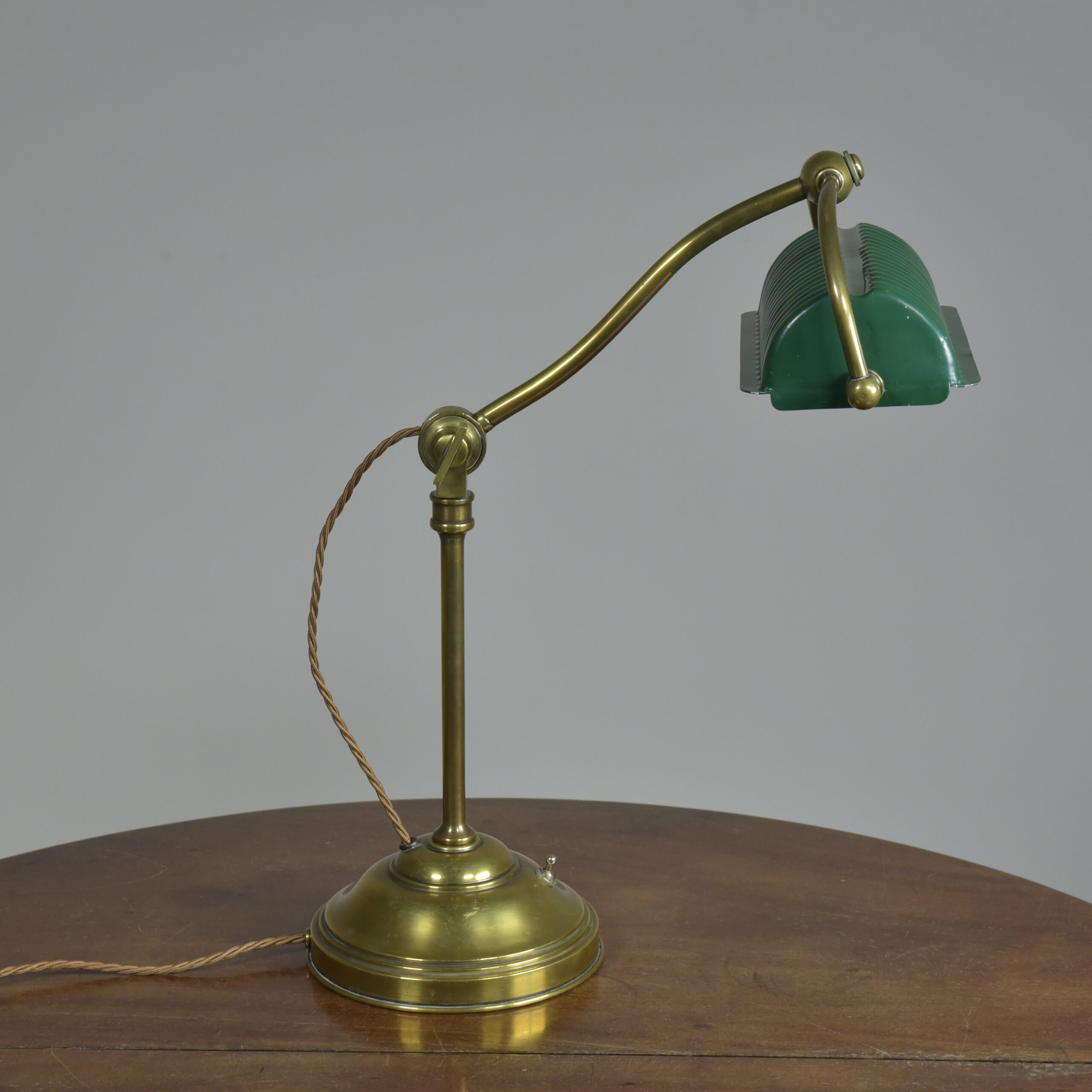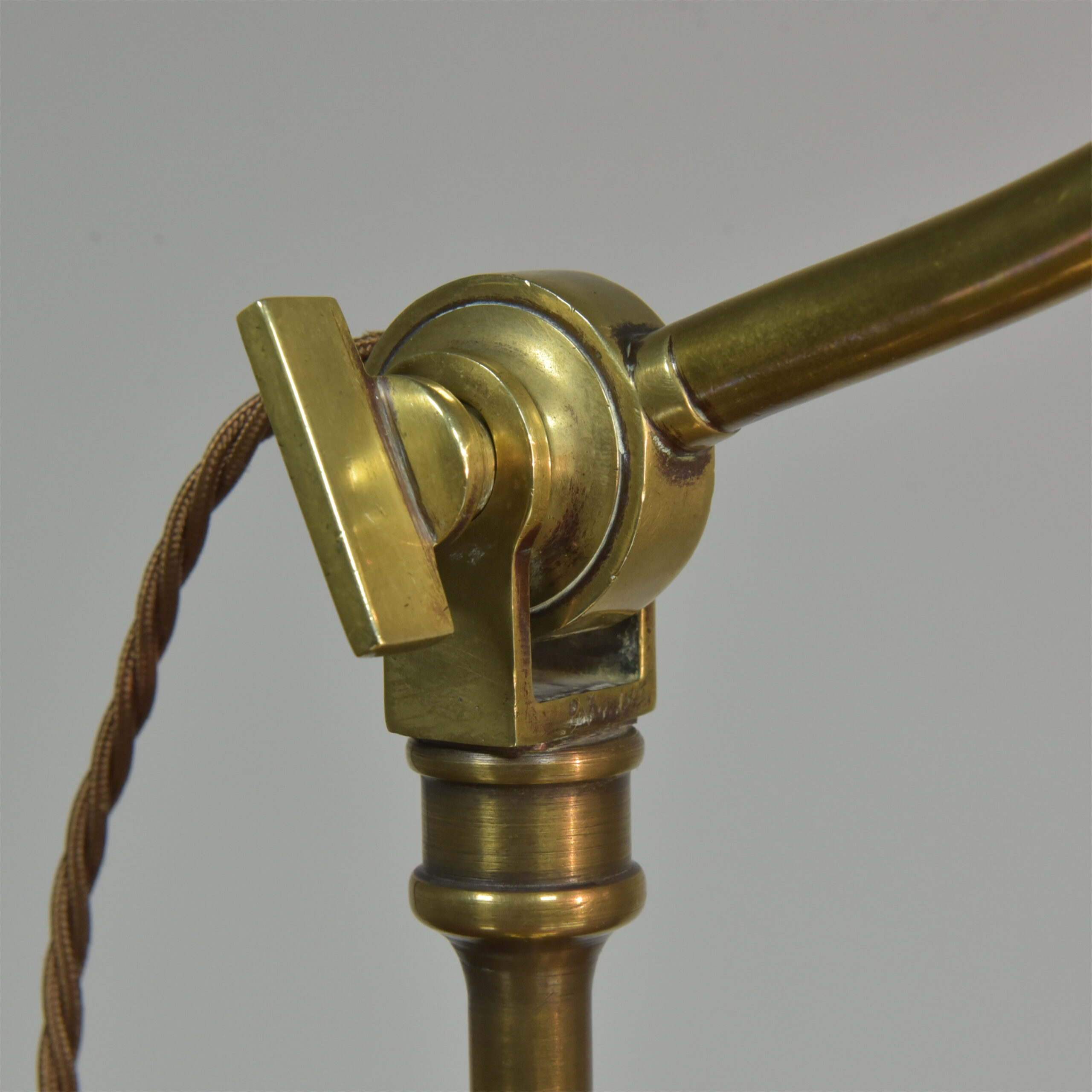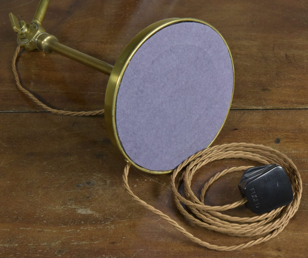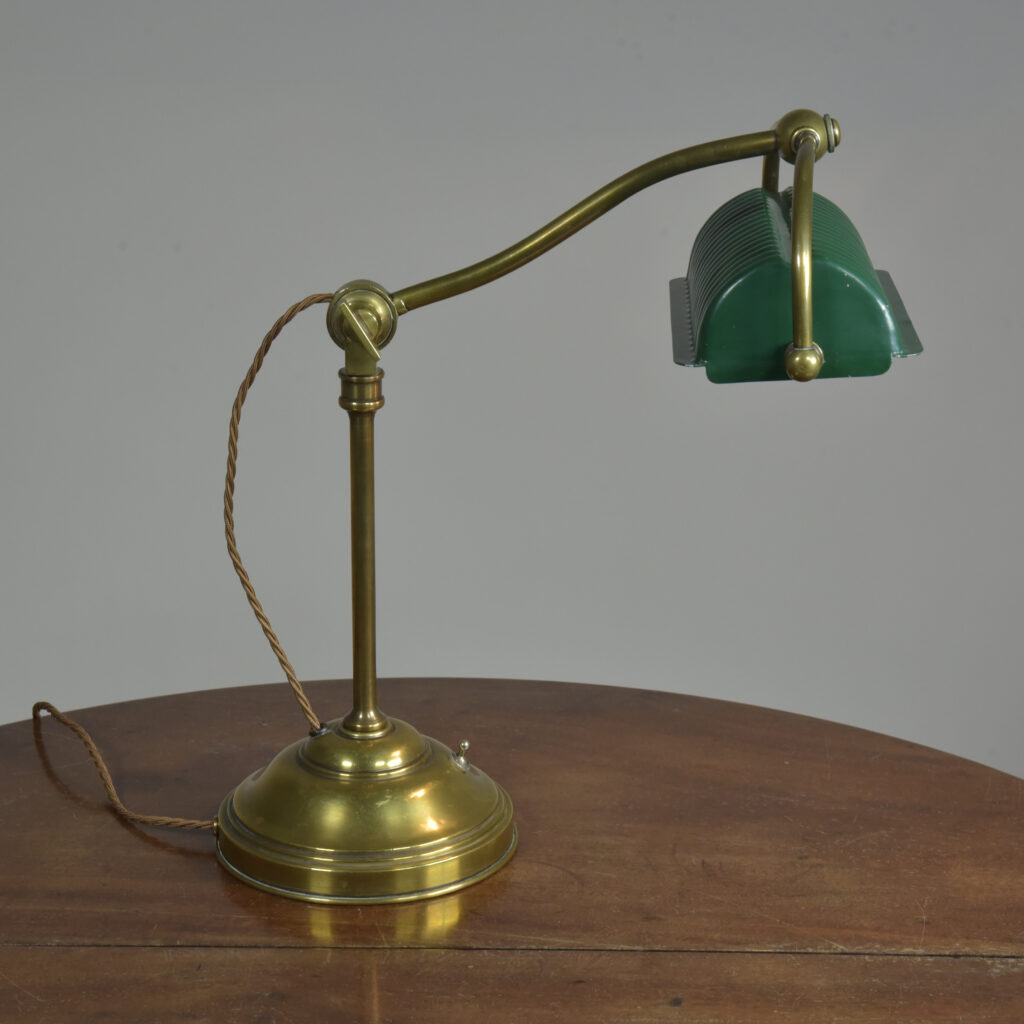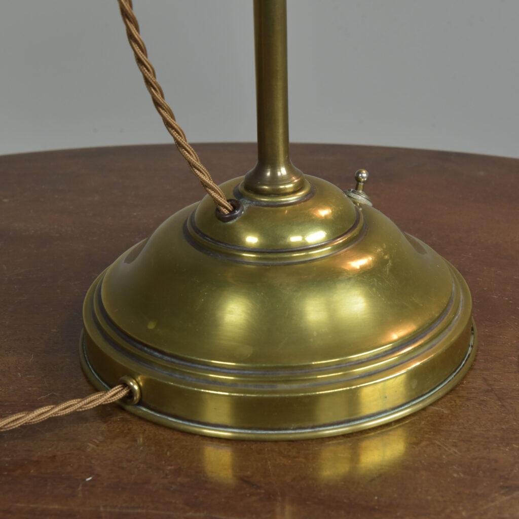 A tall antique adjustable bankers lamp. English 1930s. Very good condition and quality (eg. main stem is solid turned brass, not tube). Good overall dulled brass colour. Complete. Knuckle joint works very well so shade arm adjusts well and securely. Taken apart, shade cleaned and polished, weighted cast iron base part cleaned and waxed, new patinated brass guide, original switch used. Fully rewired with 3.5 m fabric flex (2.5m exposed), new patinated brass BC lampholder, 3amp plug. New fabric base. PAT tested. Dimensions in inches/cms; 23″/58.5cm max height (straight up). 13″/33cm tall to knuckle joint. 7″/18cm base diameter. 3.8kg. Click photos to enlarge…