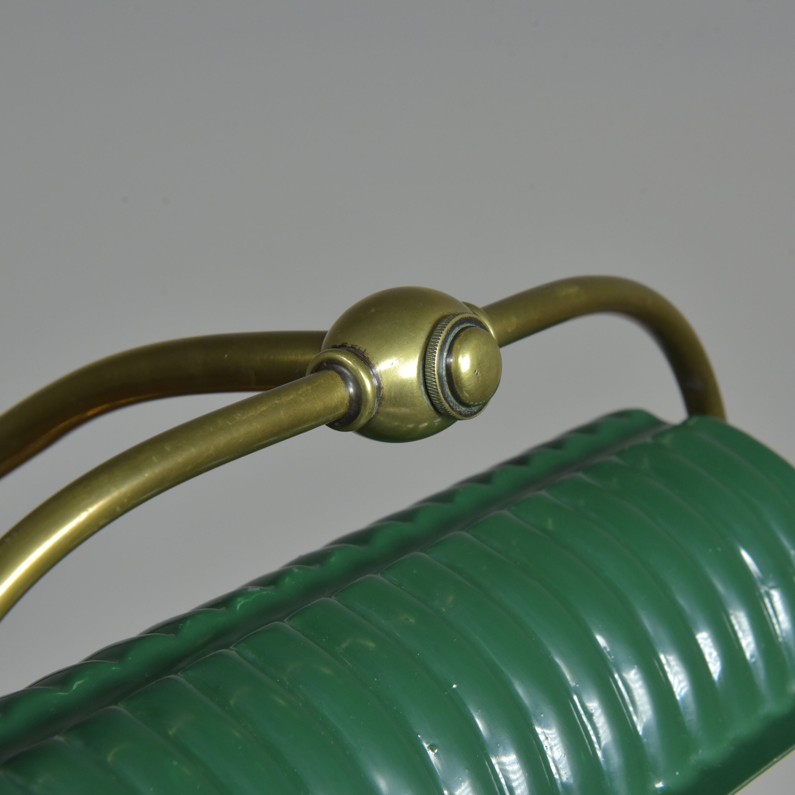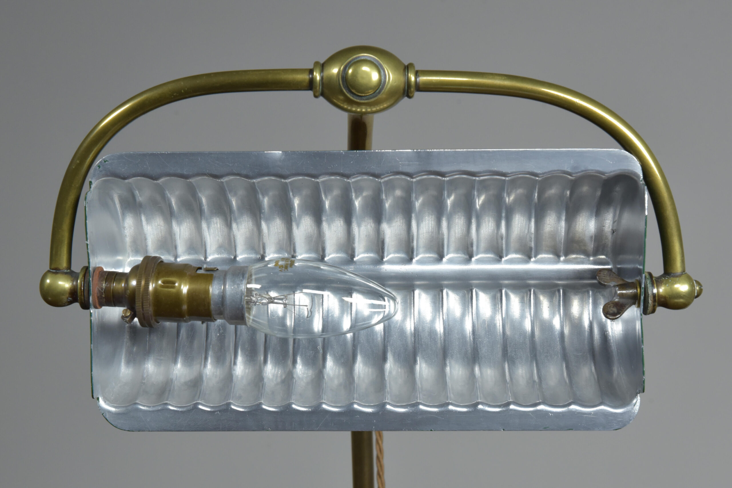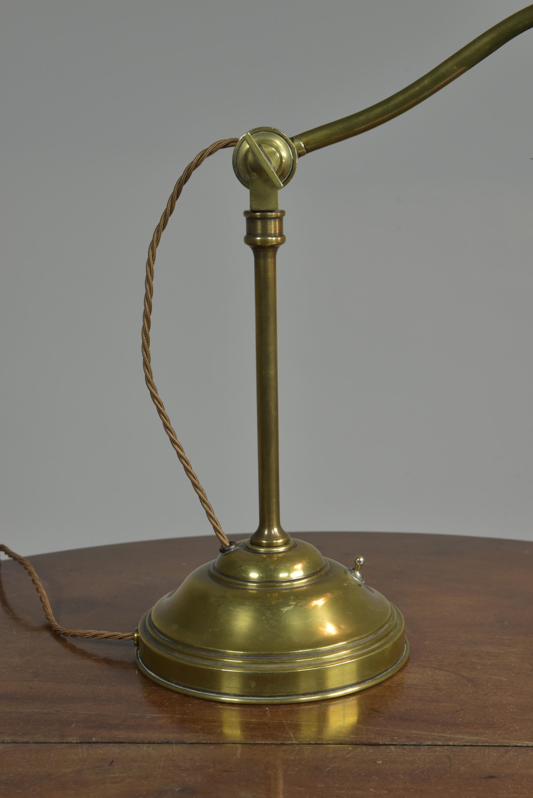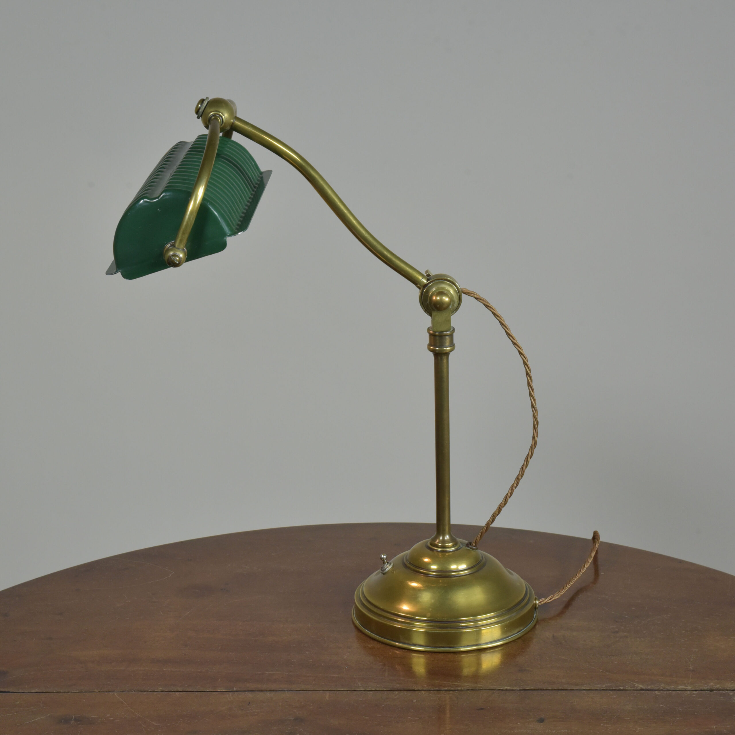 A tall antique adjustable bankers lamp. English 1930s. Very good condition and quality (eg. main stem is solid turned brass, not tube). Good overall dulled brass colour. Complete. Knuckle joint works very well so shade arm adjusts well and securely. Taken apart, shade cleaned and polished, weighted cast iron base part cleaned and waxed, new patinated brass guide, original switch used. Fully rewired with 3.5 m fabric flex (2.5m exposed), new patinated brass BC lampholder, 3amp plug. New fabric base. PAT tested. Dimensions in inches/cms; 23″/58.5cm max height (straight up). 13″/33cm tall to knuckle joint. 7″/18cm base diameter. 3.8kg. Click photos to enlarge…