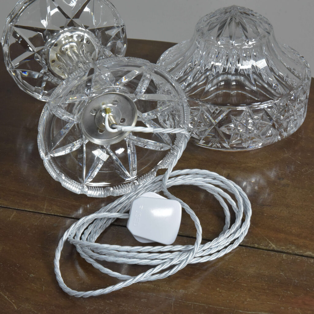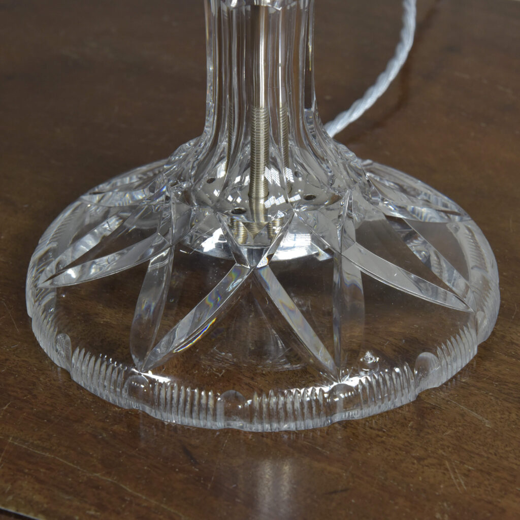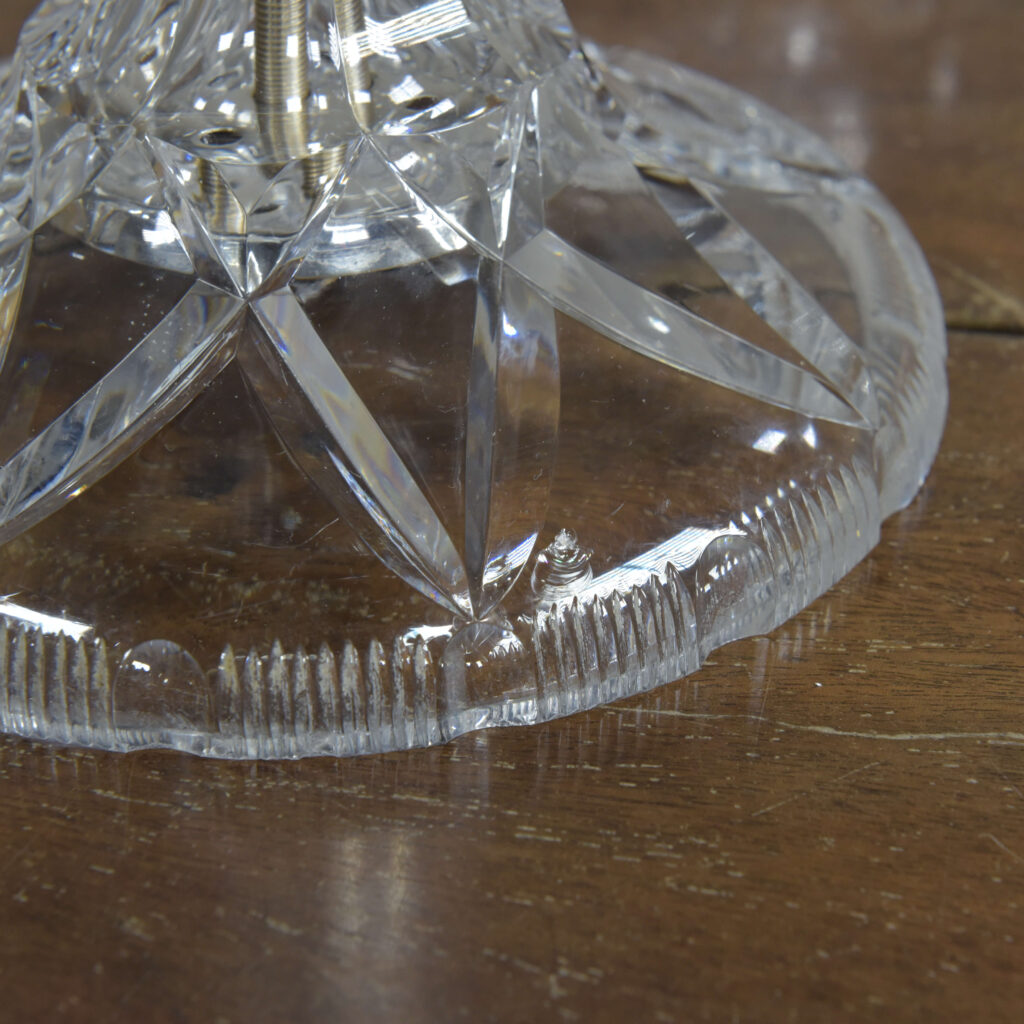 An antique cut glass lamp with “goblet” base. Cleaned, silver plated fittings polished. Wired with 3m fabric flex, original silver plated lampholder, 3amp plug. Pat tested. Small chip to inside base and small sliver to base (see closeup images). Dimensions in inches/cms; 14.5/37cm cm tall. 7″/18cm diameter – shade. 3kg weight. Click photos to enlarge…