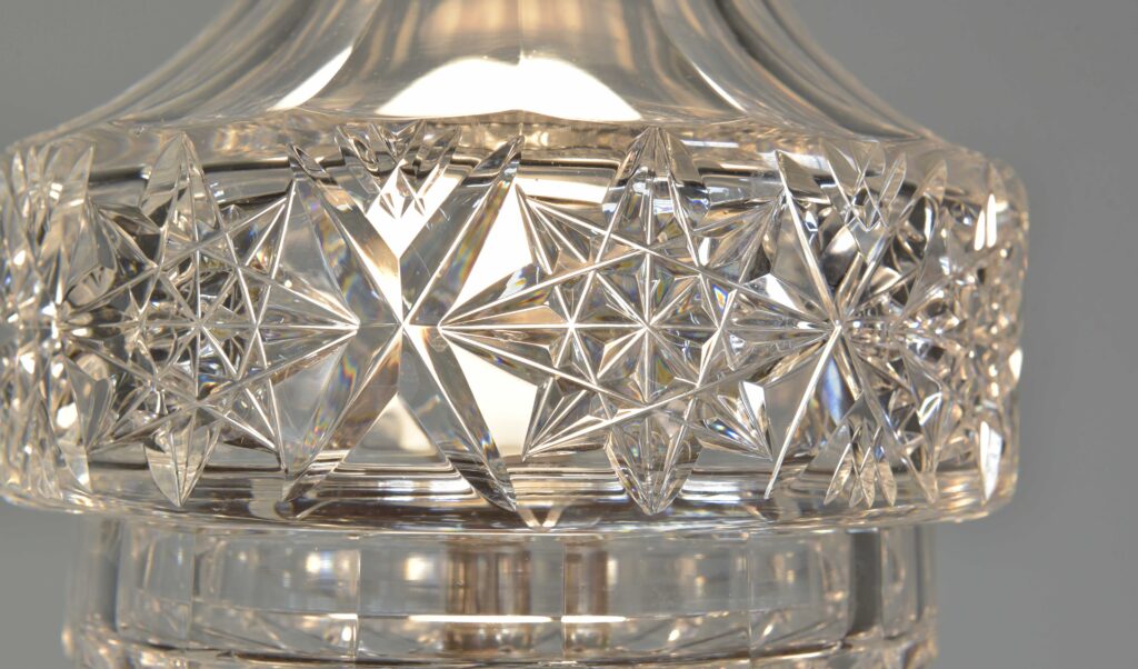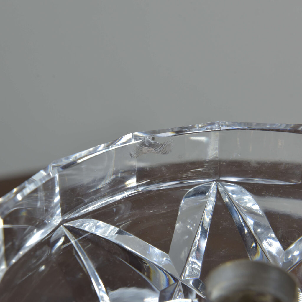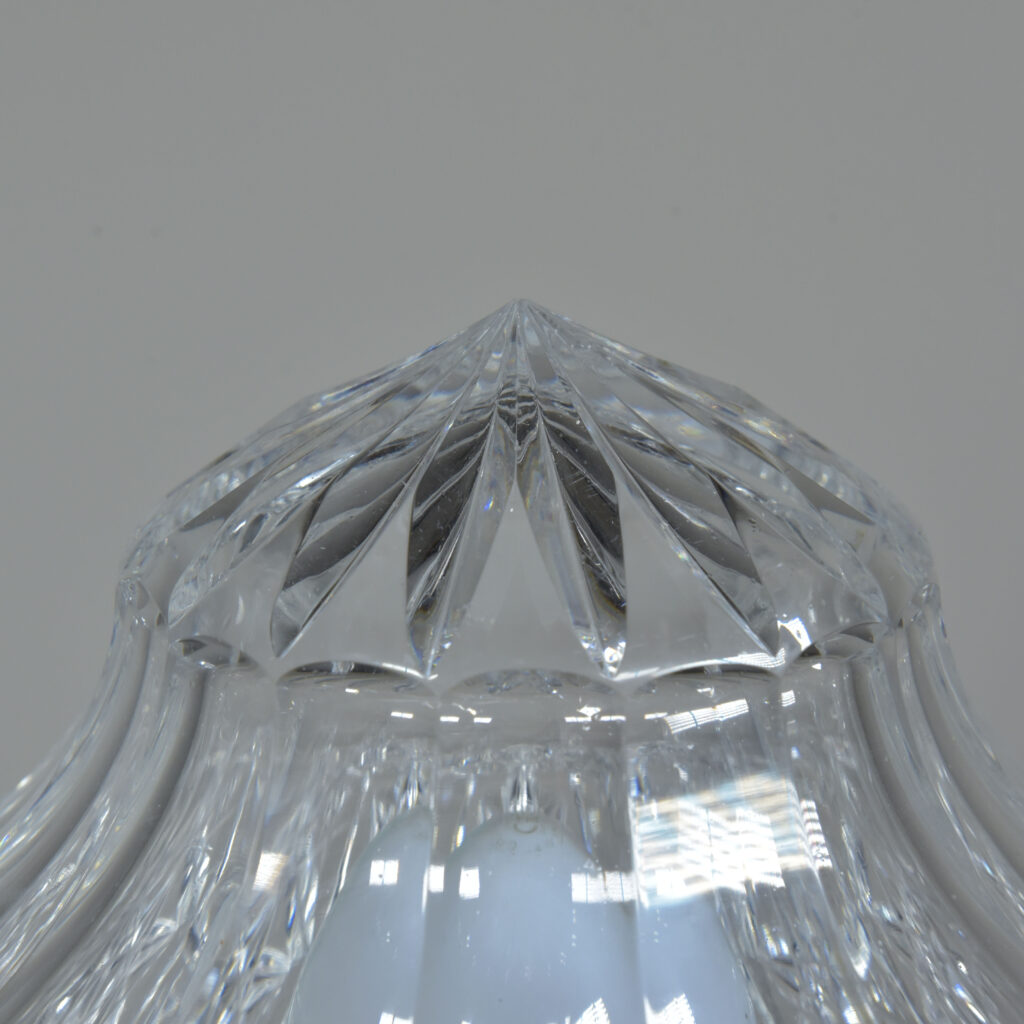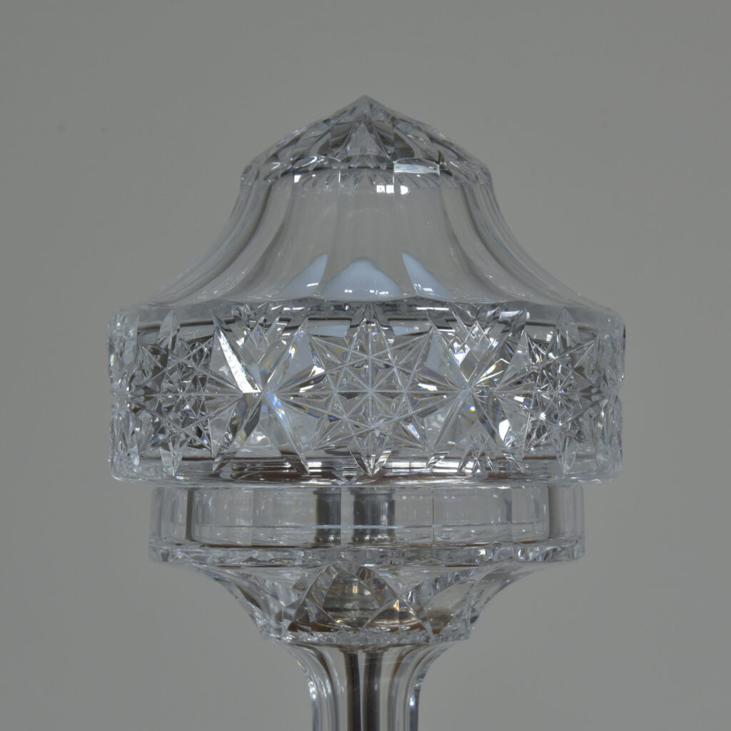 An antique cut glass lamp with “goblet” base. Cleaned, silver plated fittings polished. Wired with 3m fabric flex, original silver plated lampholder, 3amp plug. Pat tested. Small chip to inside base and small sliver to base (see closeup images). Dimensions in inches/cms; 14.5/37cm cm tall. 7″/18cm diameter – shade. 3kg weight. Click photos to enlarge…