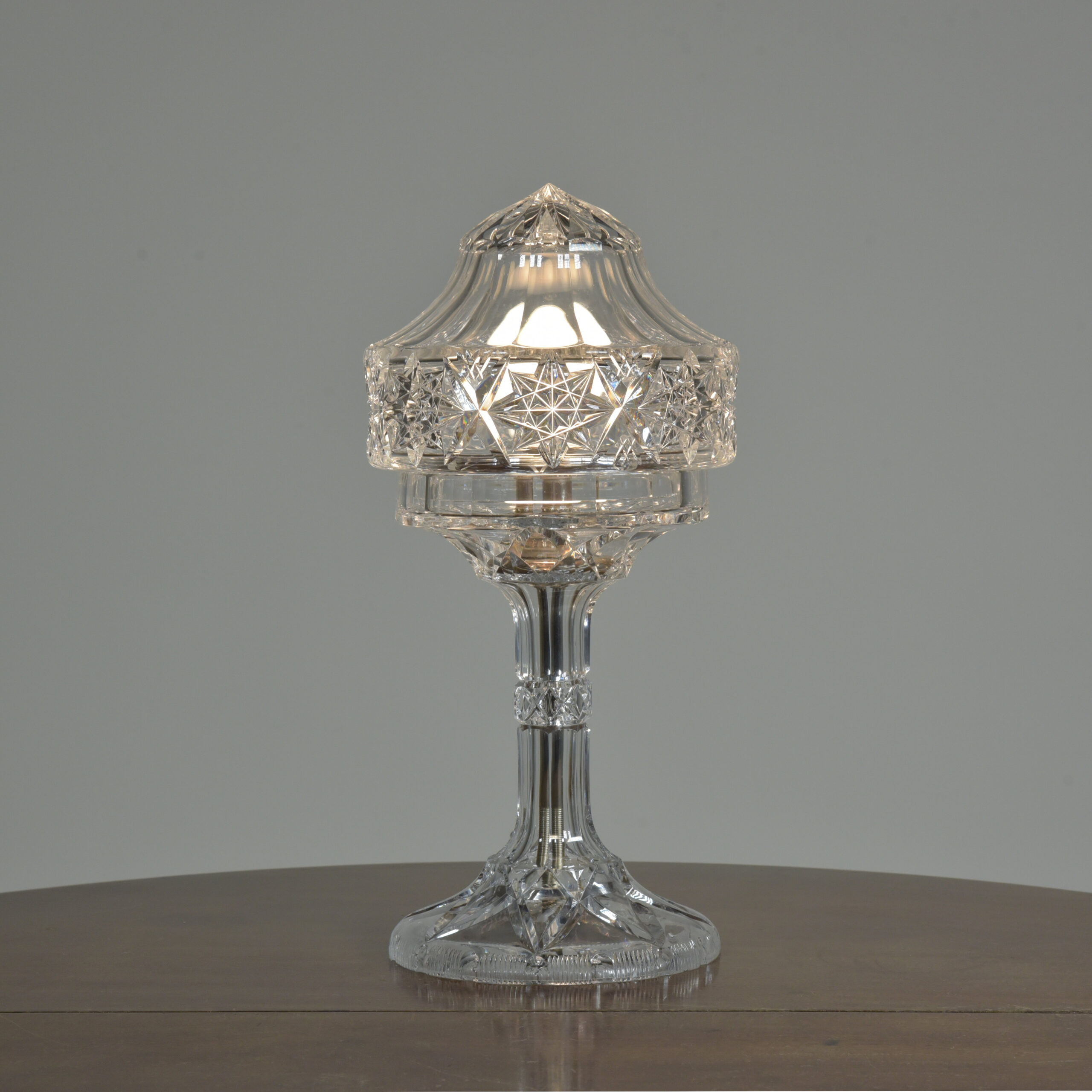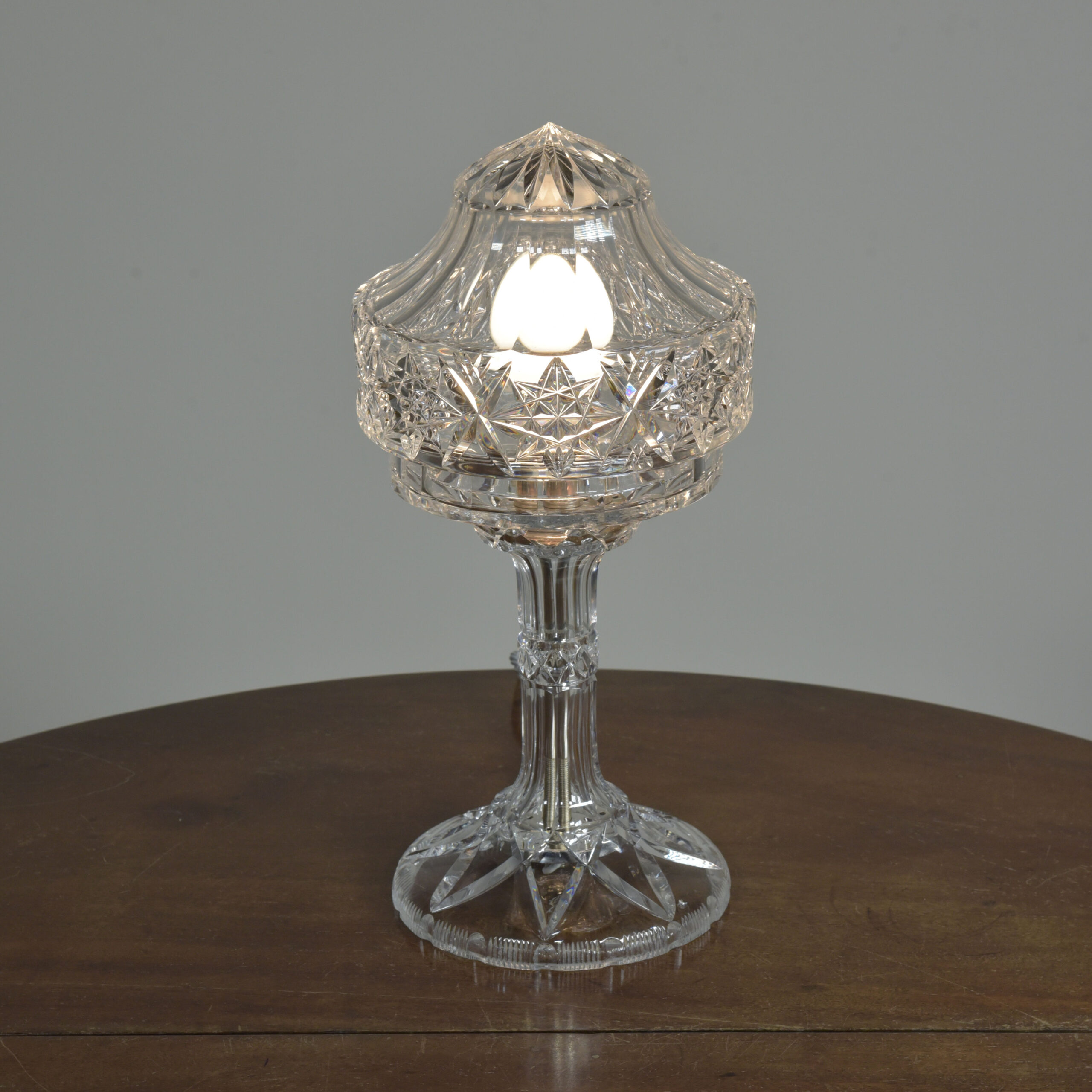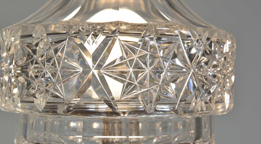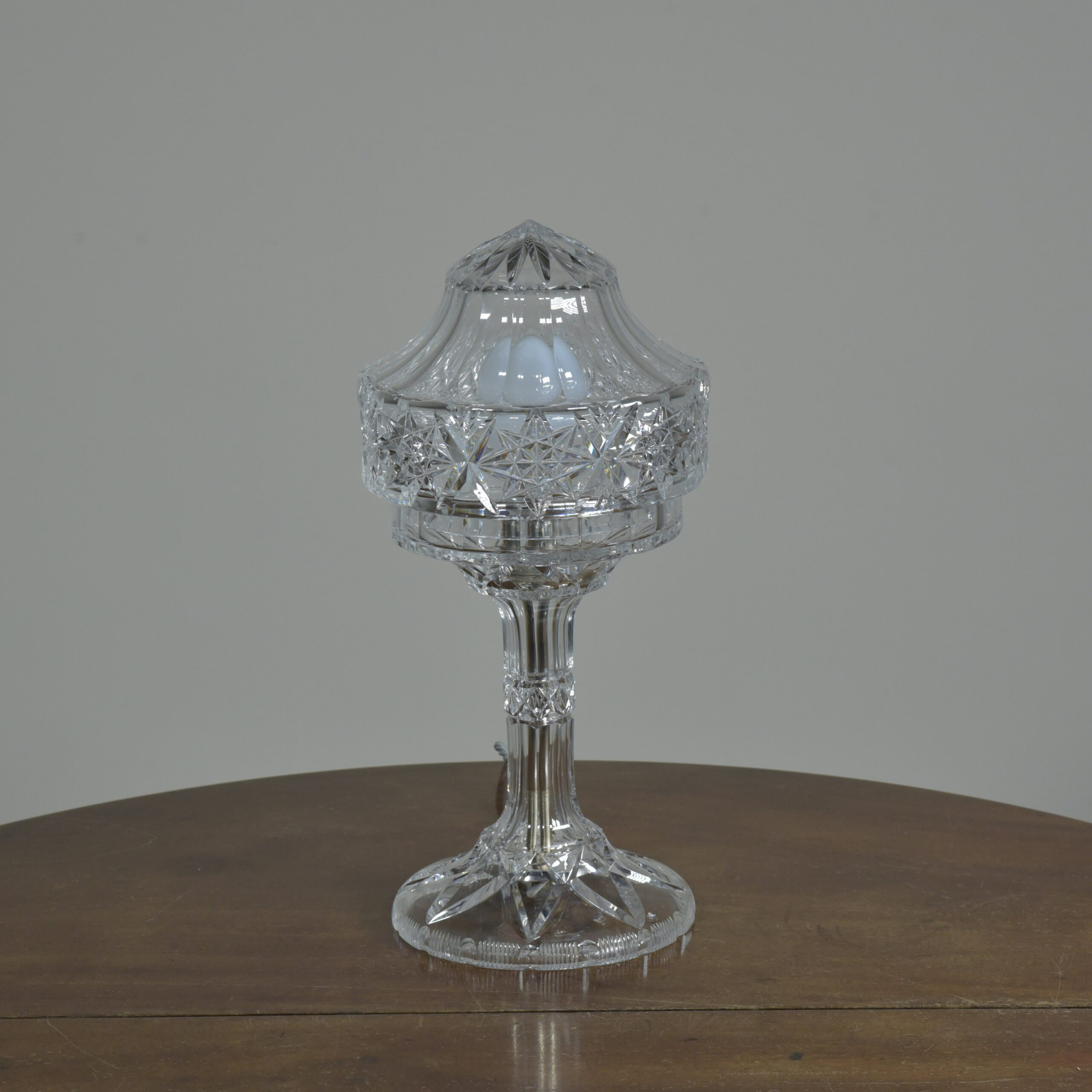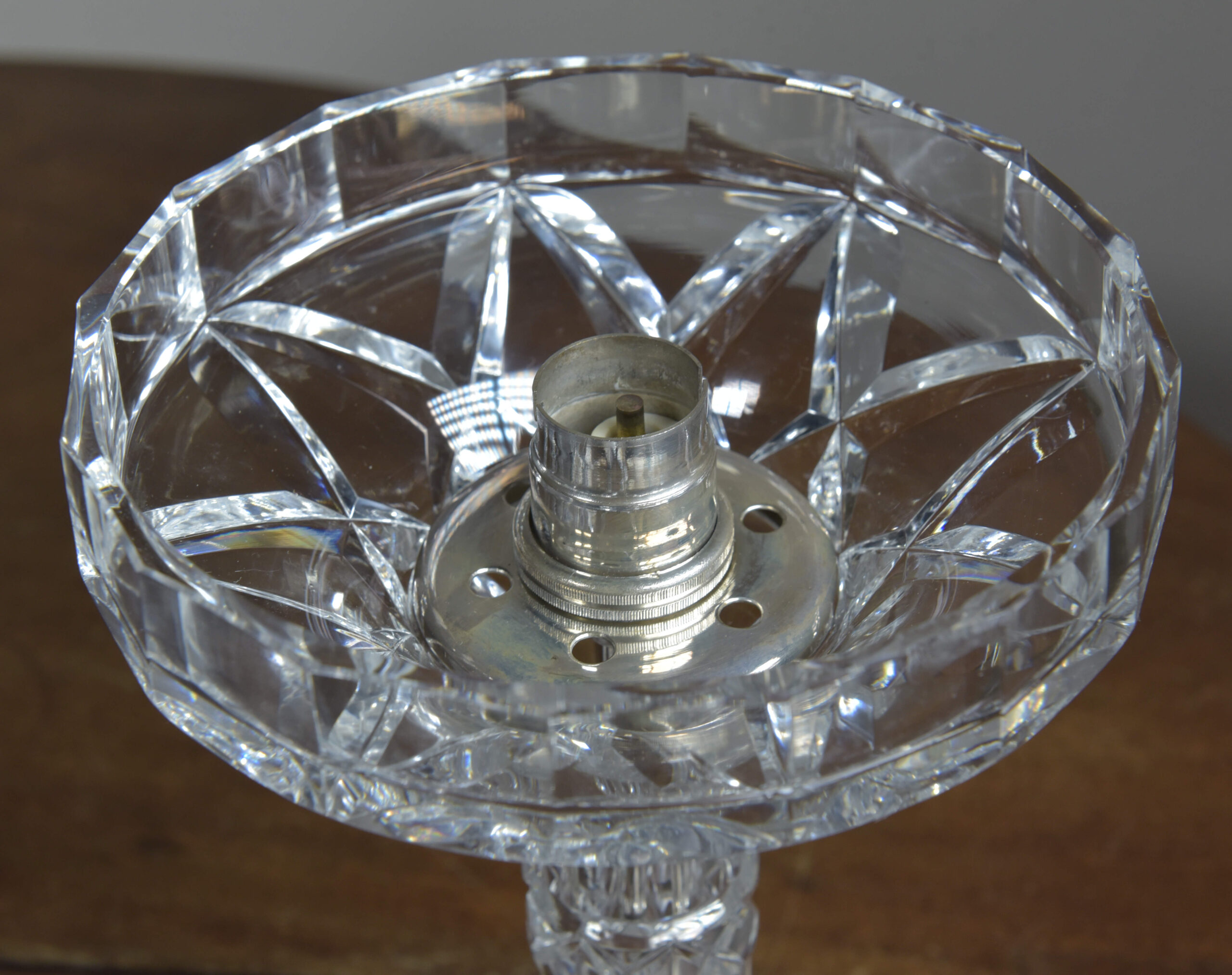 An antique cut glass lamp with “goblet” base. Cleaned, silver plated fittings polished. Wired with 3m fabric flex, original silver plated lampholder, 3amp plug. Pat tested. Small chip to inside base and small sliver to base (see closeup images). Dimensions in inches/cms; 14.5/37cm cm tall. 7″/18cm diameter – shade. 3kg weight. Click photos to enlarge…